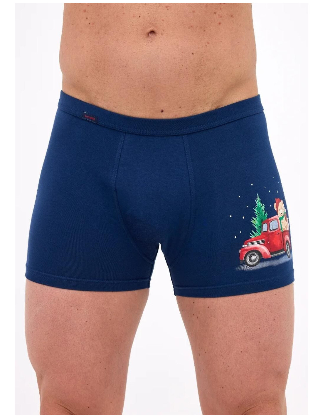 CornetteVyriški aptempti boksininko šortai - tamsiai mėlynos spalvos su meškiuku, važiuojančiu automobiliu su Kalėdų eglute - šventiška atmosfera geriausiu stiliumi - tamsiai mėlynos spalvos vyriški aptempti boksininko šortai, papuošti juokingu meškiuko, važiuojančio raudonu automobiliu su Kalėdų eglute ant stogo, piešiniu - žavus ir šmaikštus dizainas, kuris iš pirmo žvilgsnio sukuria šventinę nuotaiką.bokseriai pagaminti iš aukštos kokybės medvilnės su elastano priedu, todėl yra minkšti ir elastingi, kad būtų maksimaliai patogūs, o elastinga juosmens juosta užtikrina, kad jie puikiai priglus, nespausdami - puikus pasirinkimas kasdieniam dėvėjimui ir puiki kalėdinės dovanos idėja humoro jausmą turinčiam vyrui