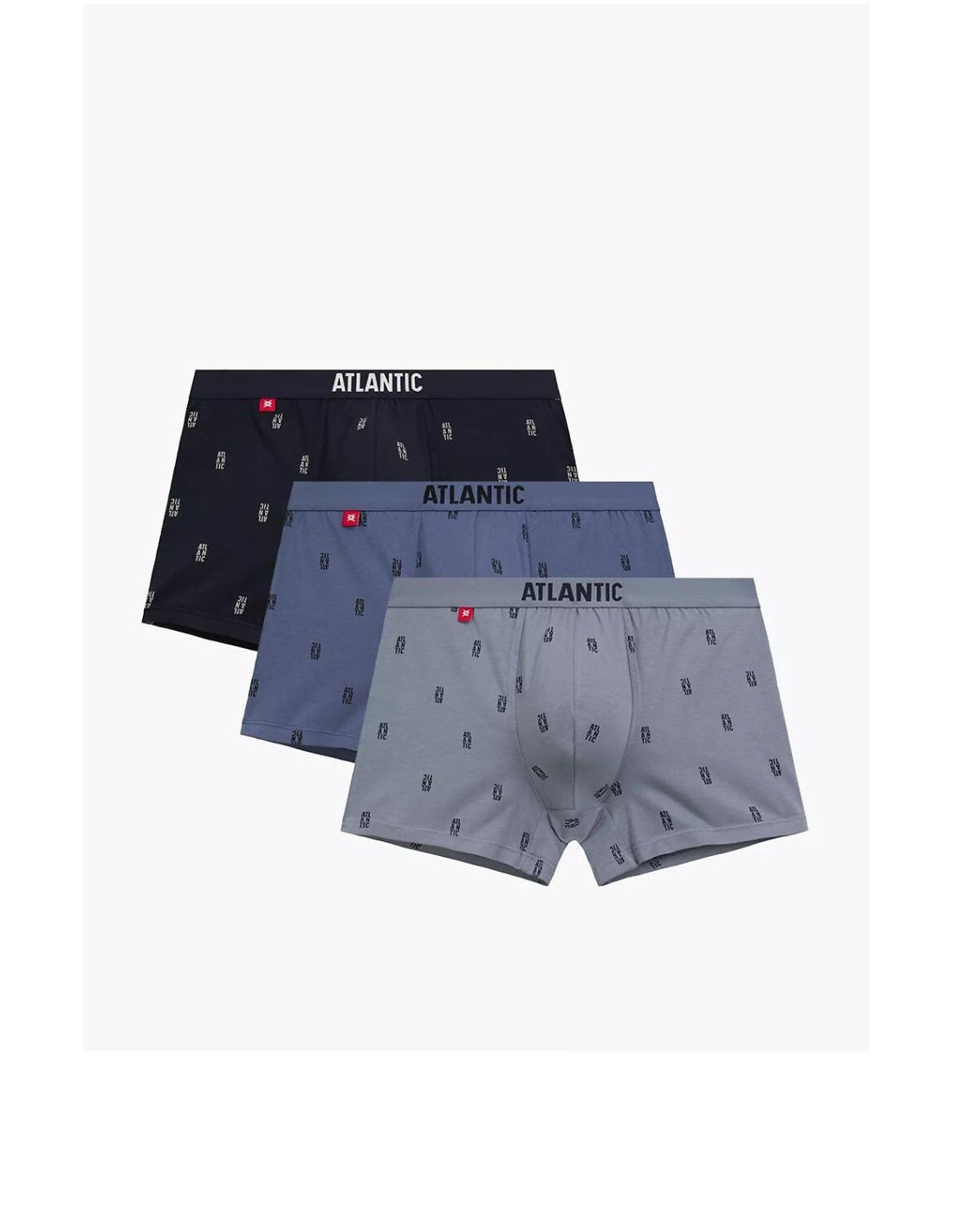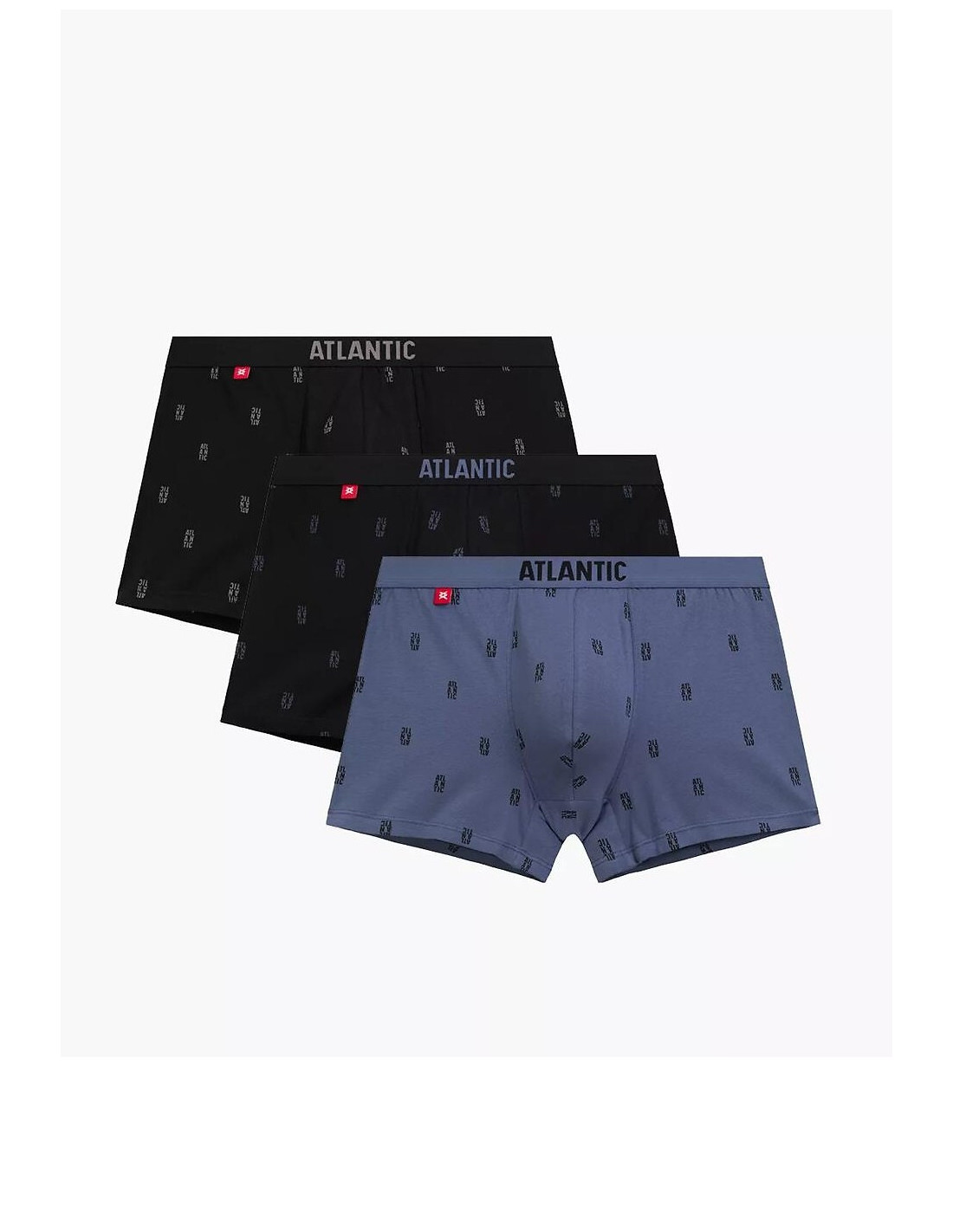 Bokserki męskie -przyjemna w dotyku dzianina -sportowy krój - wzór z napisami ATLANTIC - w pasie szeroka guma z logo marki -universalna długość nogawek - pakowane w pudełko po trzy pary