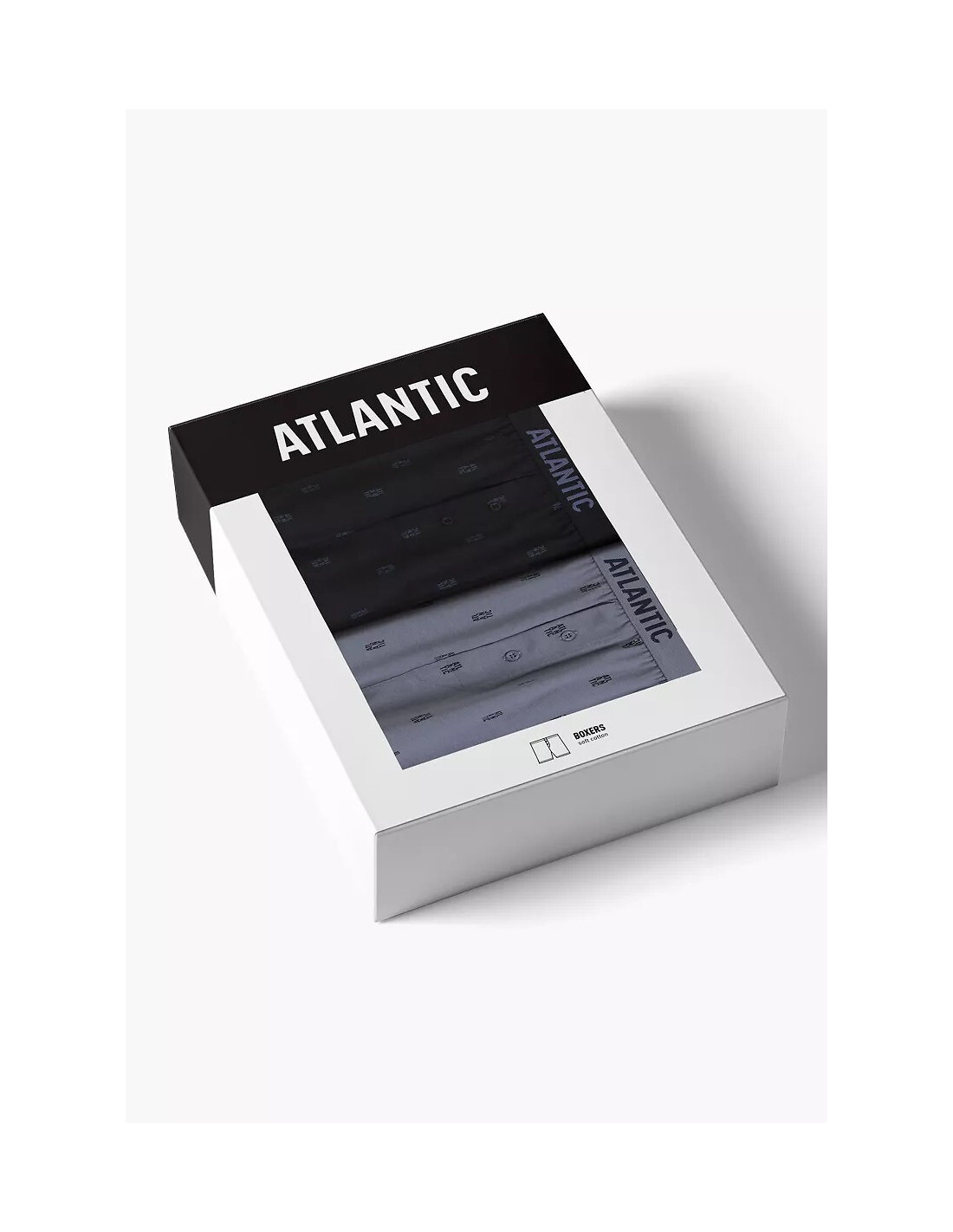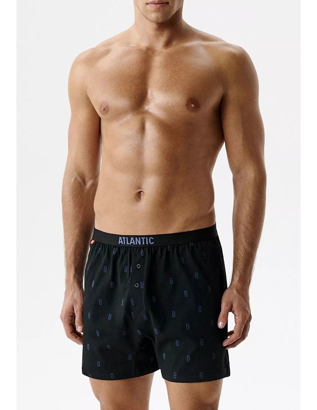 Męskie bokserki o luźnym fasonie - wzorzysta bawełna - w pasie szeroka guma z logo ATLANTIC - rozporek zapinany na guziki - pakowane w pudełko po dwie sztuki