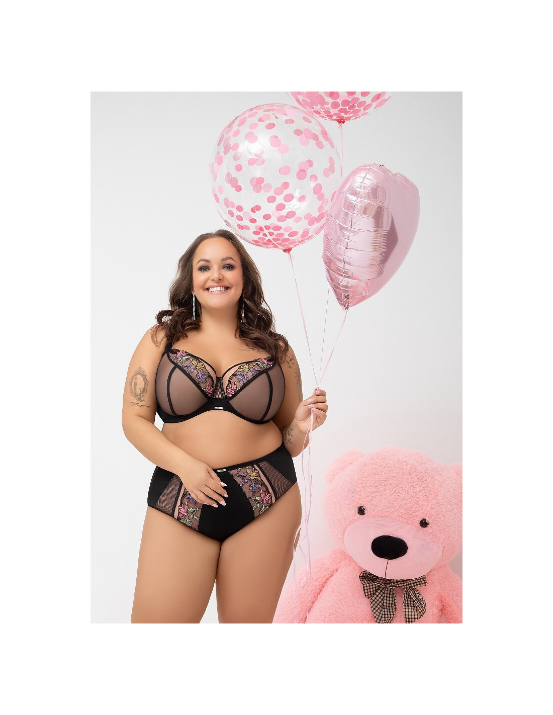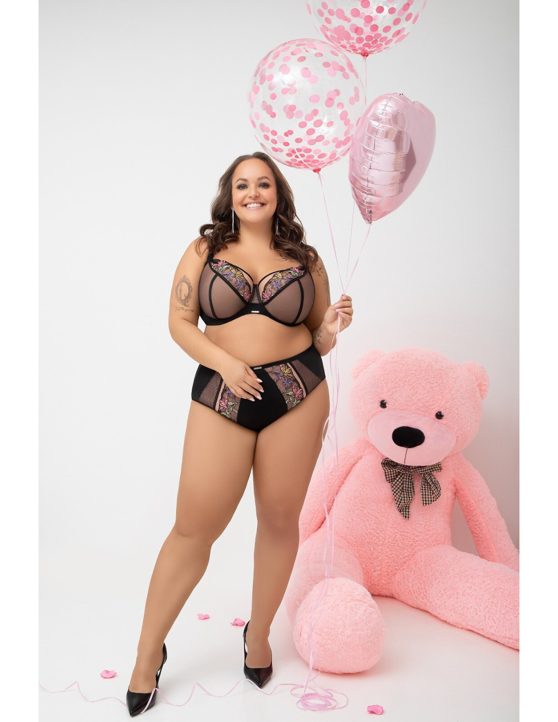 Figi damskie - z mikrofibry i siateczki zdobionej kolorowym haftem o kwiatowym motywie - wysoka talia, zabudowane biodra - fason zasłaniający prawie całe pośladki - model delikatnie opinający linu talii