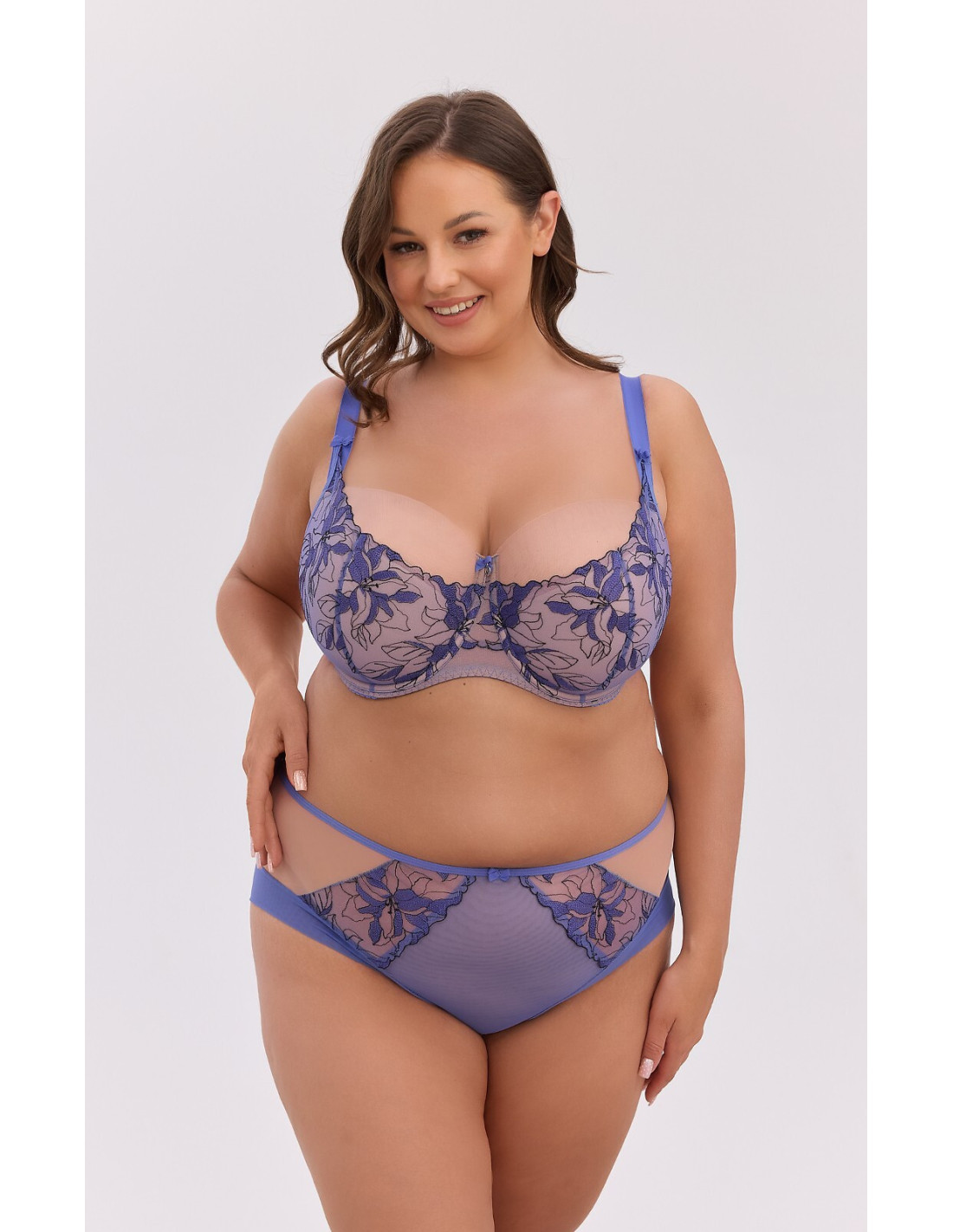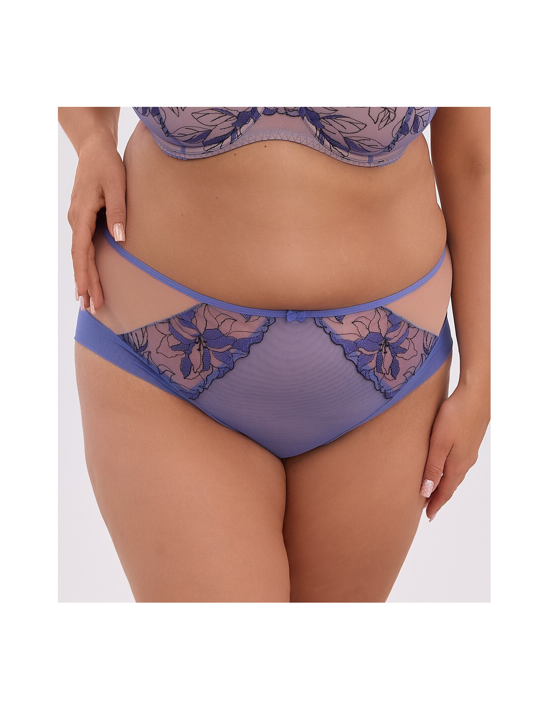Figi damskie - z tiulowej siateczki - z przodu ozdobny kwiatowy haft - delikatnie zabudowane biodra - nogawki zakończone podwójnym tiulem - w talii płaska gumka i satynowa kokardka