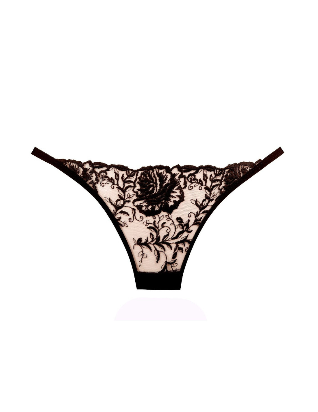 Stringi damskie - z tiulowej siateczki zdobionej kwiatowym haftem - na biodrach elastyczne paski z regulacją