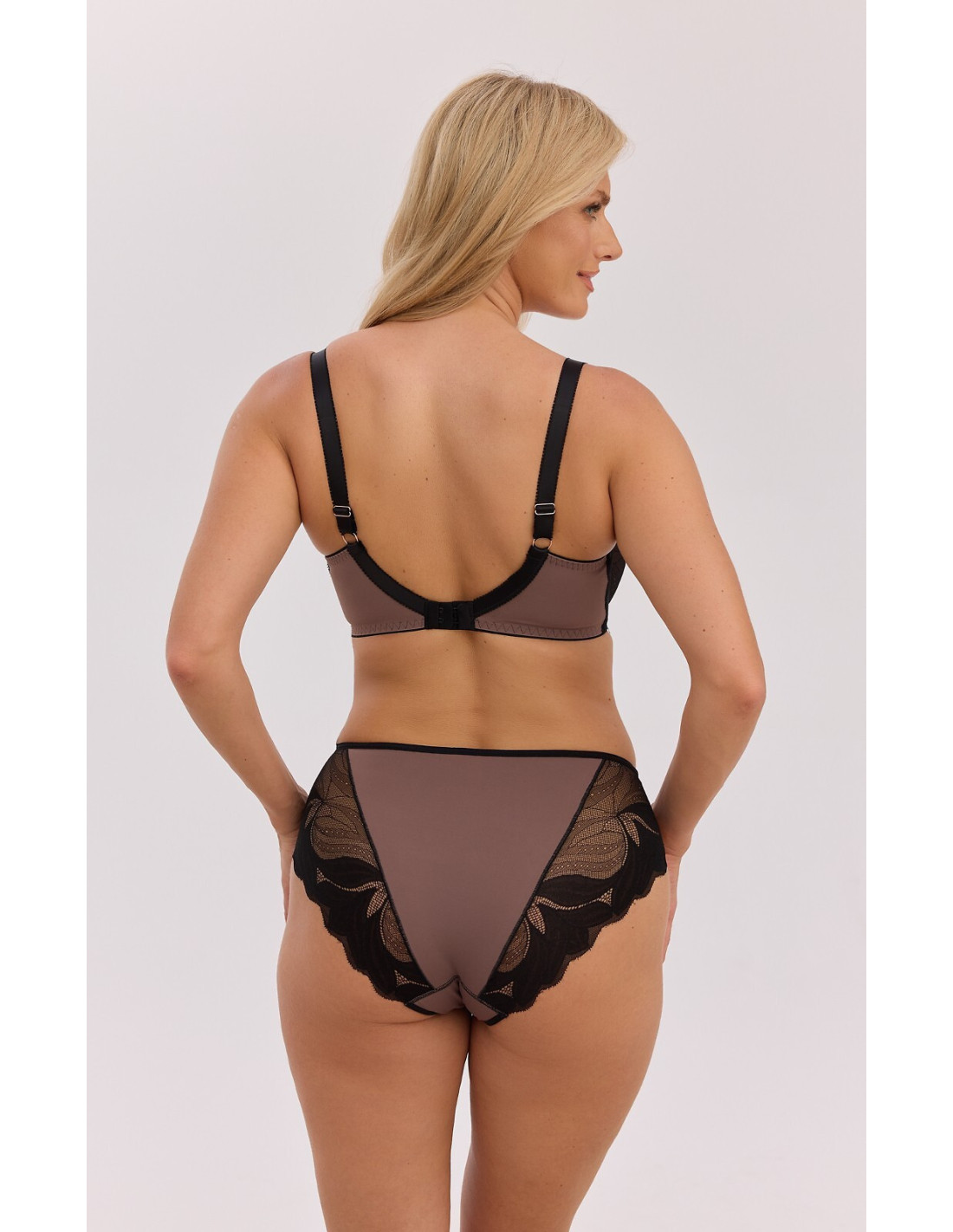 Figi damskie - krój tipo midi - z koronki o kwiatowym motywie - przód z gładkiej mikrofibry - boki z siateczki - w talii płaska gumka - tył zakończony koronką