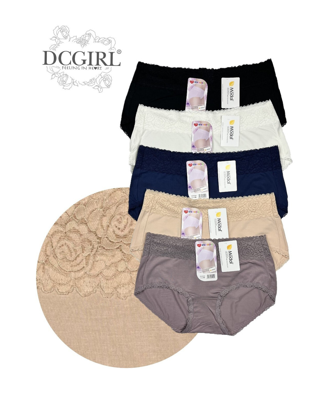 Figi damskie - z miłego, delikatnego dla ciała modalu - wysokie, zabudowane na biodrach - pas zdobi naszyta szeroka koronka - nogawki obszyte koronkową taśmą - pakowane w foliowy woreczek po dwie sztuki w kolorze: beżowy, czarny, beżowy, mocca, granatowy - wybierane losowo