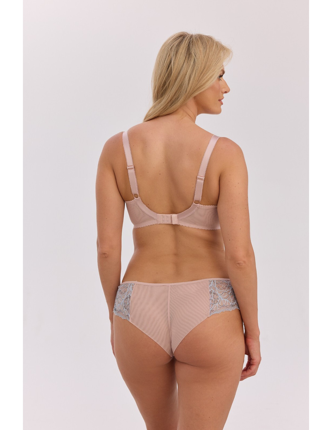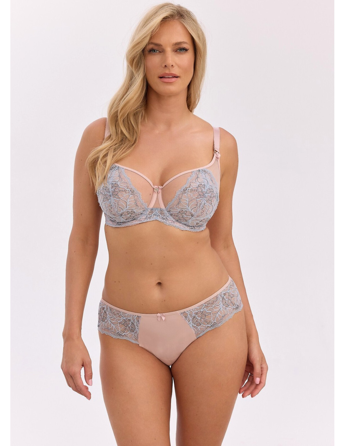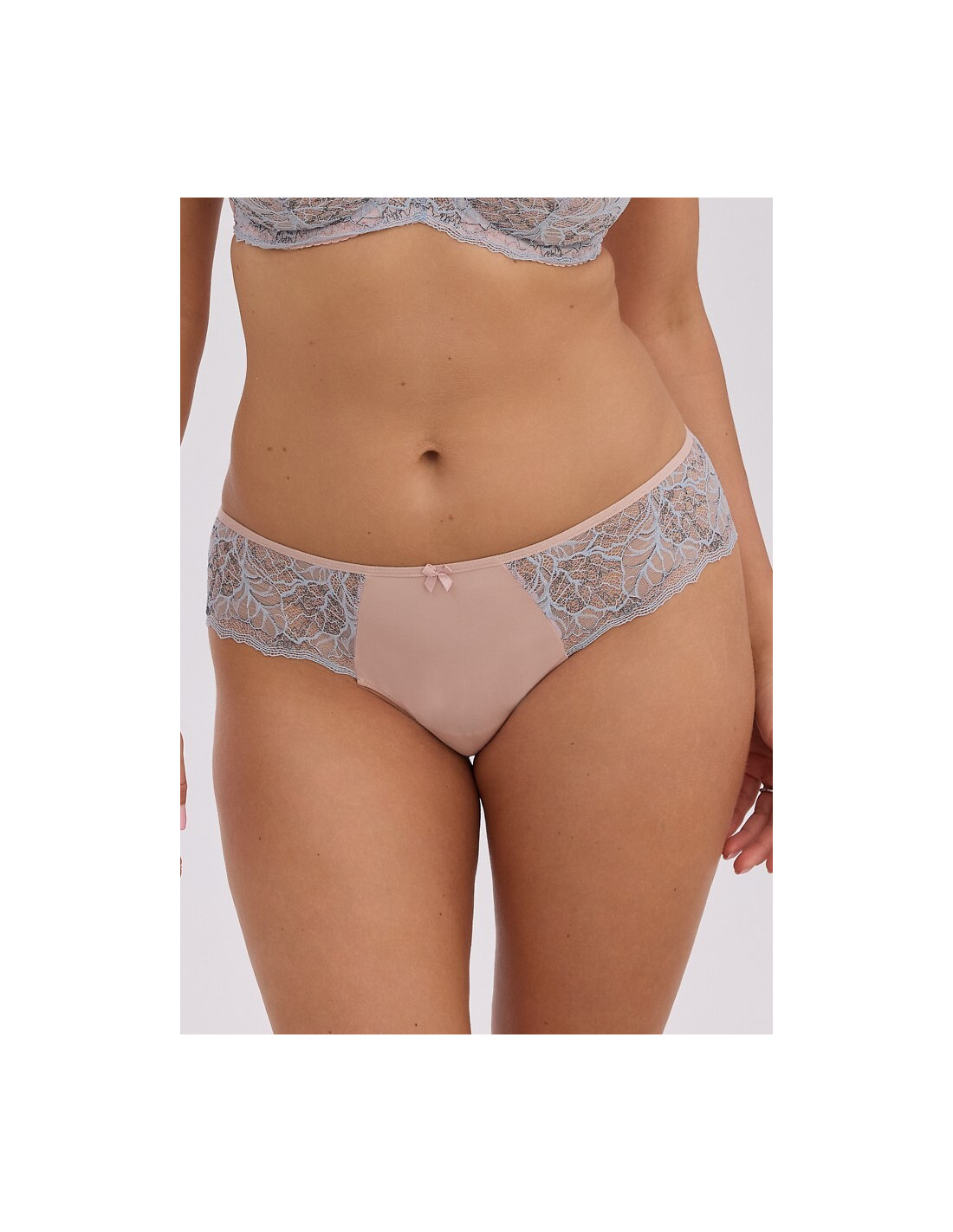 Figi damskie o kroju brazylian - wykonane z gładkiej, beżowej mikrofibry i niebieskiej koronki - w talii płaska gumka i ozdobna satynowa kokardka - tył z beżowej, podwójnej siateczki - model odsłaniający pośladki