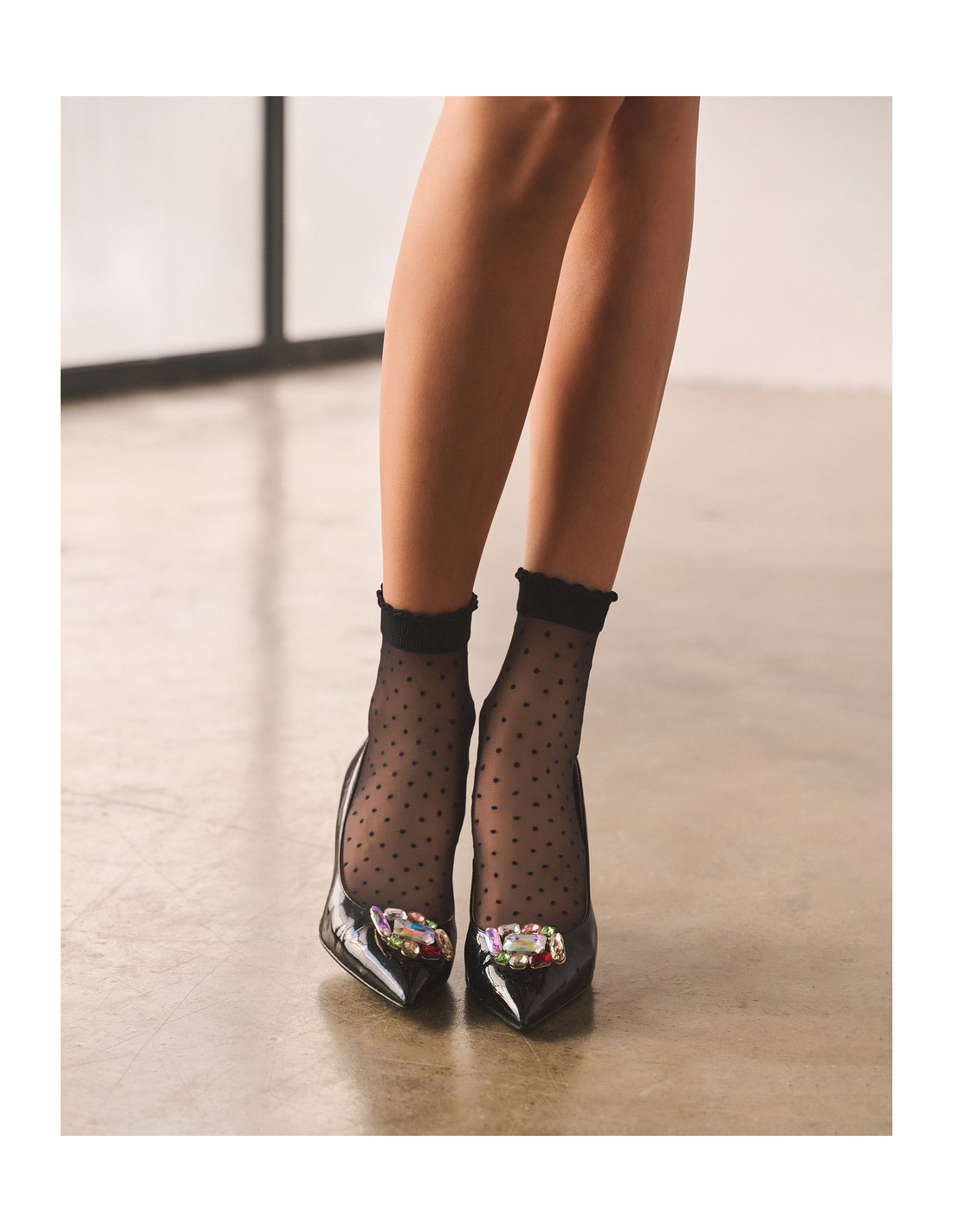 Moteriškos kojinės - taškinis raštas - nėrinius imituojančios juostelės - nėra sutvirtinimo ant kojų pirštų sudėtis: sudėtis: 85 % poliamidas, 15 % elastanas