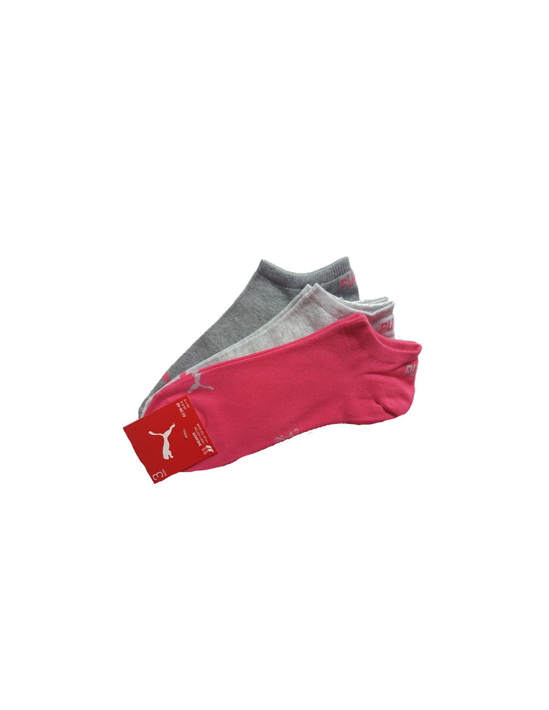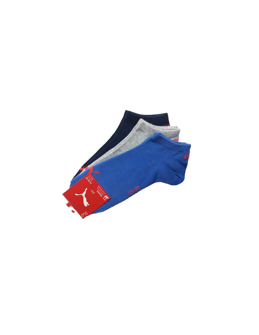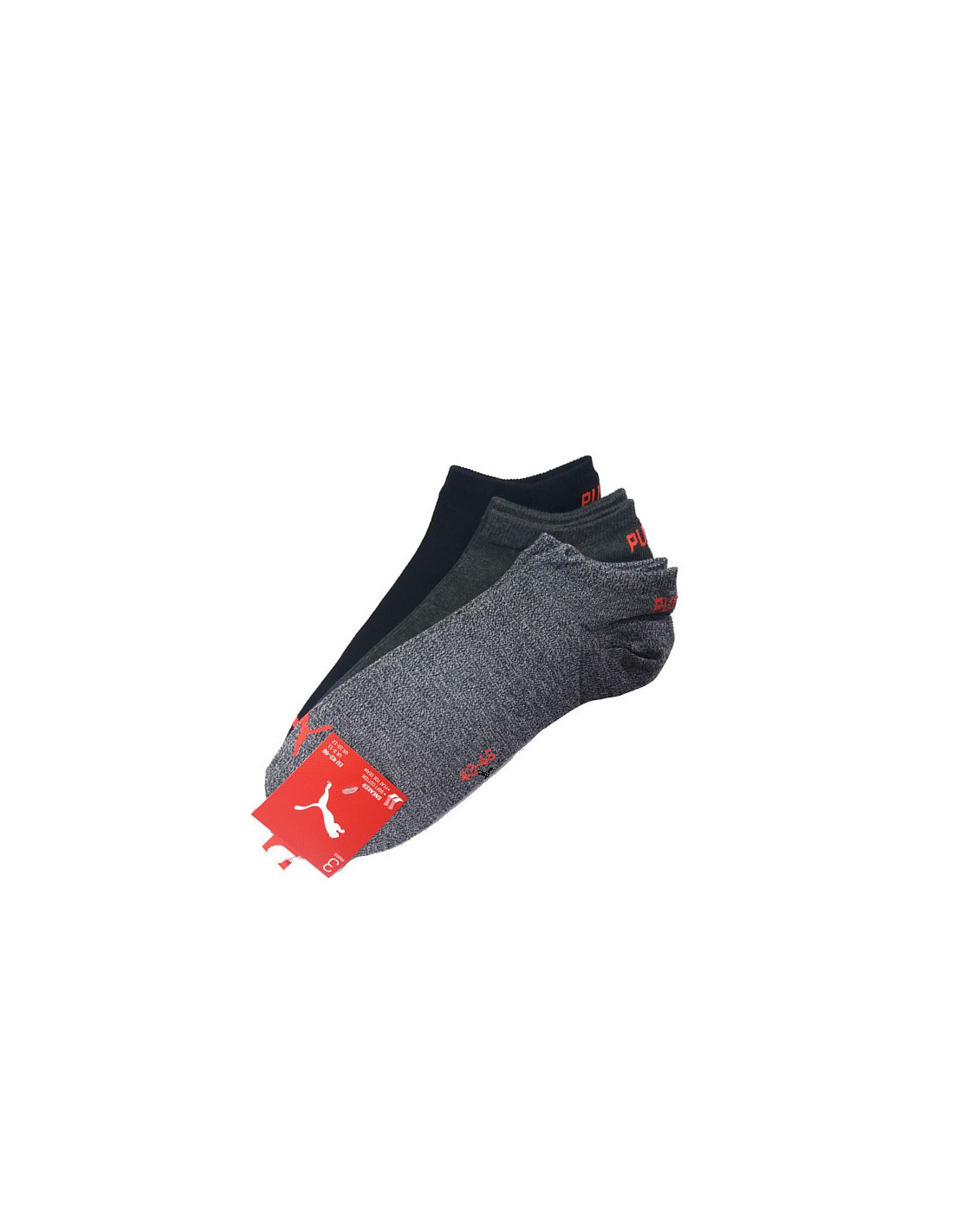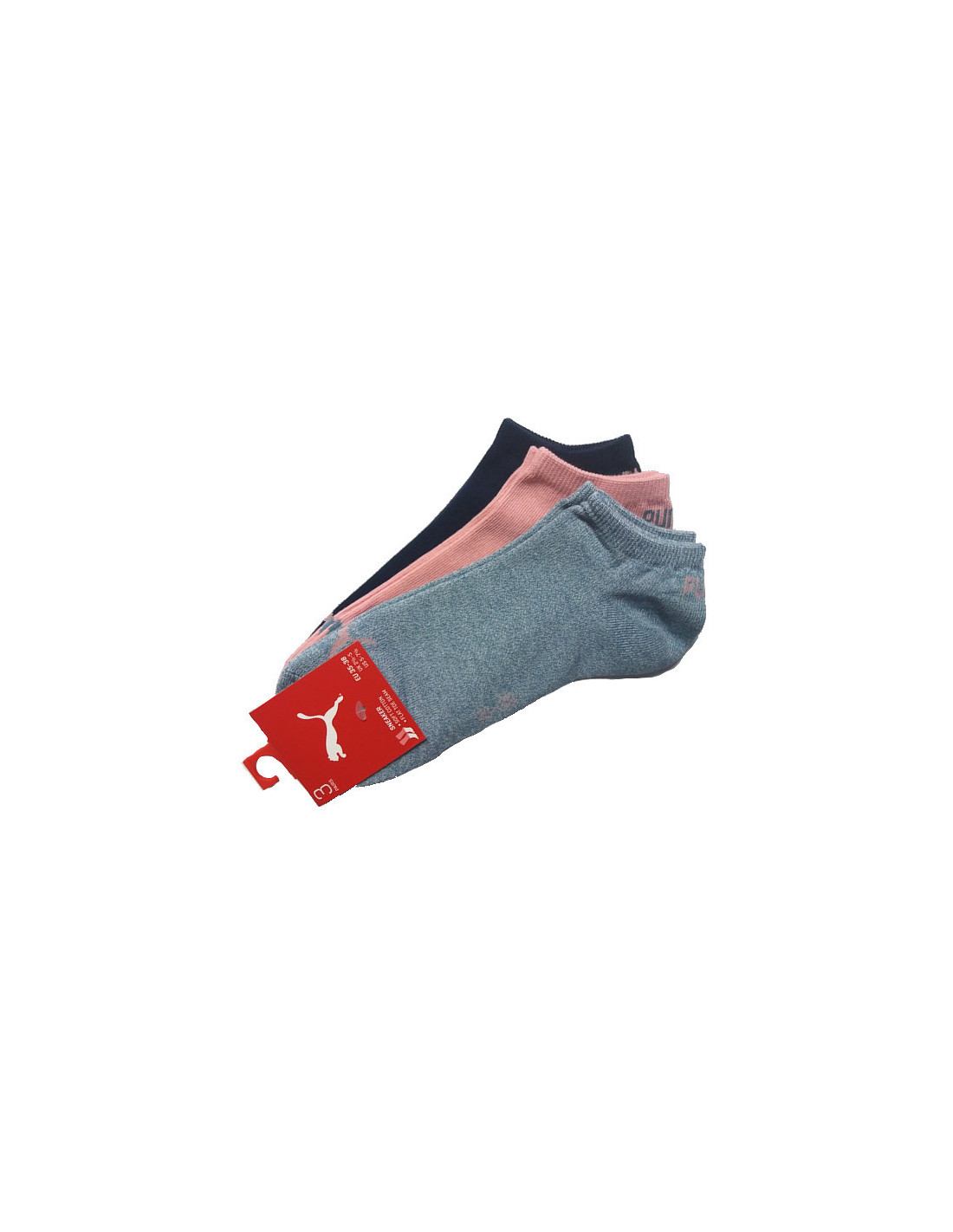 Vyriškos ir moteriškos kojinės su "Puma" logotipu ir užrašu ant kelnių krašto. Supakuotos po tris poras.
