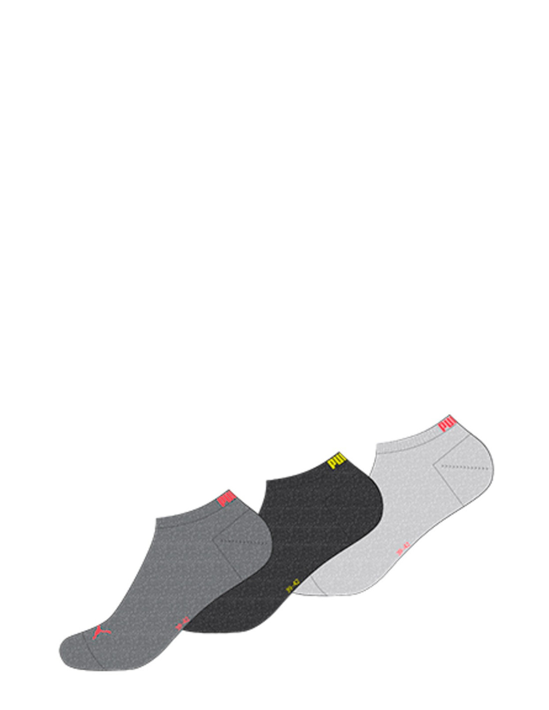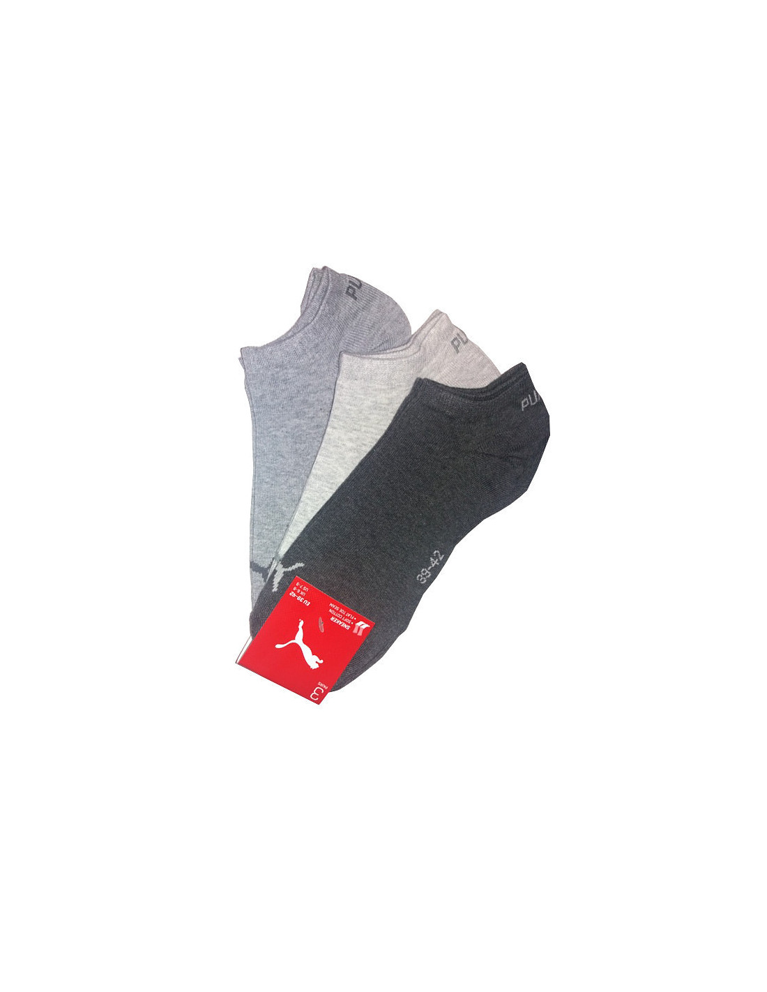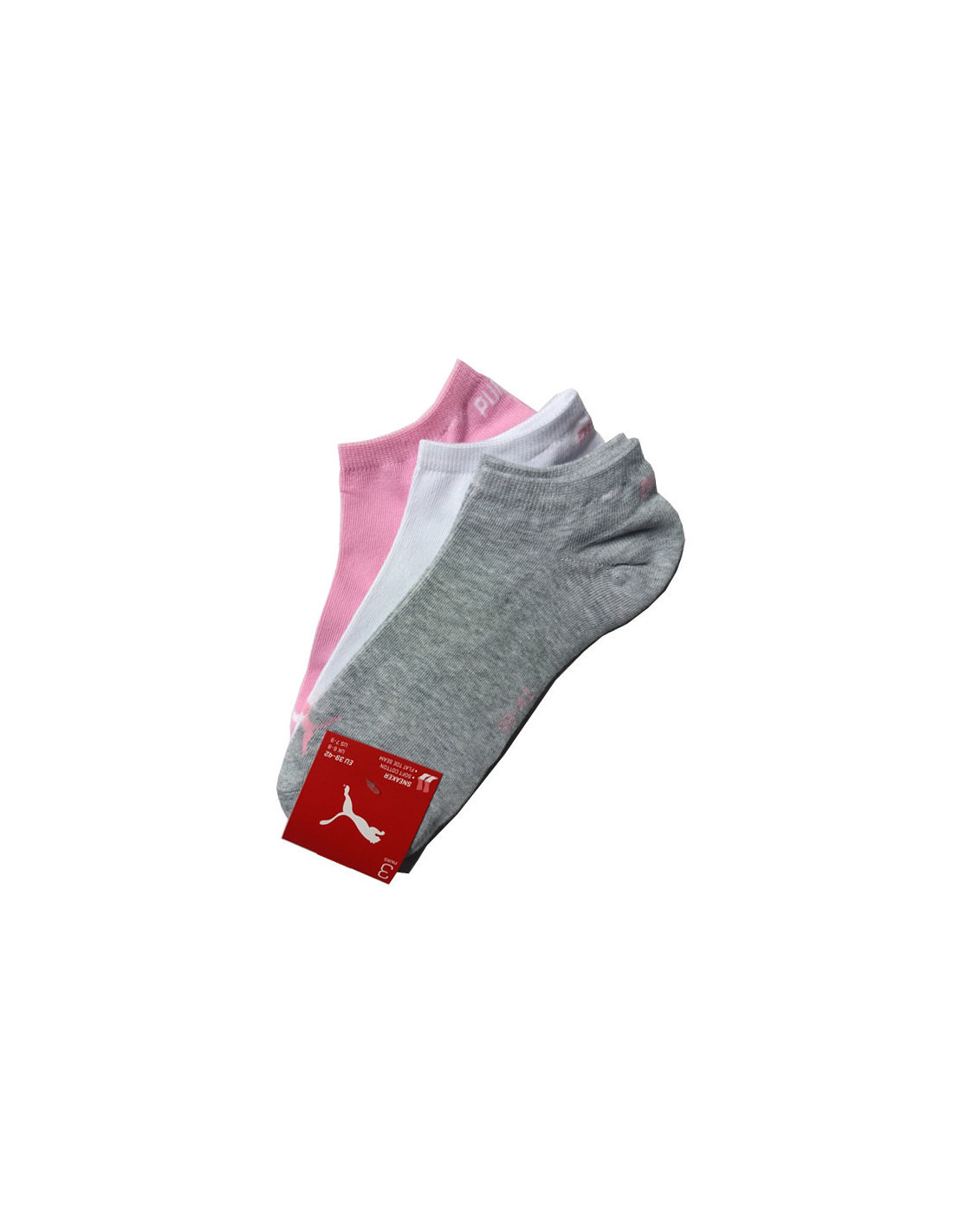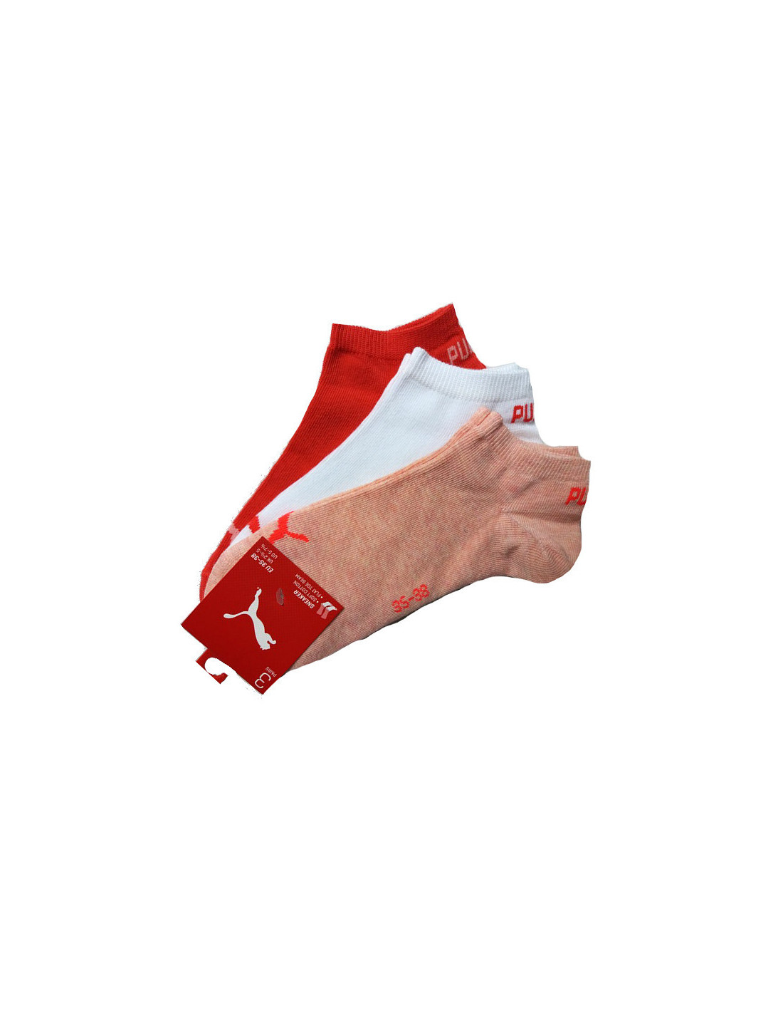 Vyriškos ir moteriškos kojinės su "Puma" logotipu ir užrašu ant kelnių krašto. Supakuotos po tris poras.