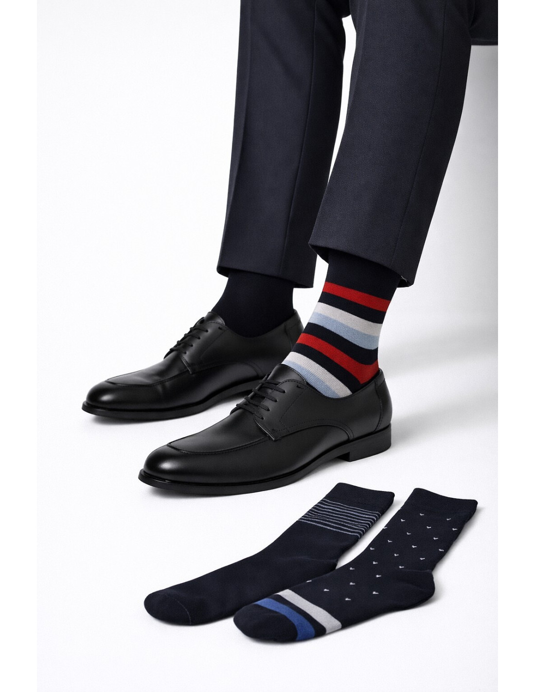 Vyriškos medvilninės kojinės - raštuotos - plokščios siūlės - nespaudžiantis raištis - profiliuotas kulnas, kad būtų patogu ir lengva naudoti - supakuotos į dėžutę po 3 poras su skirtingais raštais