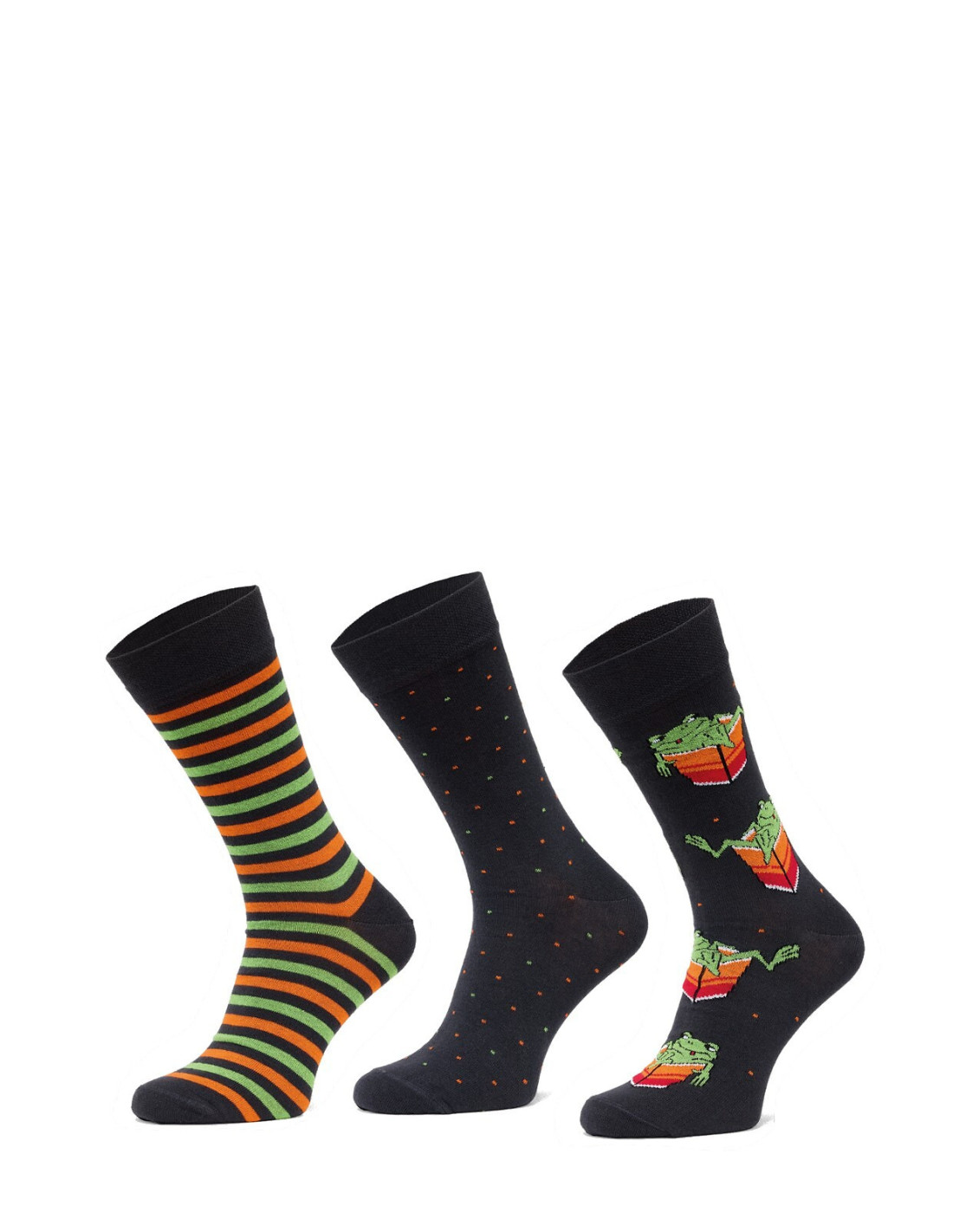 Vyriškos medvilninės kojinės - raštuotos - plokščios siūlės - nespaudžiantis raištis - profiliuotas kulnas - kad būtų patogu ir lengva naudoti - supakuotos į dėžutę po 3 poras su skirtingais raštais