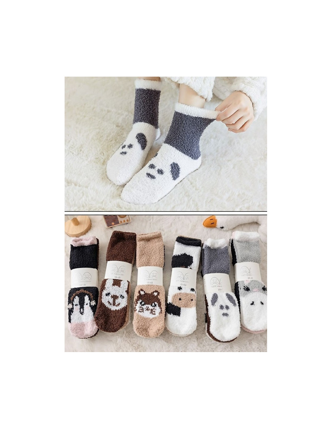 Moteriškos kojinės - pagamintos iš minkšto trikotažo minkšto audinio - kojos pirštai dekoruoti gyvūnų motyvais - nepakeičiamos ilgais žiemos vakarais - supakuotos po 3 poras skirtingų spalvų derinių