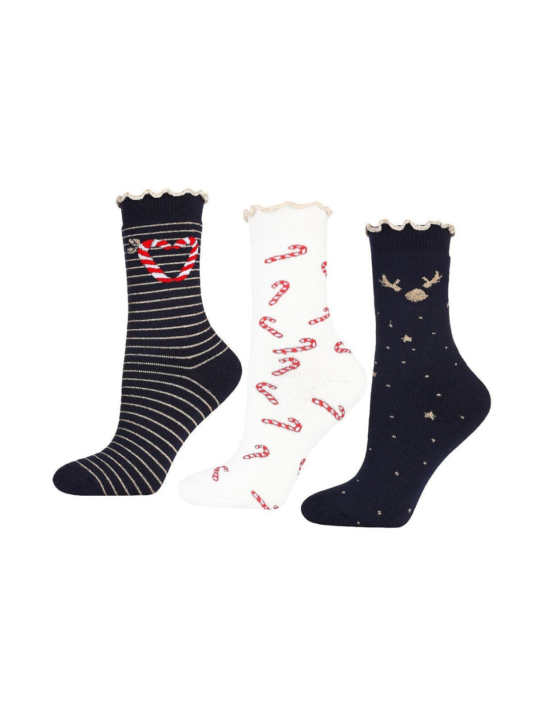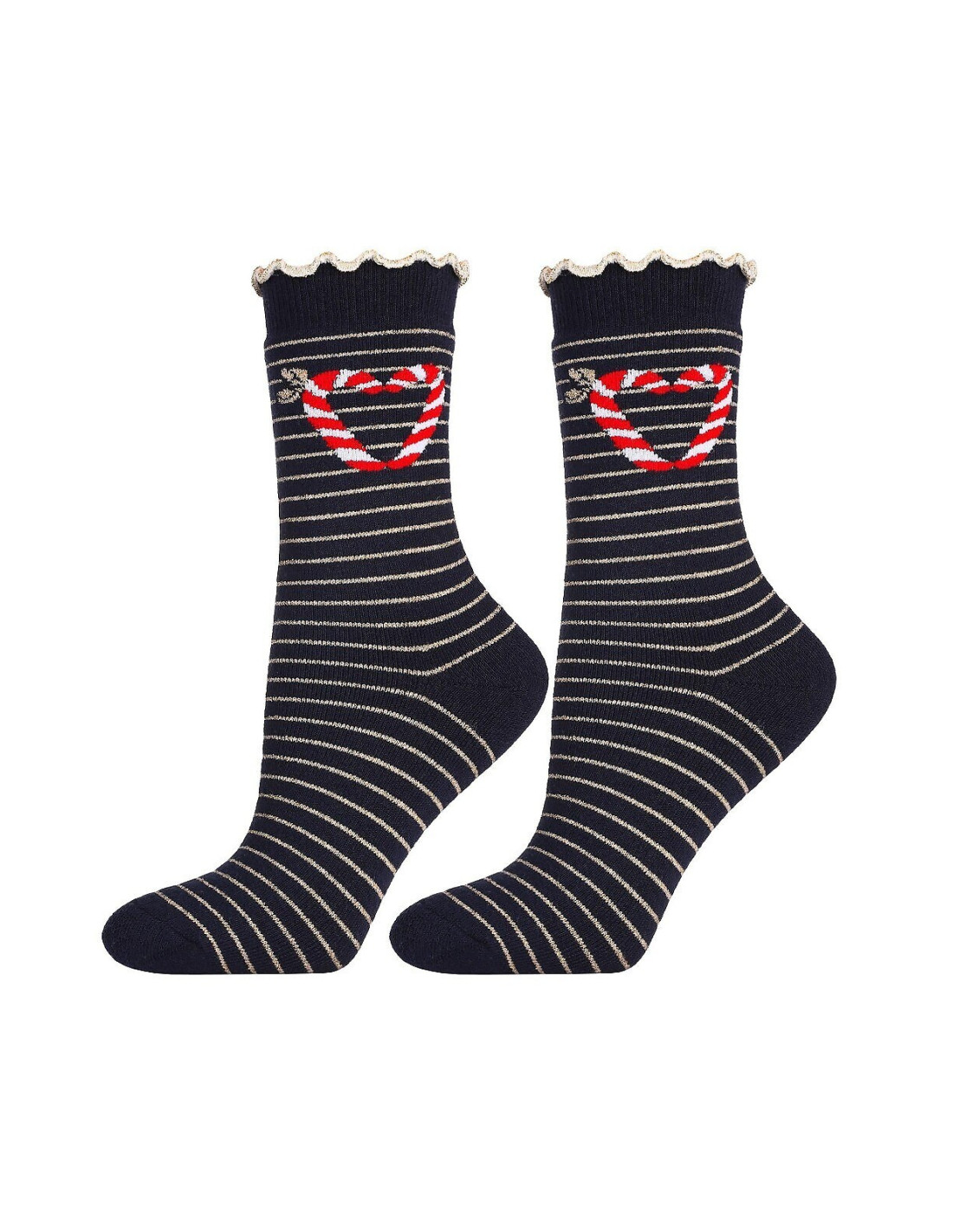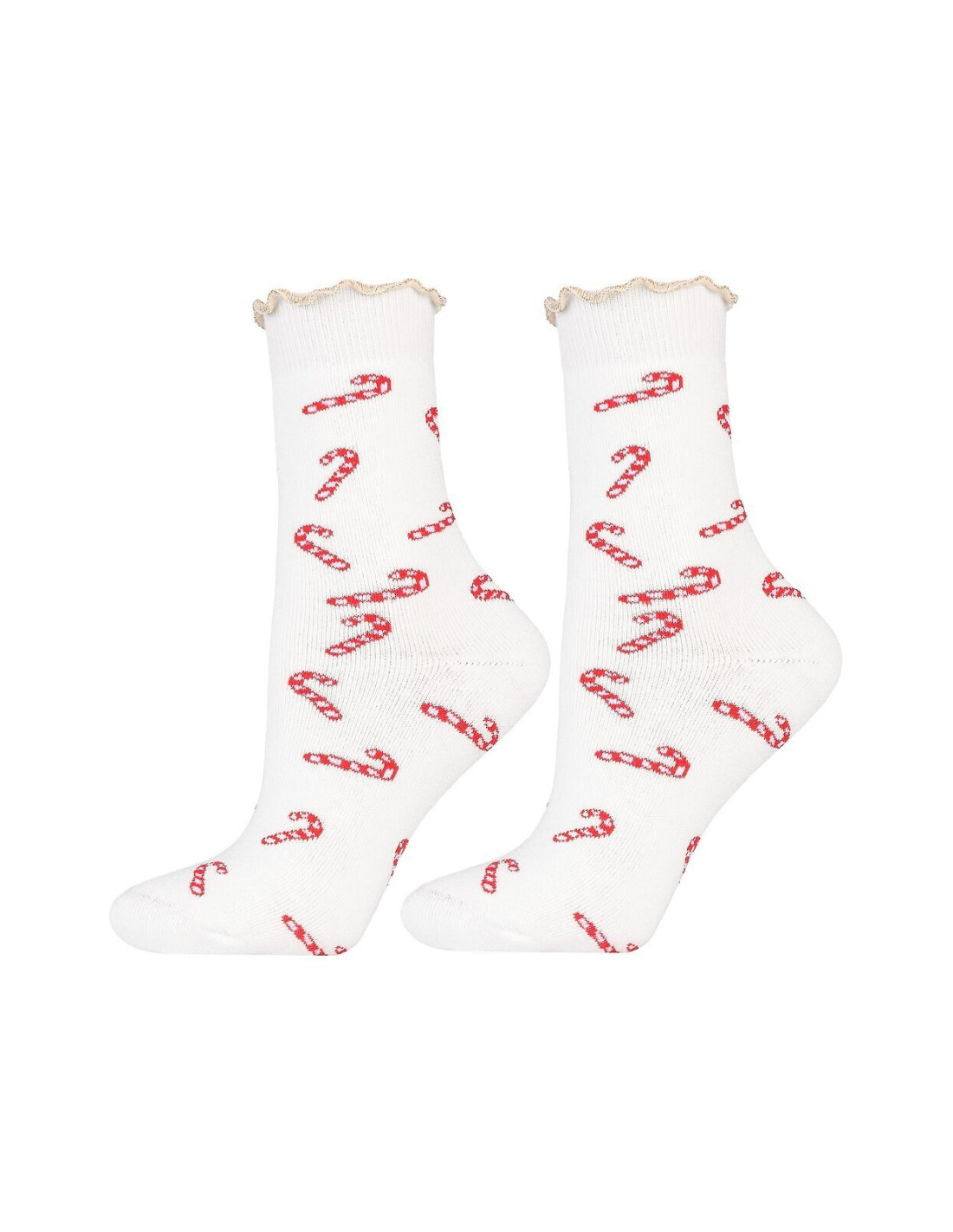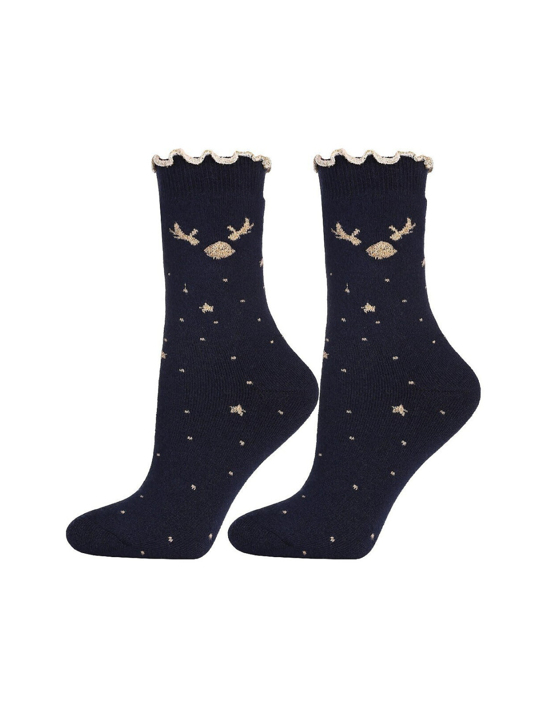 Moteriškos kojinės - pagamintos iš medvilnės - šventiniai raštai - minkštas frotinis audinys iš vidinės pusės - briaunuotas kraštas su blizgiu liurekso siūlu - plokščios siūlės - galimos spalvos: ecru, tamsiai mėlyna, juoda - pasirinktos atsitiktine tvarka