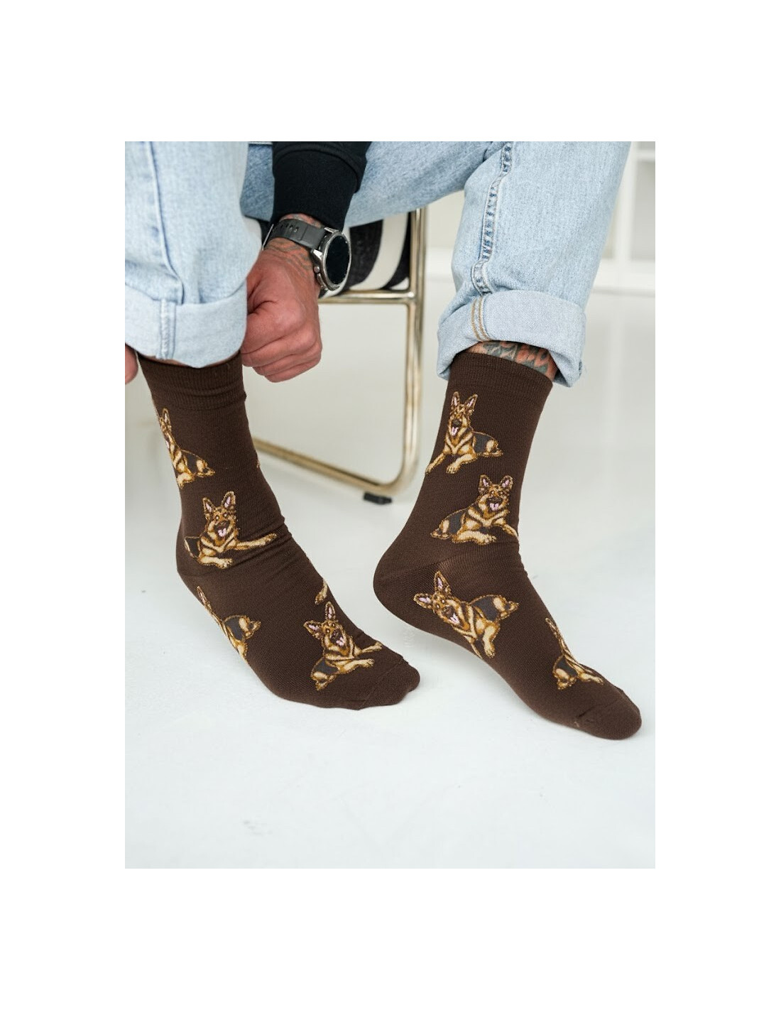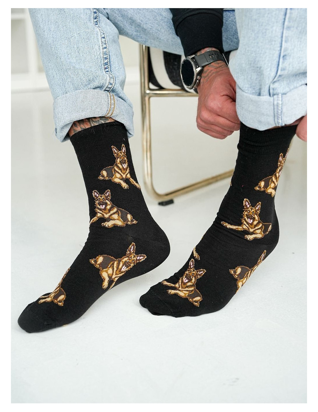 Bawełniane skarpety męskie - zwierzęcy motyw z owczarkami - doskonale sprawdzą się w codziennych stylizacjach - idealiai dopasowują się do stóp - zapewniają wysoki komfort noszenia
