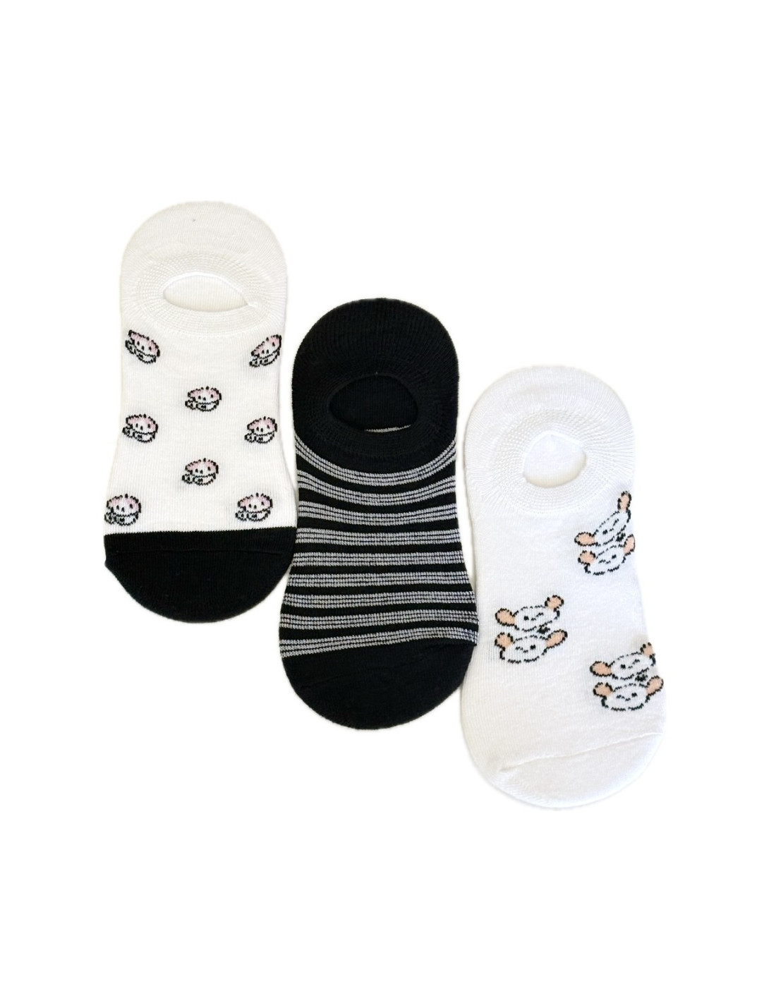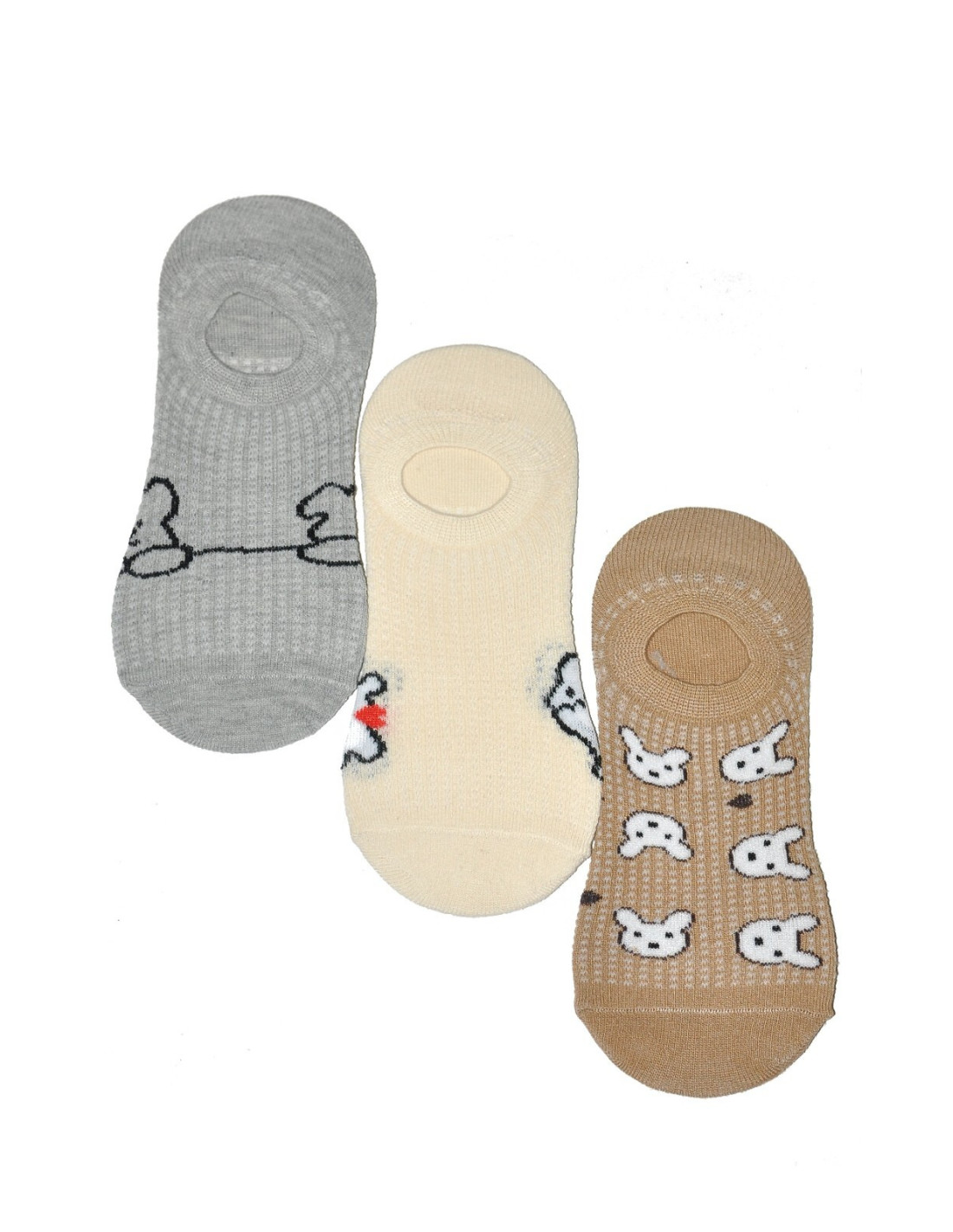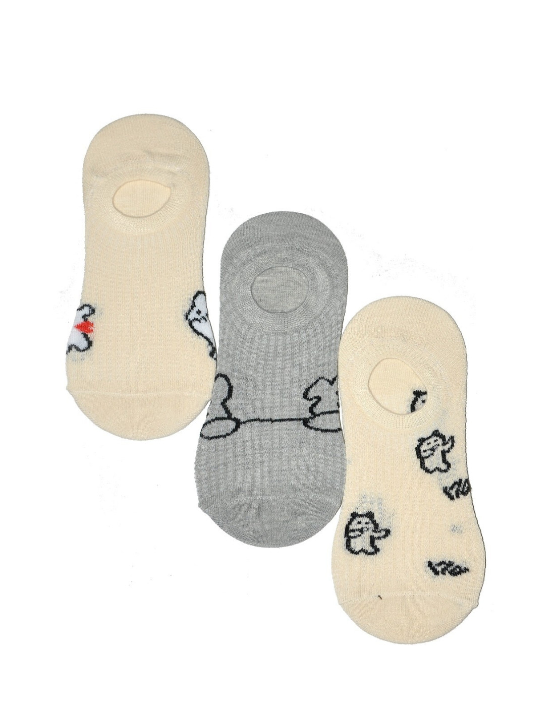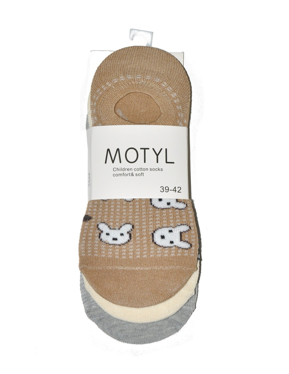 Bawełniane baleriny damskie - z nieuciskającym ściągaczem - ozdobione wzorem z misiem - płaski szew - kolor dostępny waniliowy, beżowy, szary pakowane po trzy pary w różnych zestawach kolorystycznych