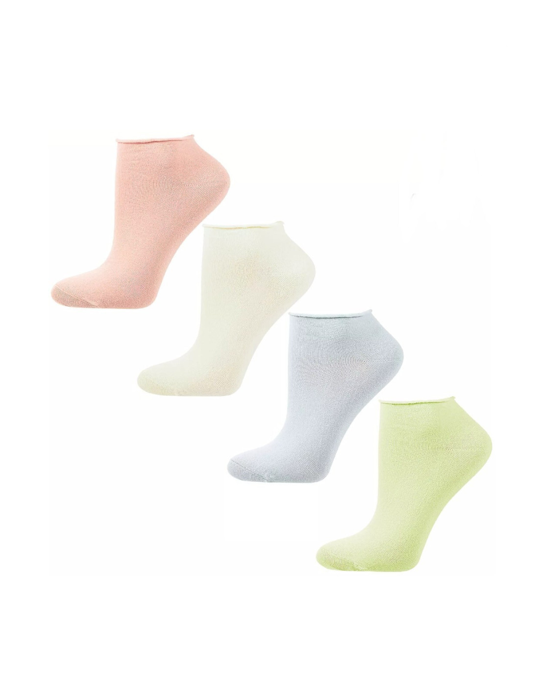 Stopki damskie - wykonane z miękkiej bawełny - idealiai przylegają do stopy - bezuciskowe wykończenie - bardzo miłe w dotyku - dostępne kolory, wybierane losowo: pudrowy róż, ecru, pistacjowy, oliwkowy jasny