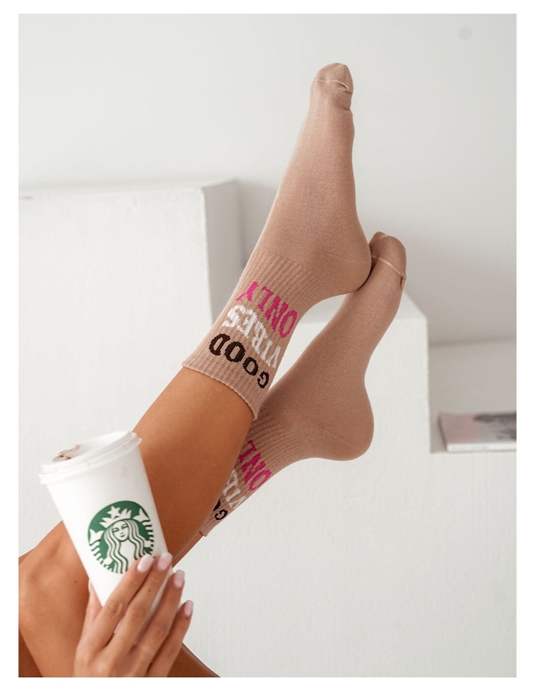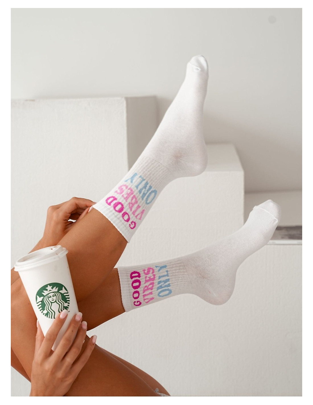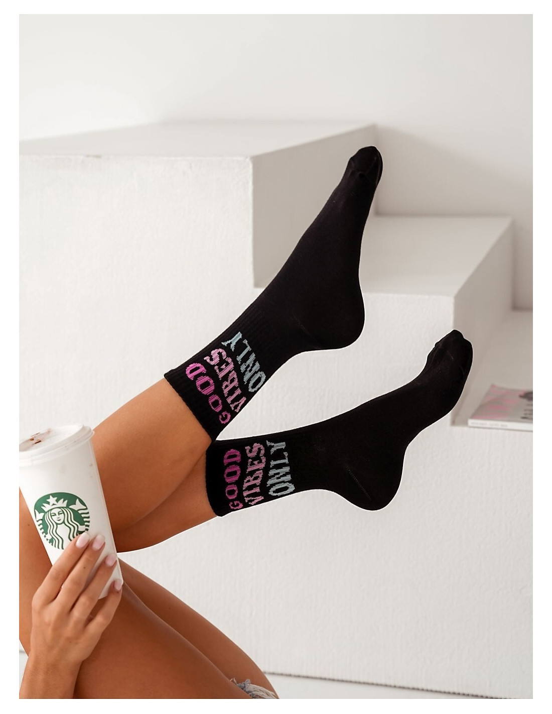 Bawełniane skarpety damskie - cholewka w prążek - ozdobione kolorowym napisem Good Vibes Only
