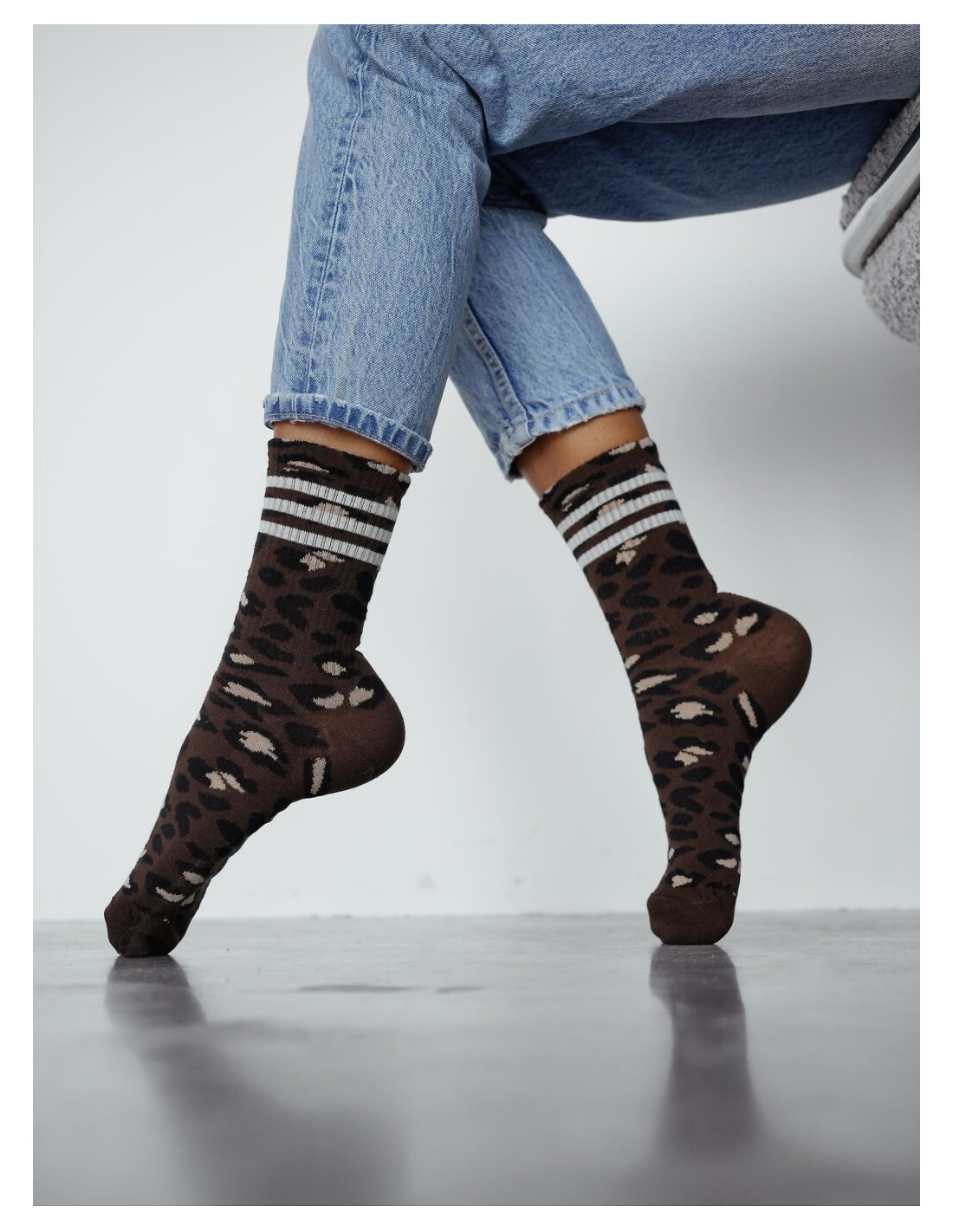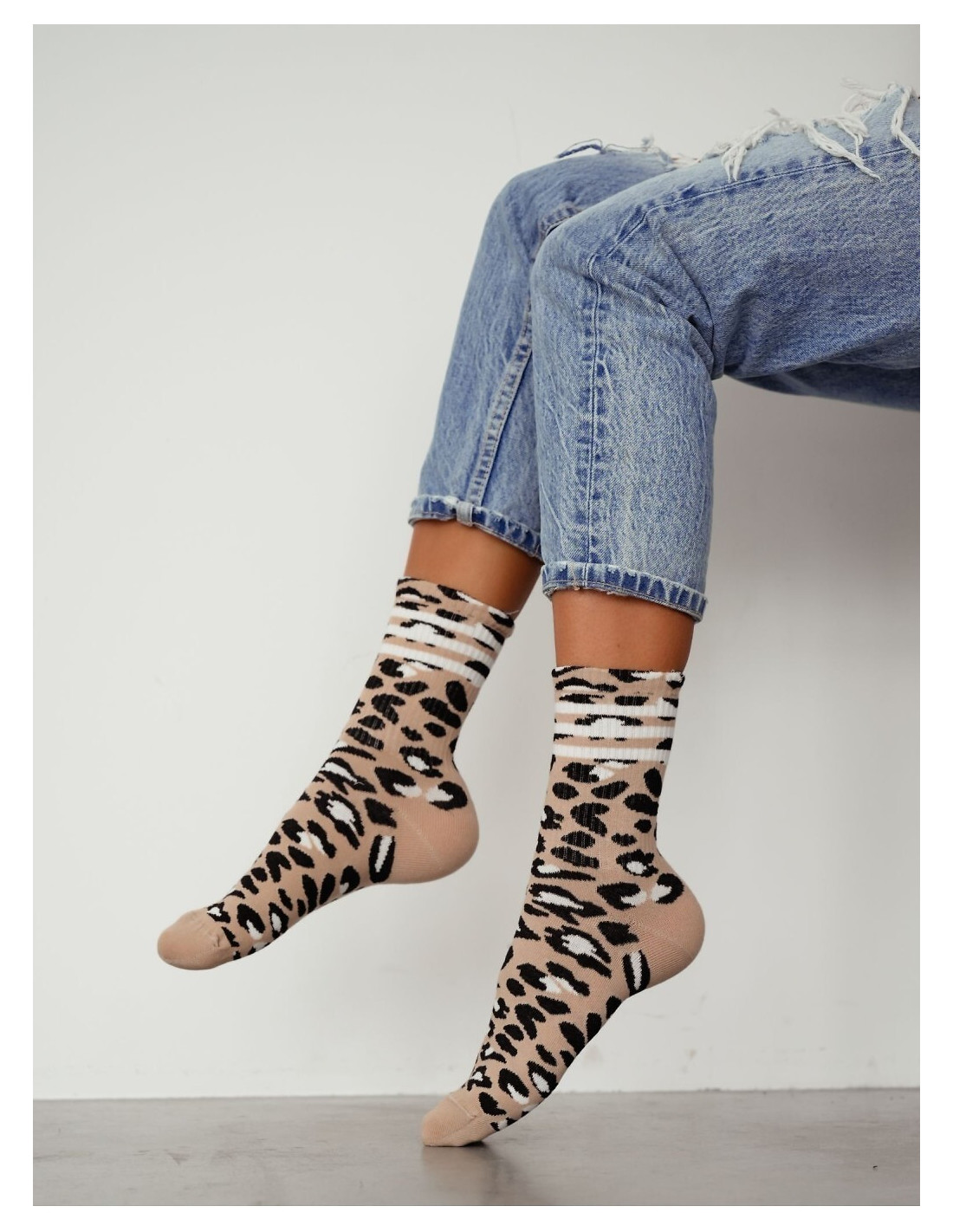Bawełniane skarpety damskie - zwierzęcy motyw w panterkę - cholewkę zdobią trzy paski - doskonale sprawdzą się w codziennych stylizacjach - idealiai dopasowują się do stóp - zapewniają wysoki komfort noszenia