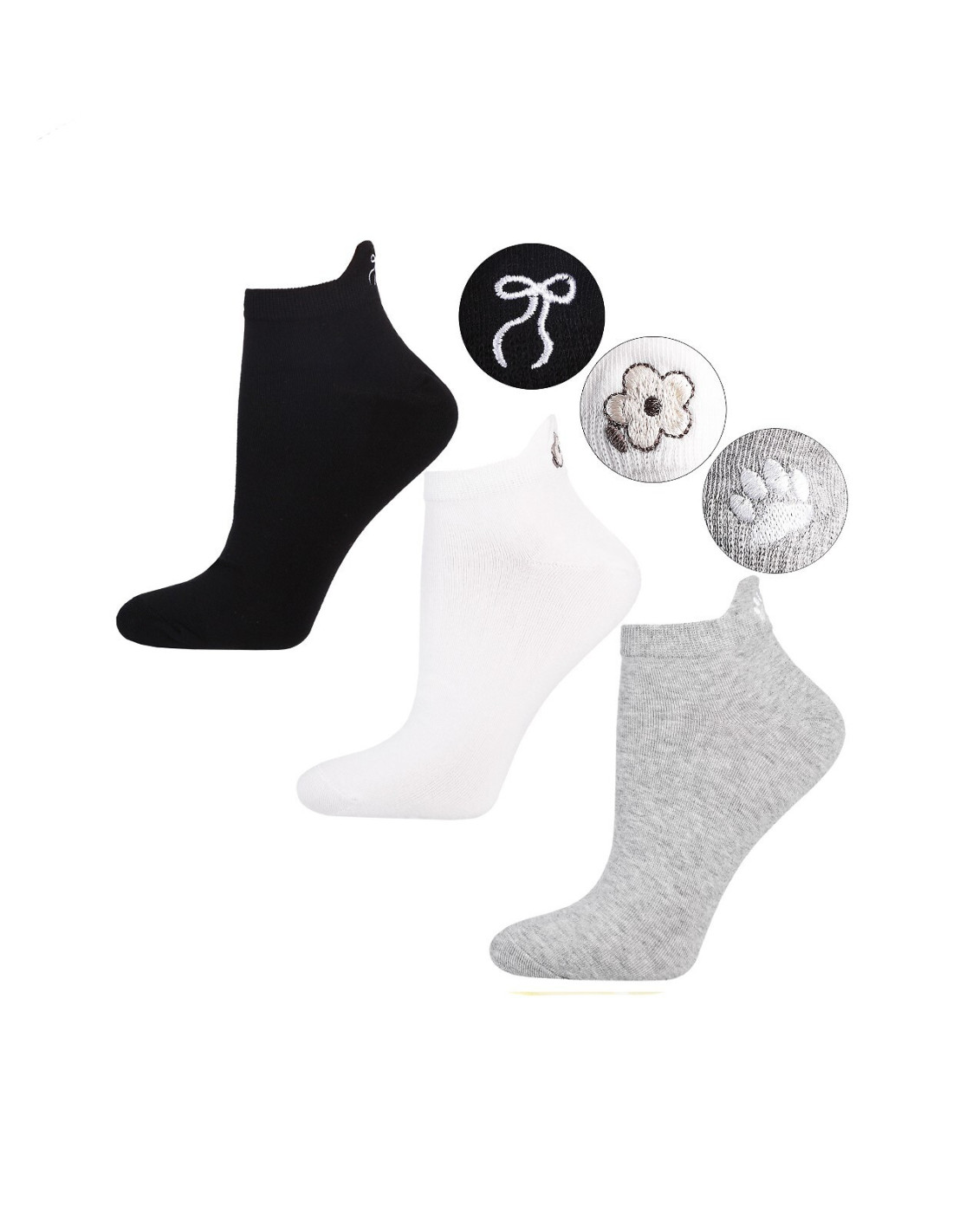 Bawełniane stopki damskie - jednolite - zapiętek zdobią aplikacje - Dostępne kolory: biały, szary, czarny - wybierane losowo