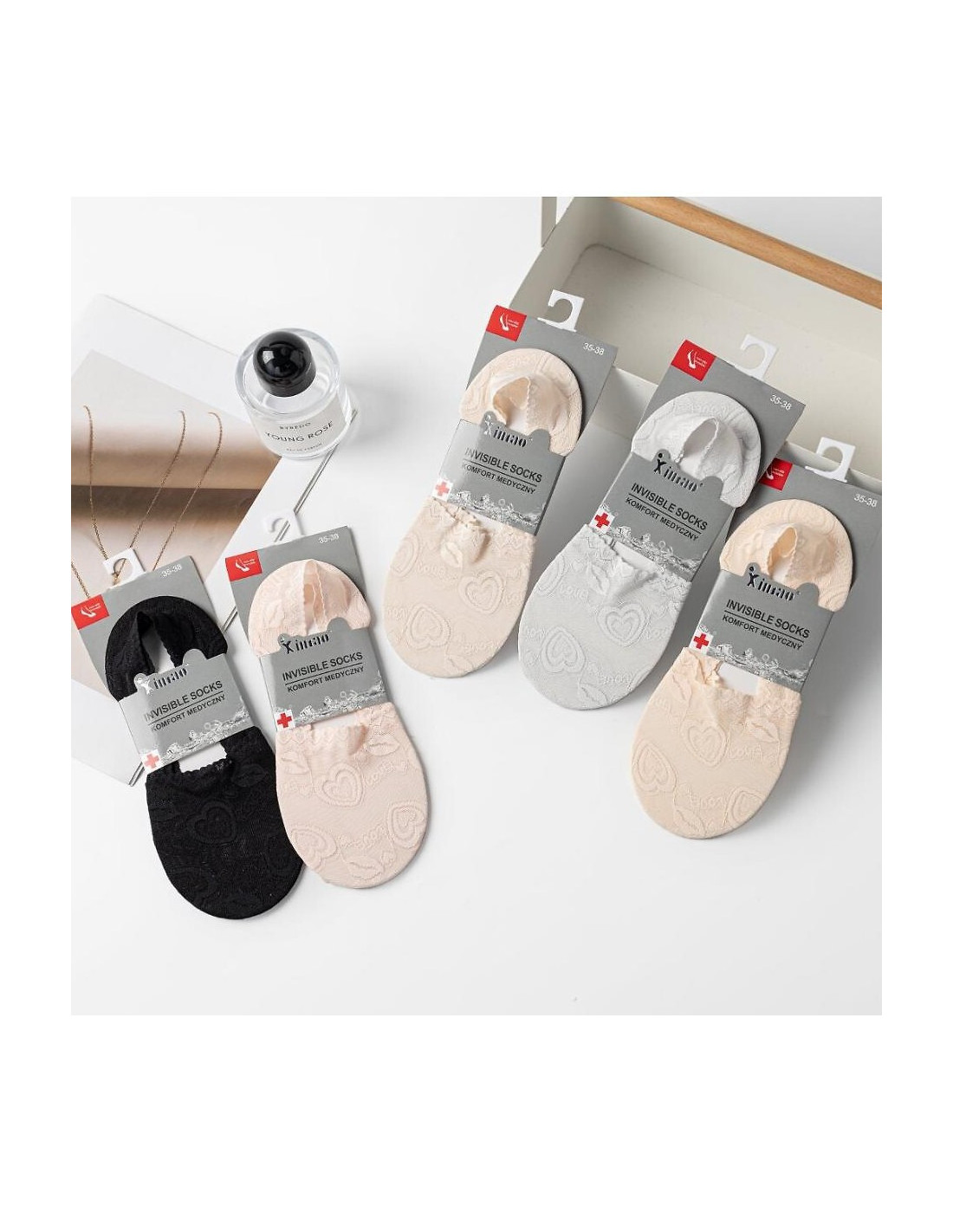 - z transparentnego materiału z ozdobnym wzorem w serduszka, usta i napis love