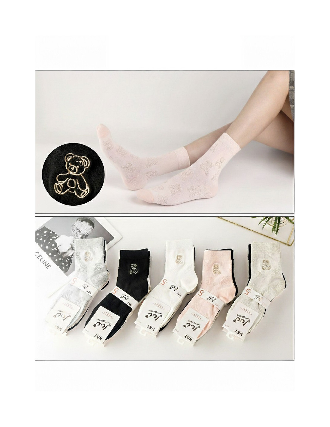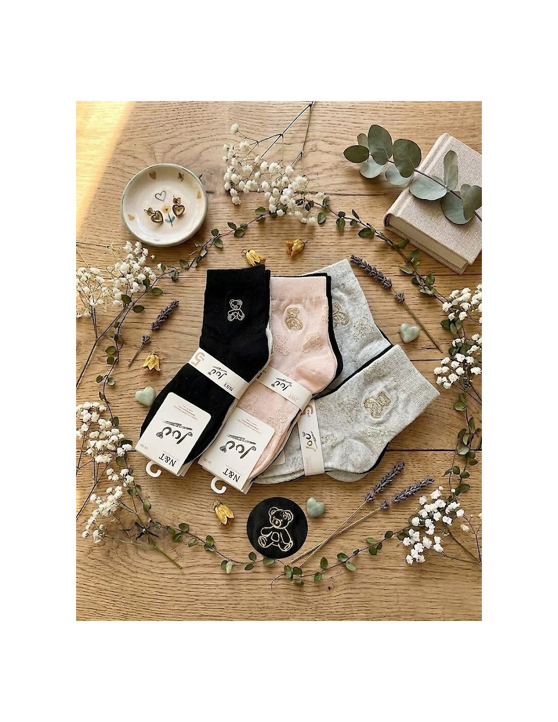 Bawełniane skarpetki damskie - ozdobione ażurowym wzorem w misie - na cholewce wyhaftowany miś - doskonale sprawdzą się w codziennych stylizacjach - idealiai dopasowują się do stóp