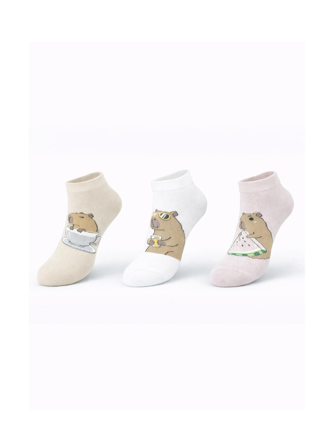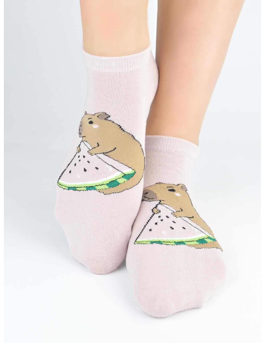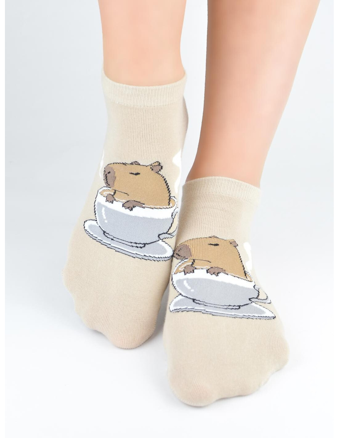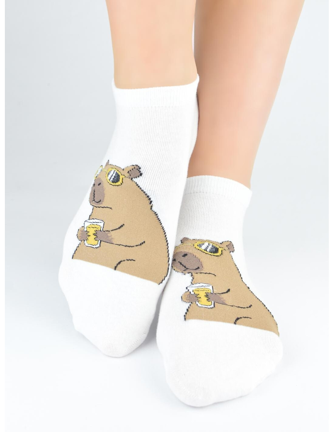 Bawełniane stopki damskie - kolorowy wzór z kapibarą - delikatne, miłe w dotyku - płaskie szwy - nieuciskający ściągacz - dostępne kolory wybierane losowo: biały, beżowy, pudrowy róż
