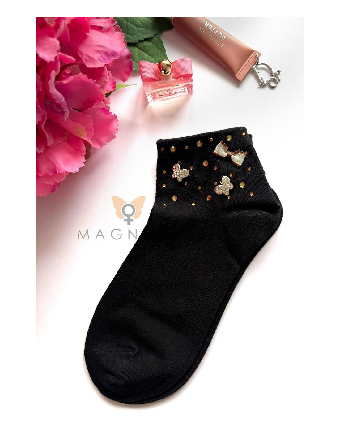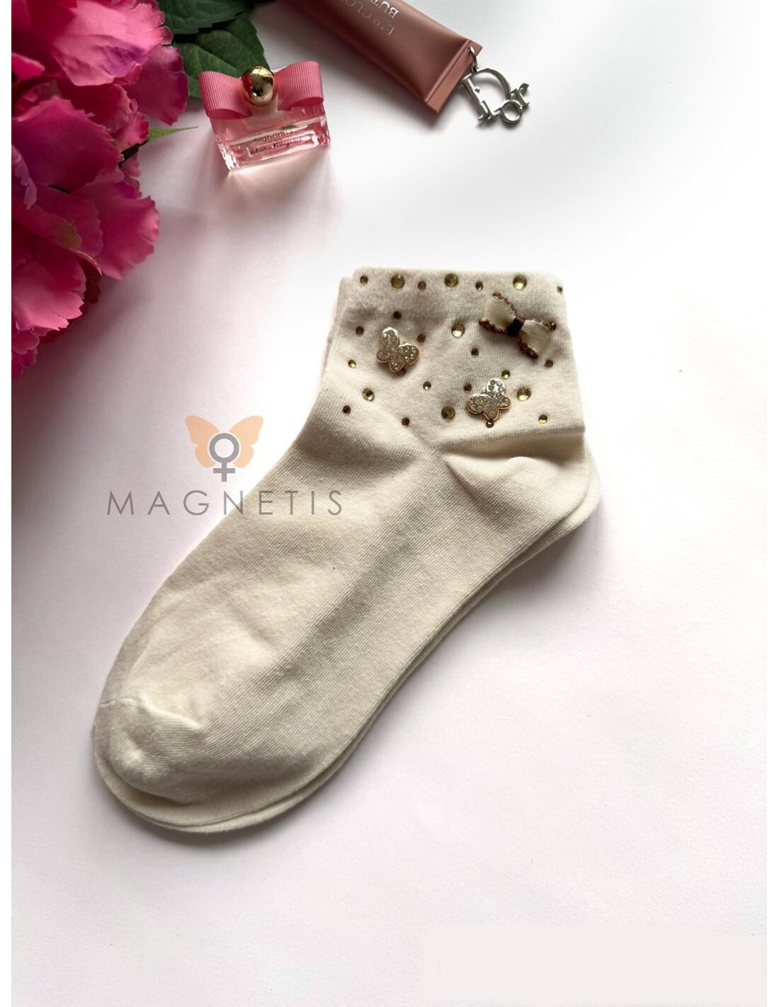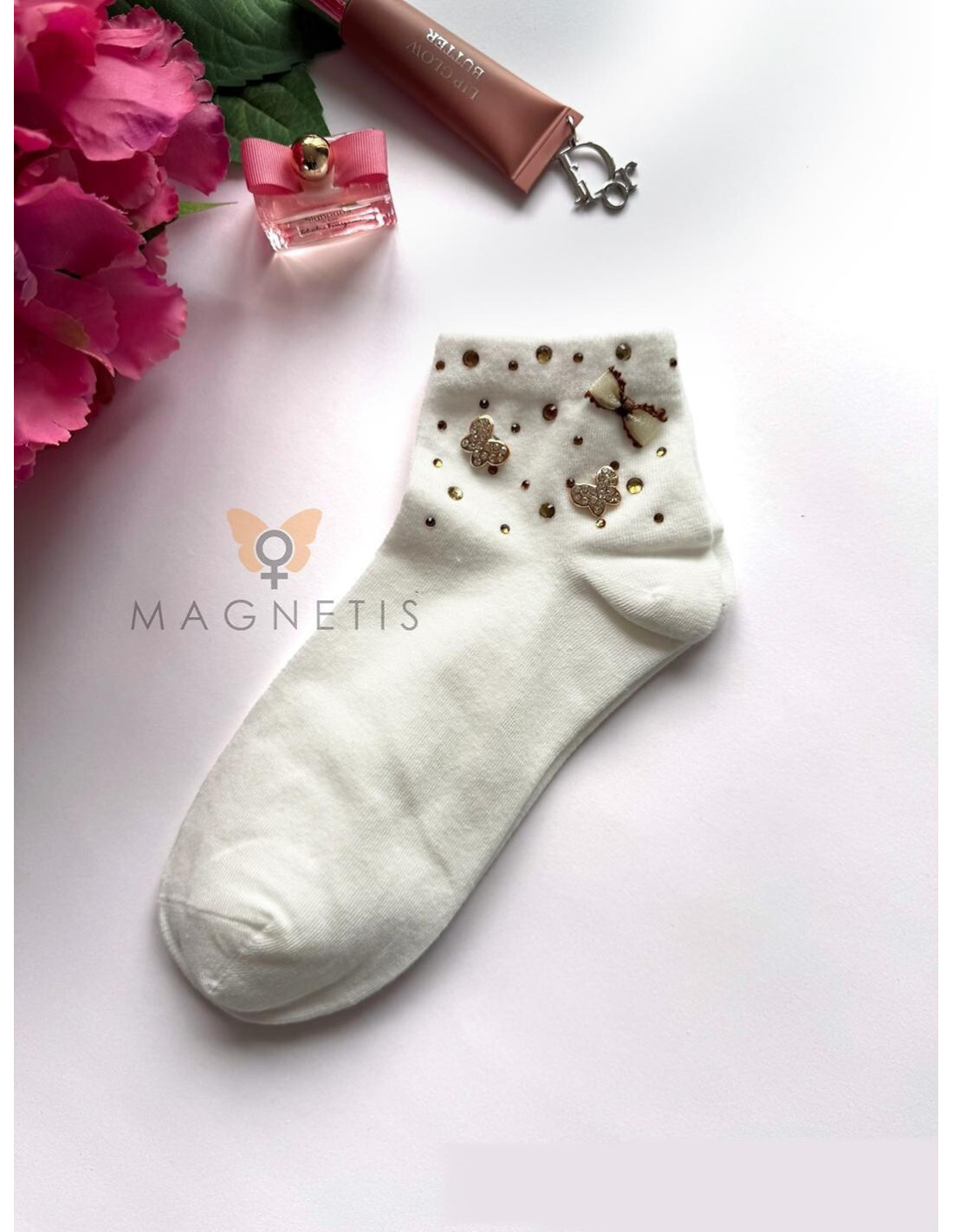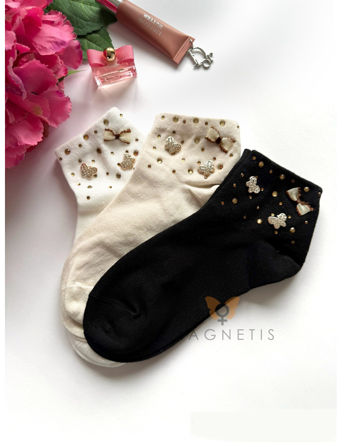 Zakostki damskie - gładka dzianina bawełniana - ściągacz zdobią naszyte połyskujące motylki, kokardka i cyrkonie - idealiai przylegają do stopy - bardzo miłe w dotyku