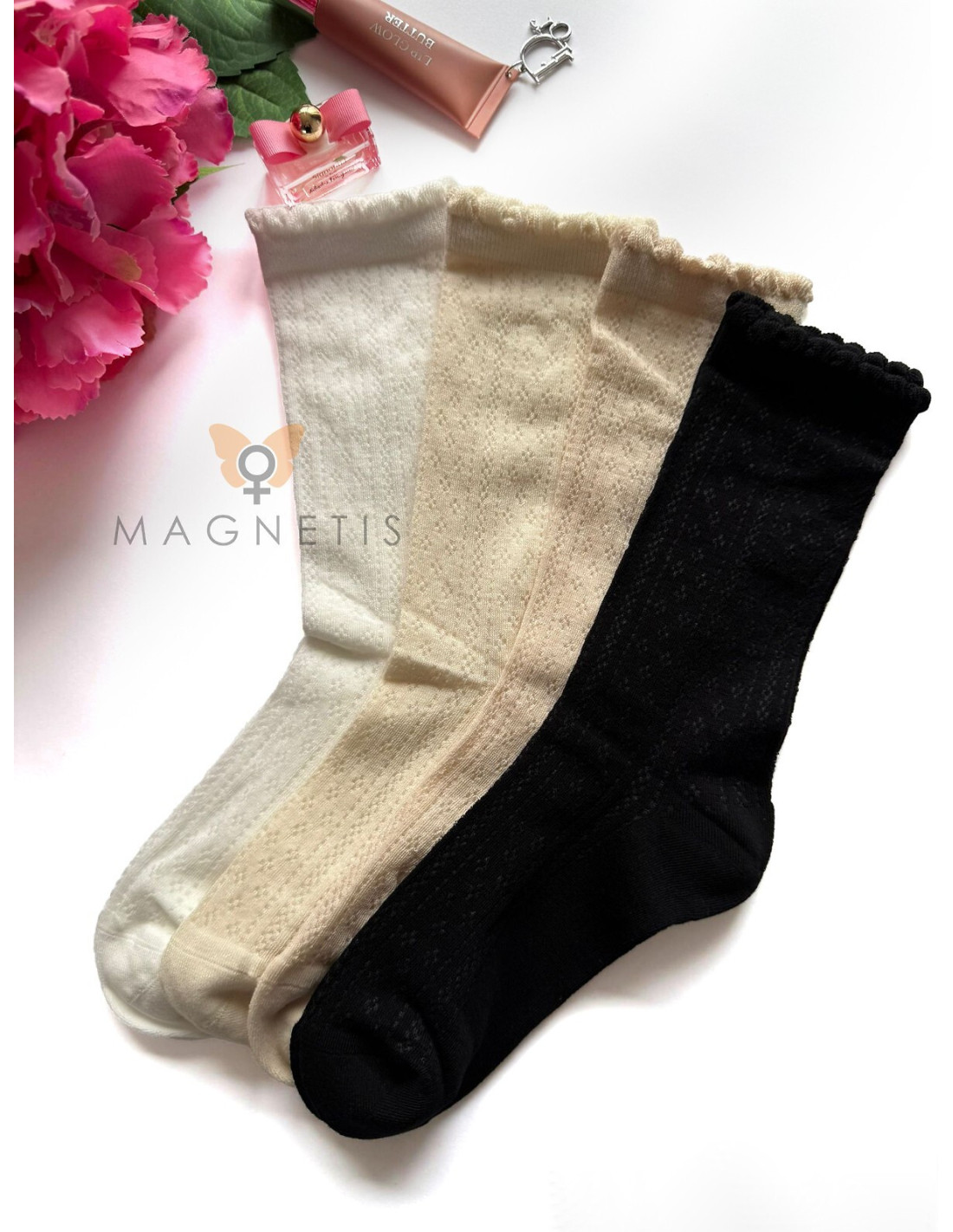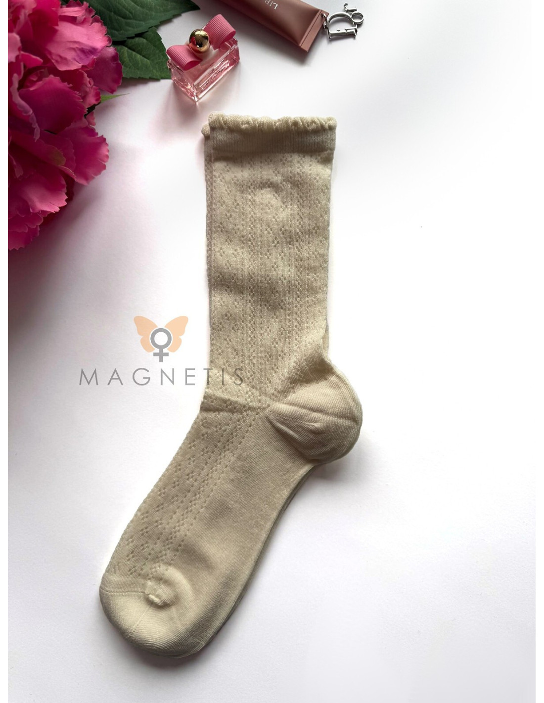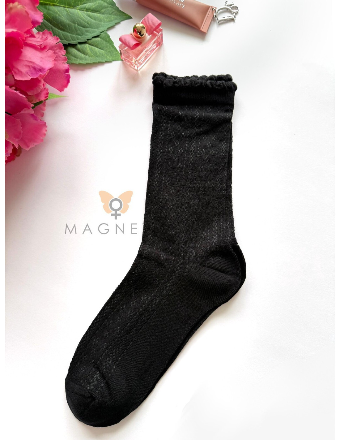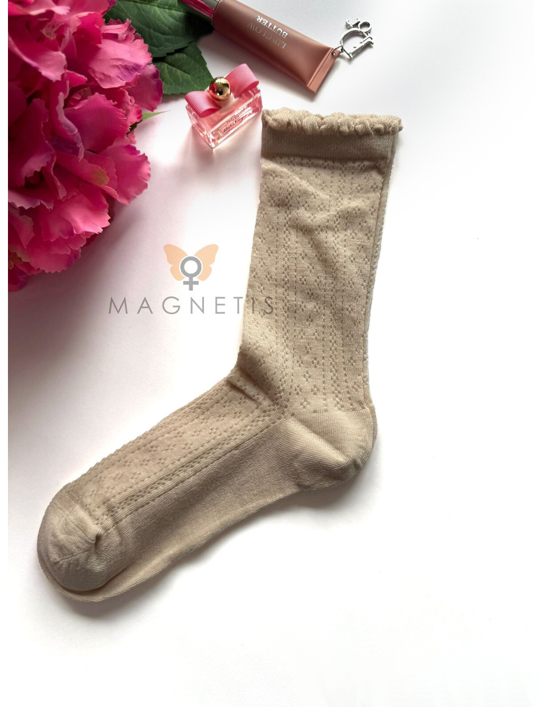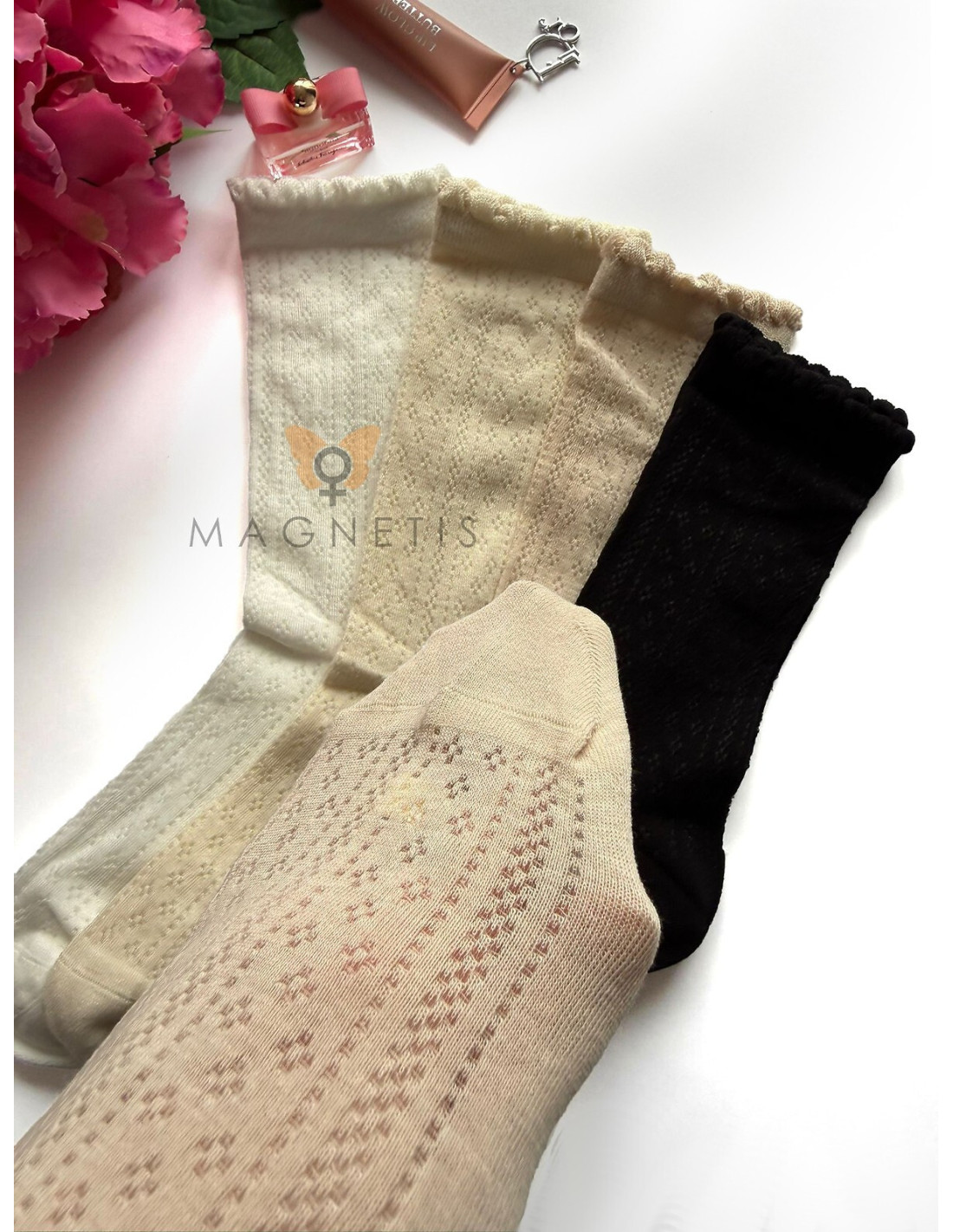 Skarpety damskie - wykonane z ażurowej bawełny - ściągacz wykończony falbanką - idealiai przylegają do stopy - bardzo miłe w dotyku