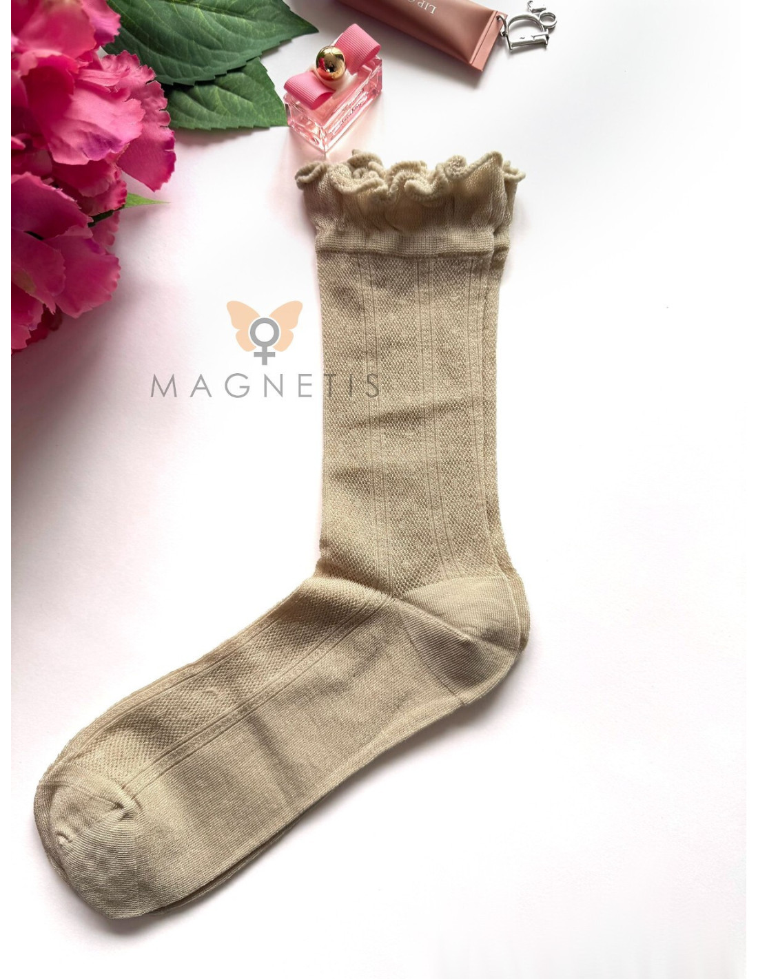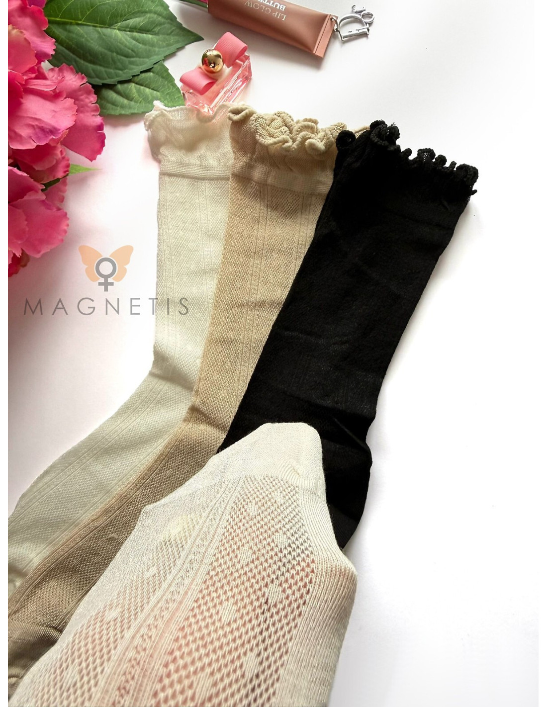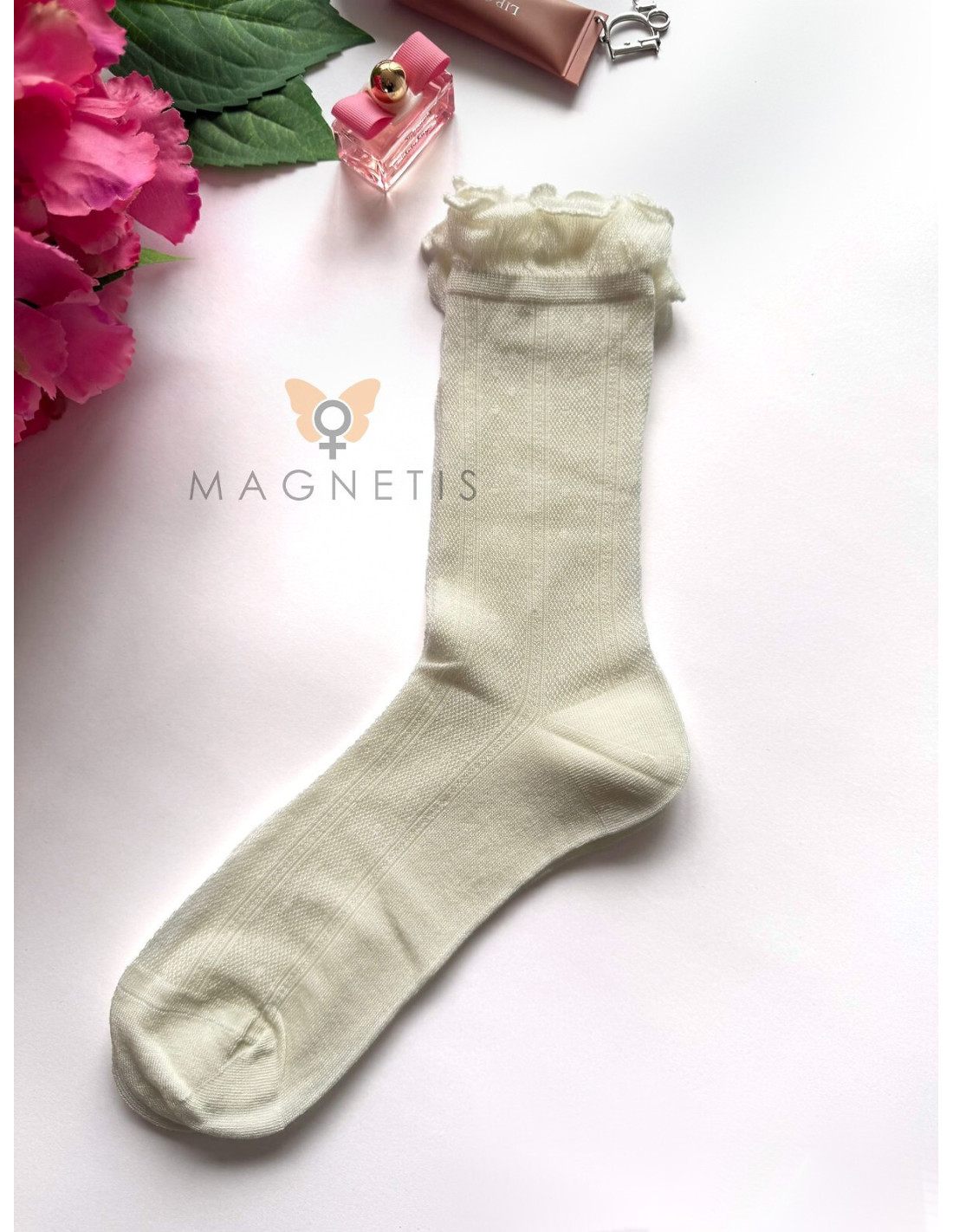 Skarpety damskie - wykonane z ażurowej bawełny - ściągacz wykończony falbanką - idealiai przylegają do stopy - bardzo miłe w dotyku