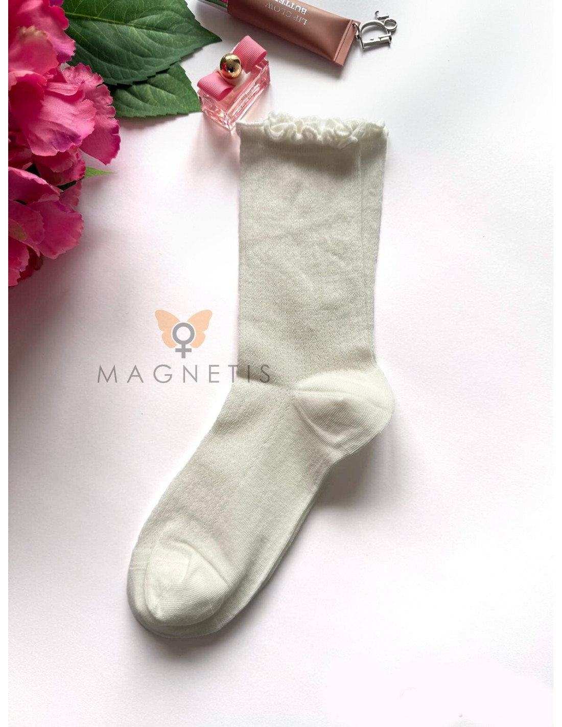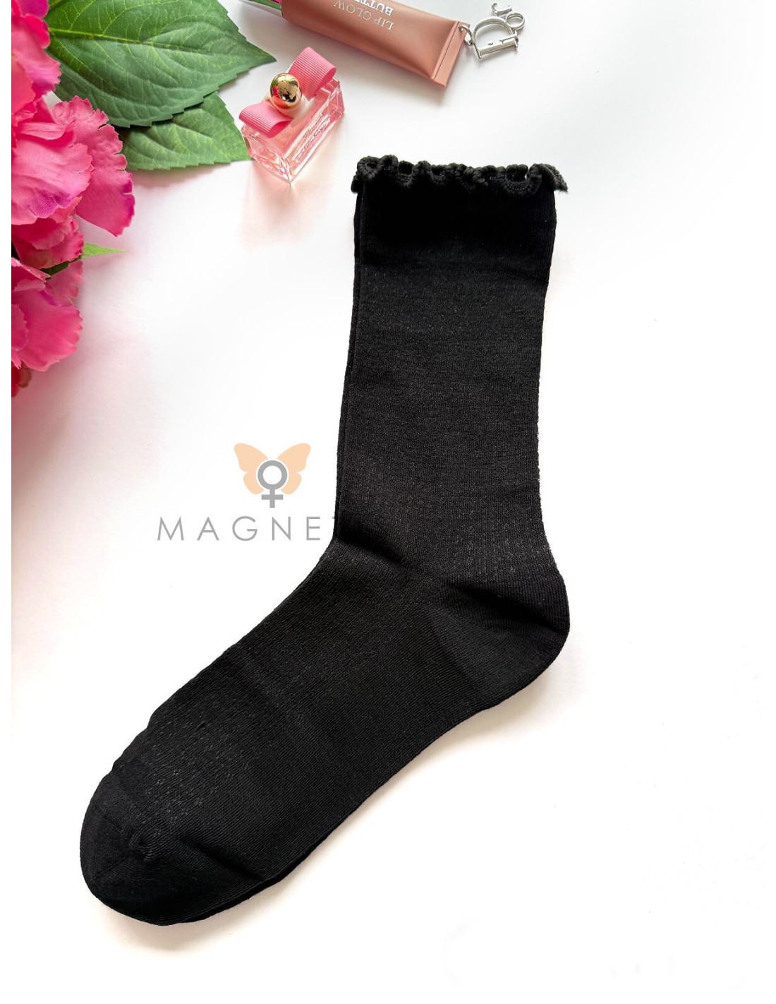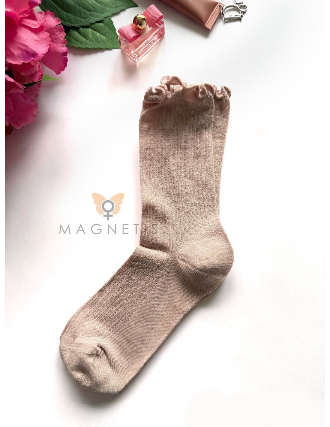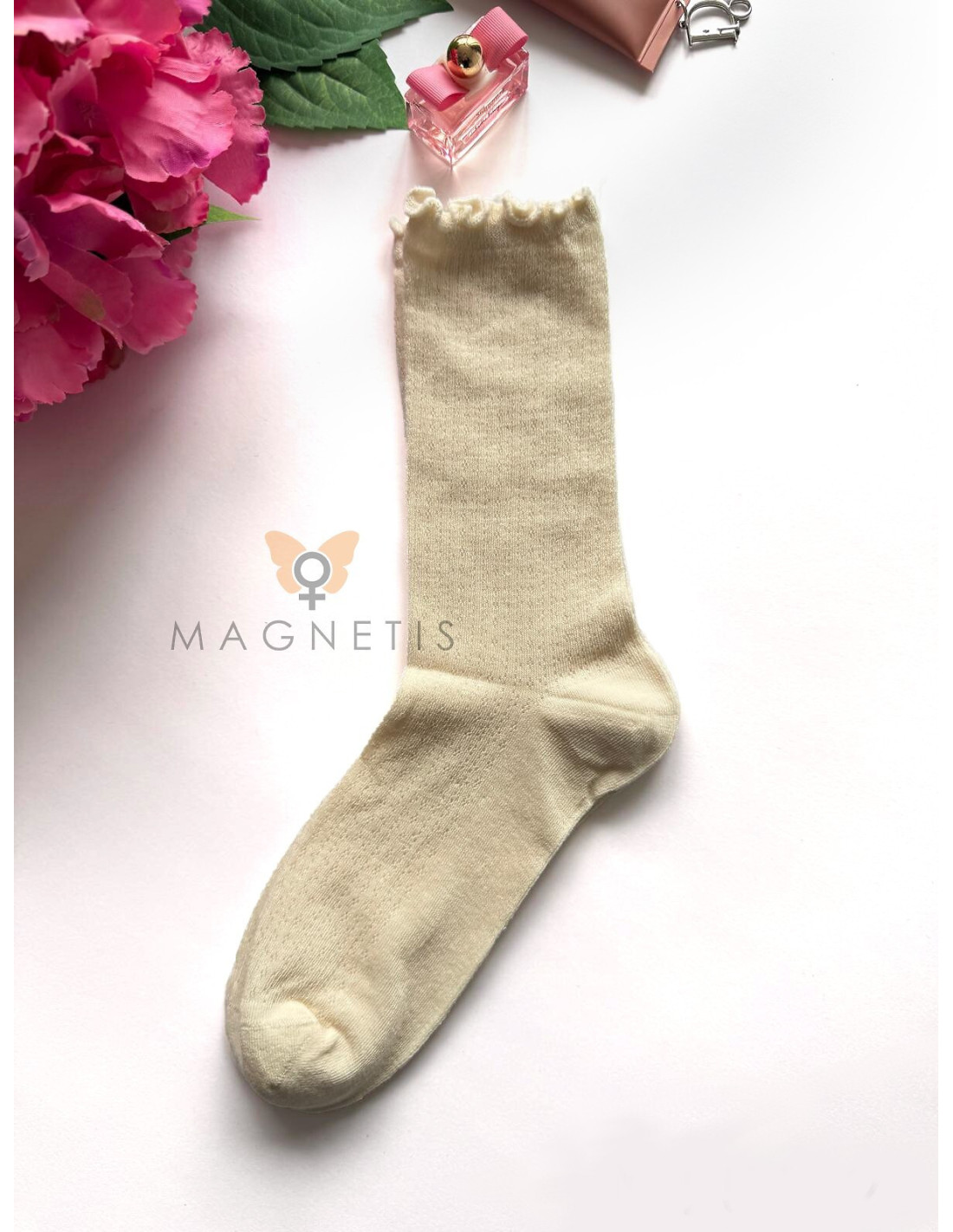 Skarpety damskie - wykonane bawełny - ozdobione ażurowym wzorem - ściągacz wykończony falbanką - idealiai przylegają do stopy - bardzo miłe w dotyku