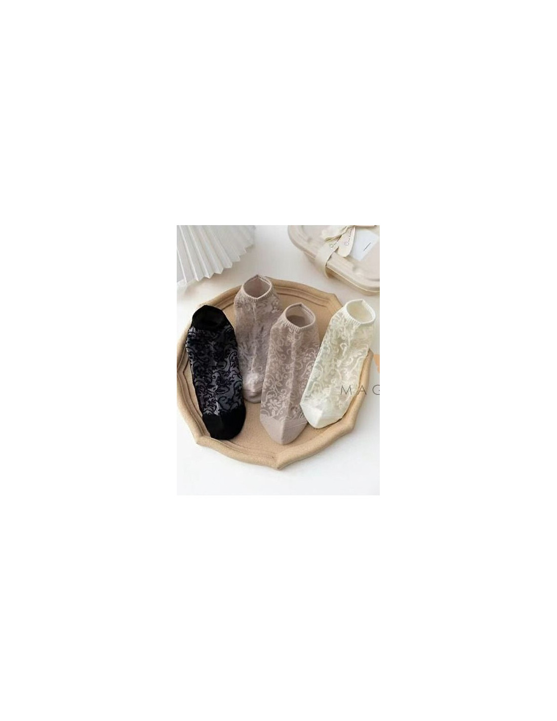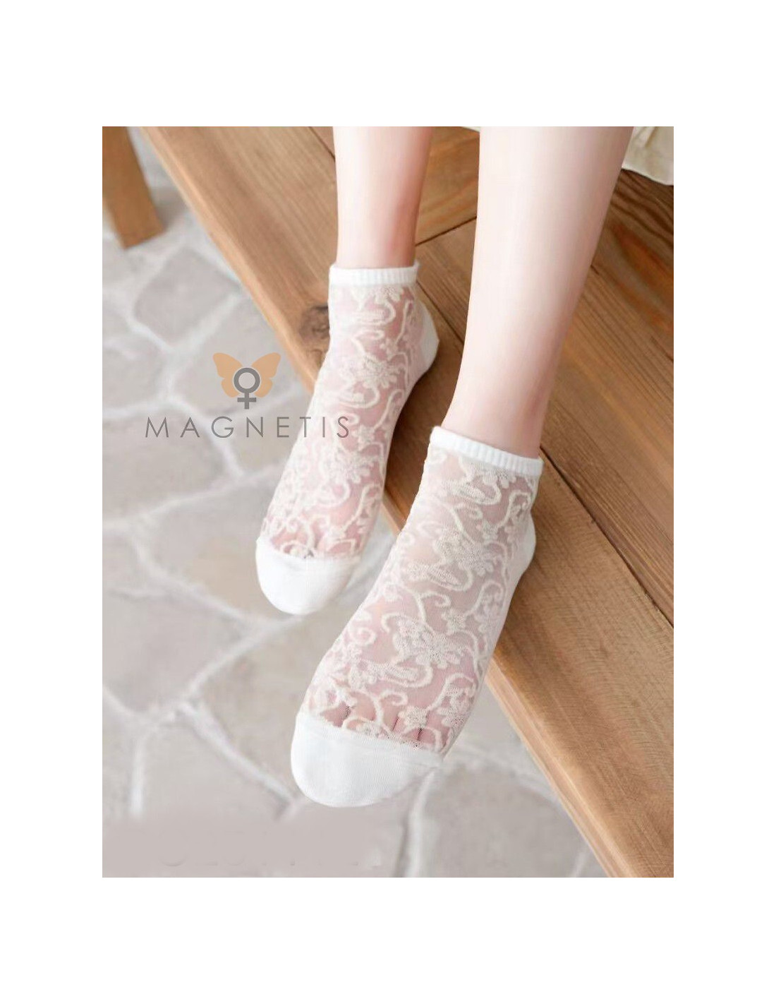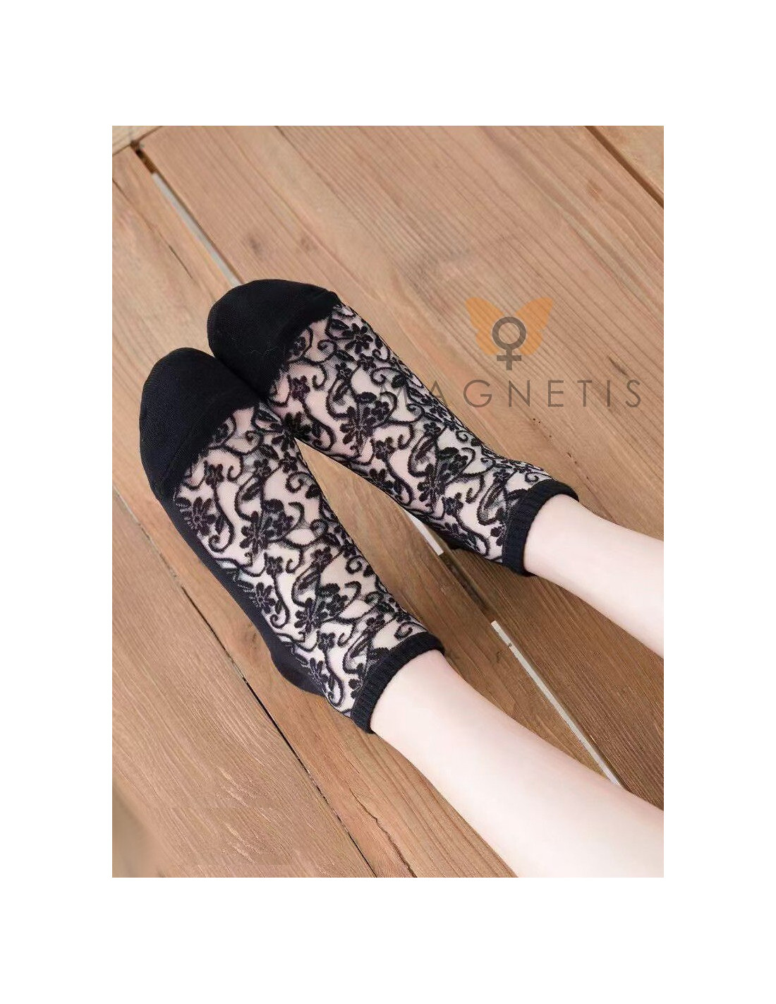 Fantazyjne stopki damskie - miękka siateczka w połączeniu z kwiatowym wzorem - zaznaczona linia podeszwy, pięty, palców i ściągacza