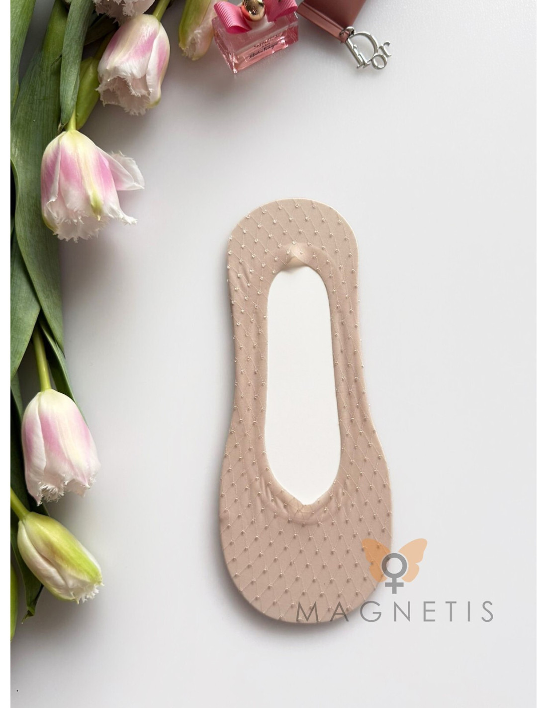 Balerinos damskie - z elastycznej koronki - wzór w drobne kropeczki - wykończone cienkim paskiem silikonu - podeszwa z gładkiej bawełny z ABS - idealiai dopasowują się do stopy - chronią przed otarciami