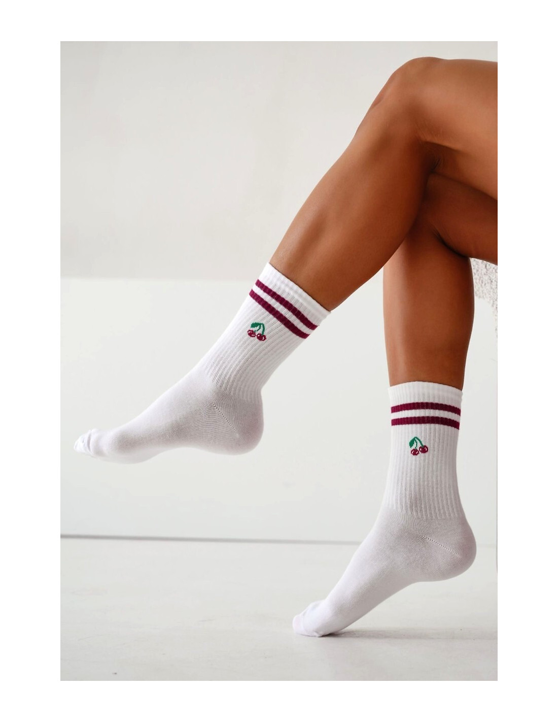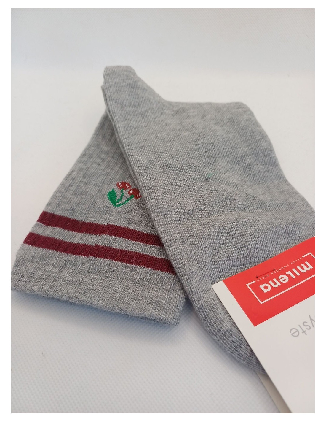 Skarpety damskie - z wysokiej kokybės przędzy bawełnianej - cholewka ozdobiona kolorowym wzorem z wiśniami - płaskie szwy - prążkowana cholewka