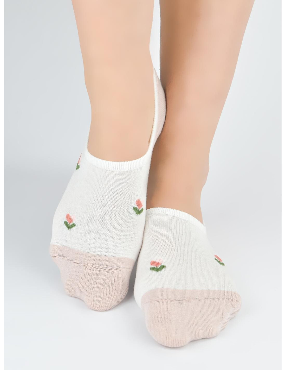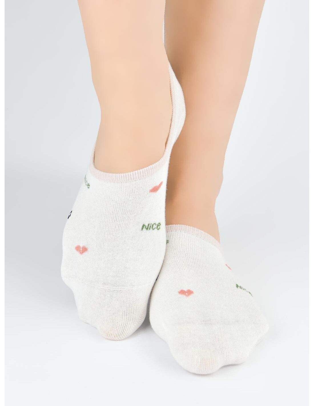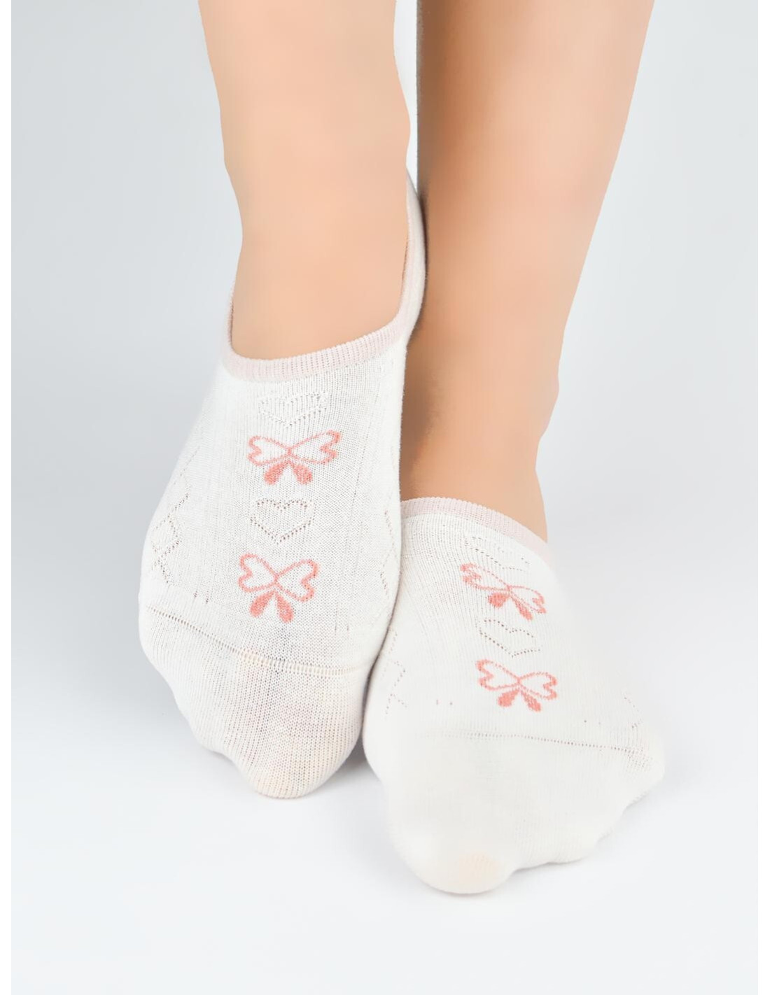 Bawełniane baleriny damskie - płaskie szwy, nieuciskający ściągacz - na pięcie od wewnętrznej strony silikon zapobiegający zsuwaniu - dostępny kolor ecru, ozdobiony wzorami w paski, kwiatki, serduszka i kokardki