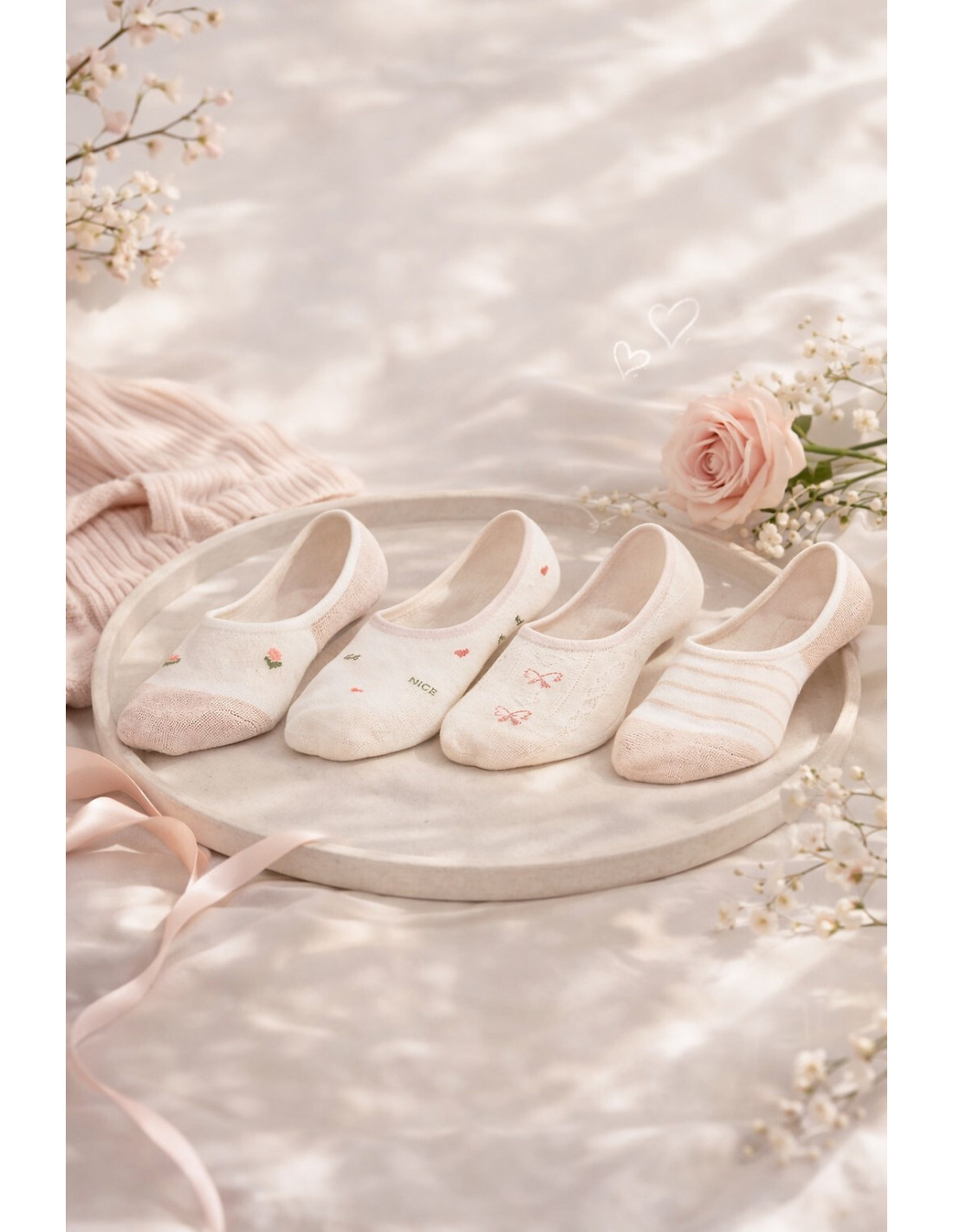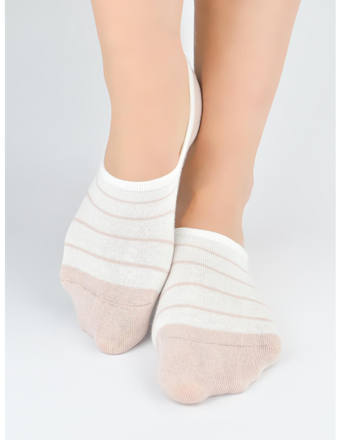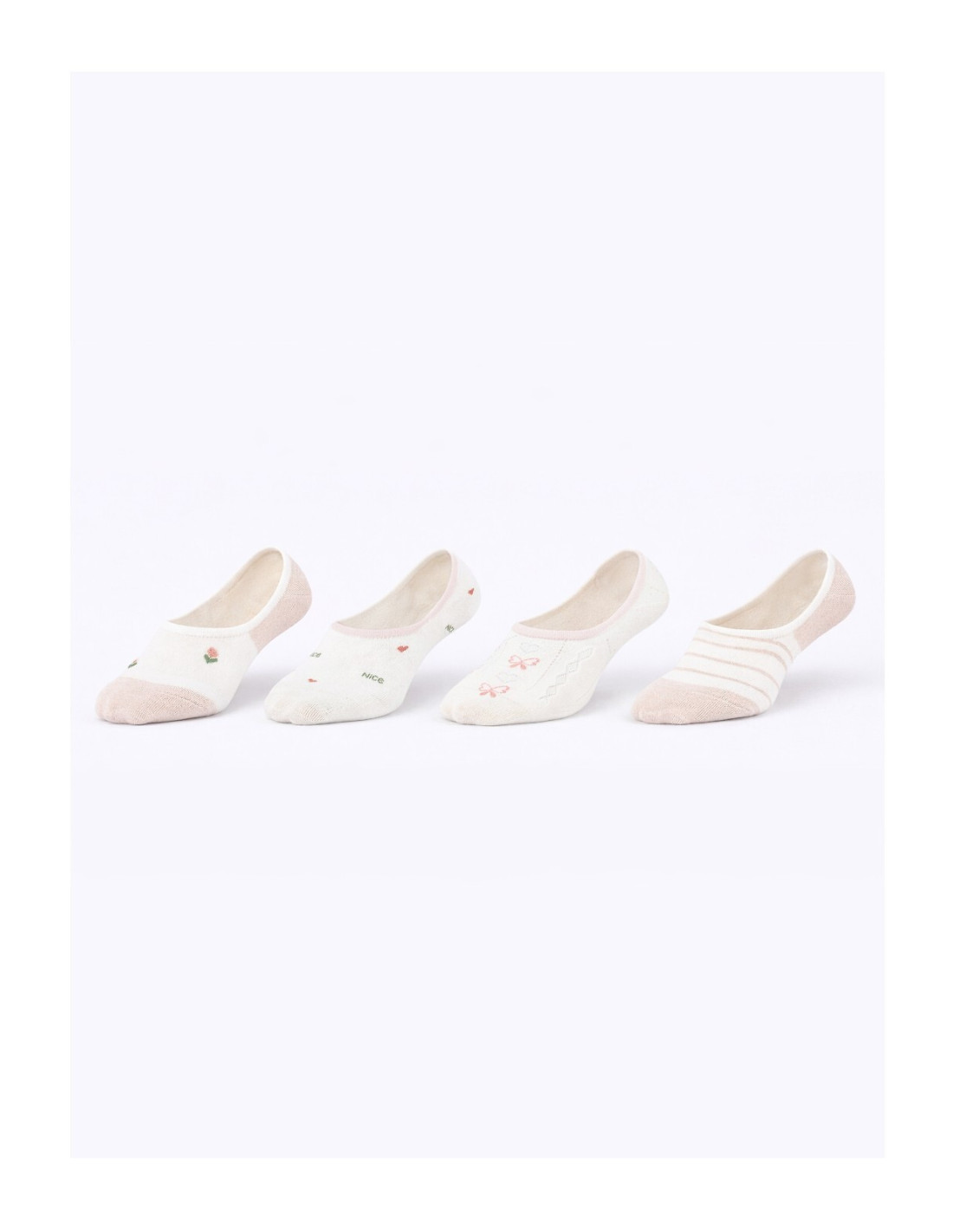 Bawełniane baleriny damskie - płaskie szwy, nieuciskający ściągacz - na pięcie od wewnętrznej strony silikon zapobiegający zsuwaniu - dostępny kolor ecru, ozdobiony wzorami w paski, kwiatki, serduszka i kokardki