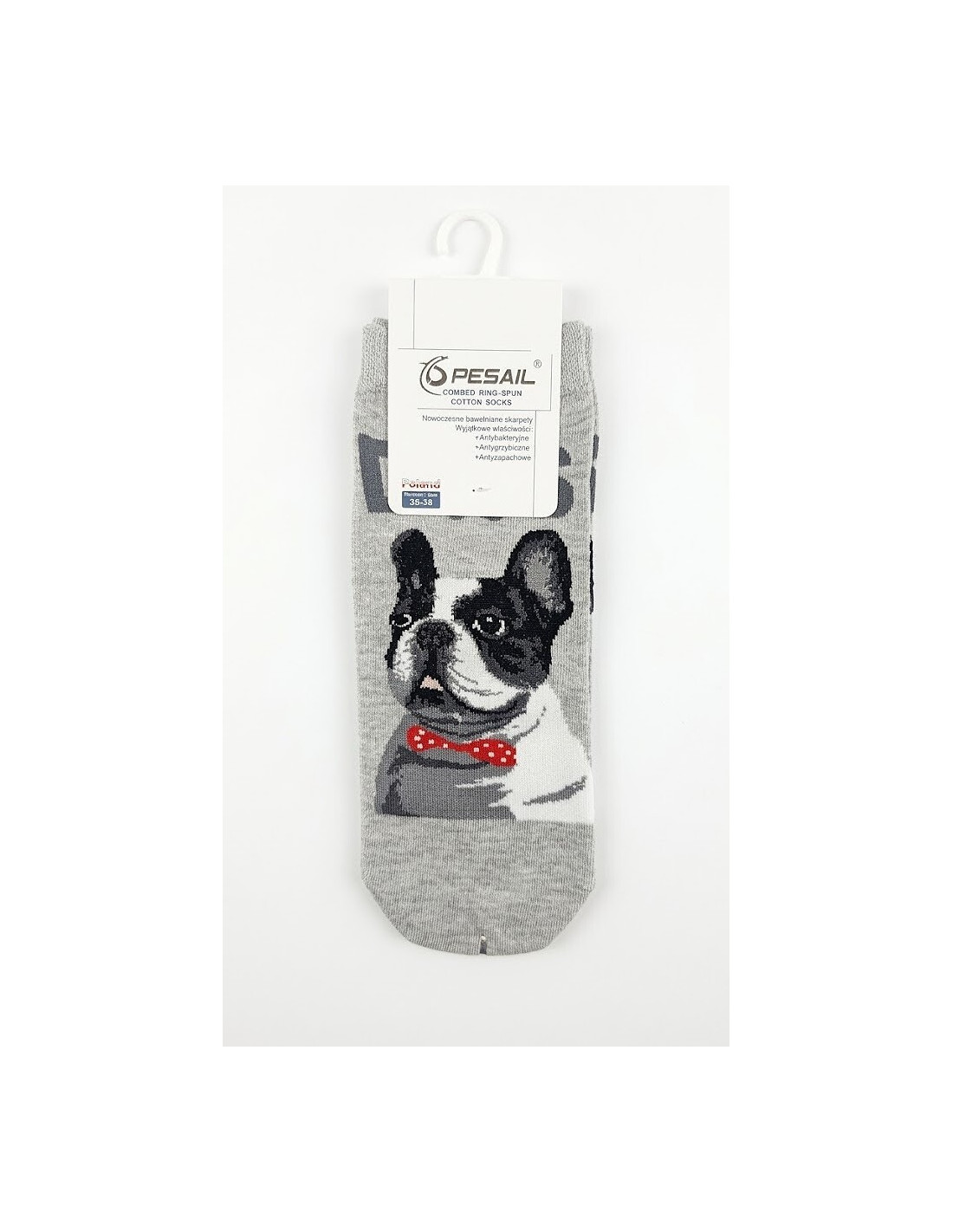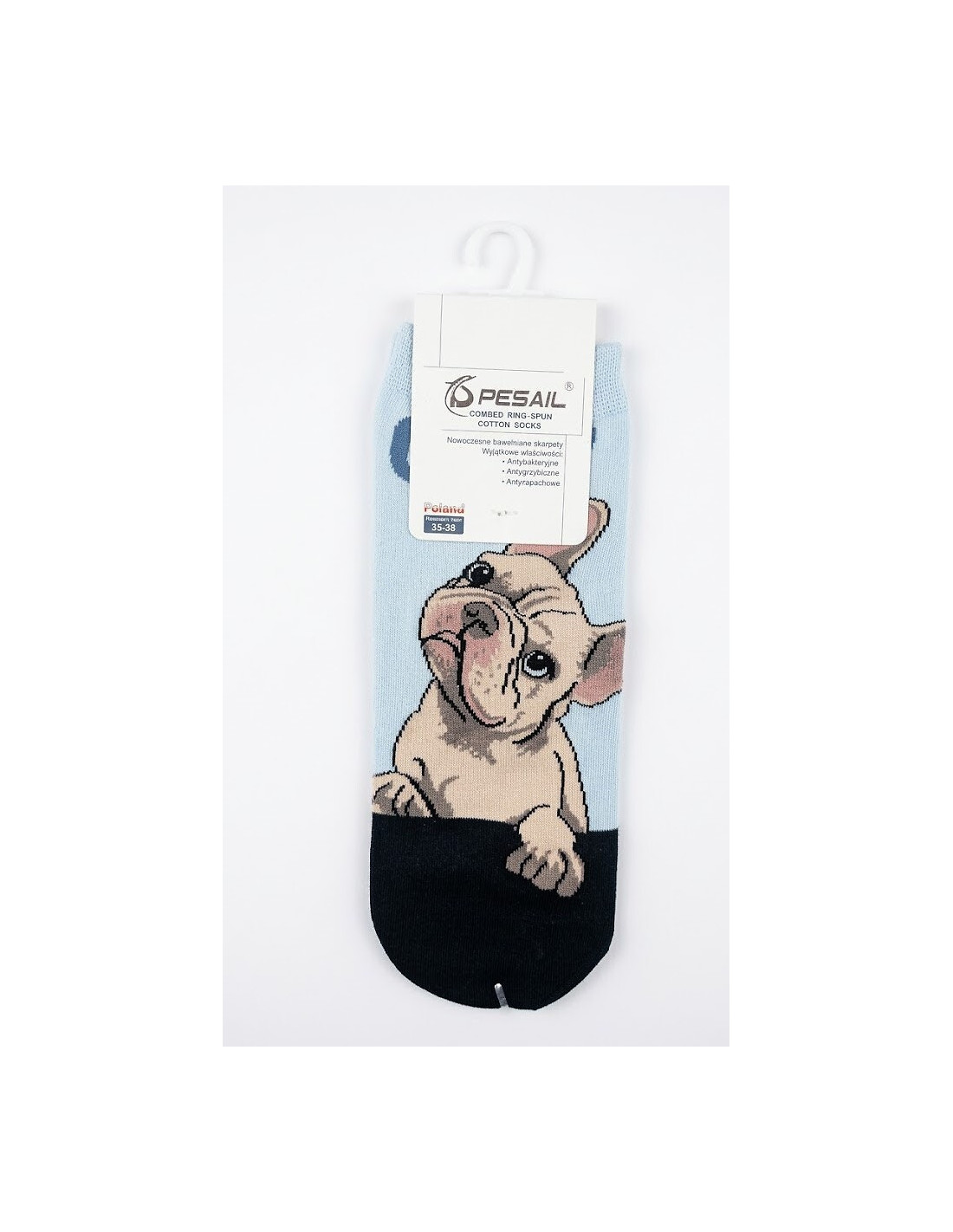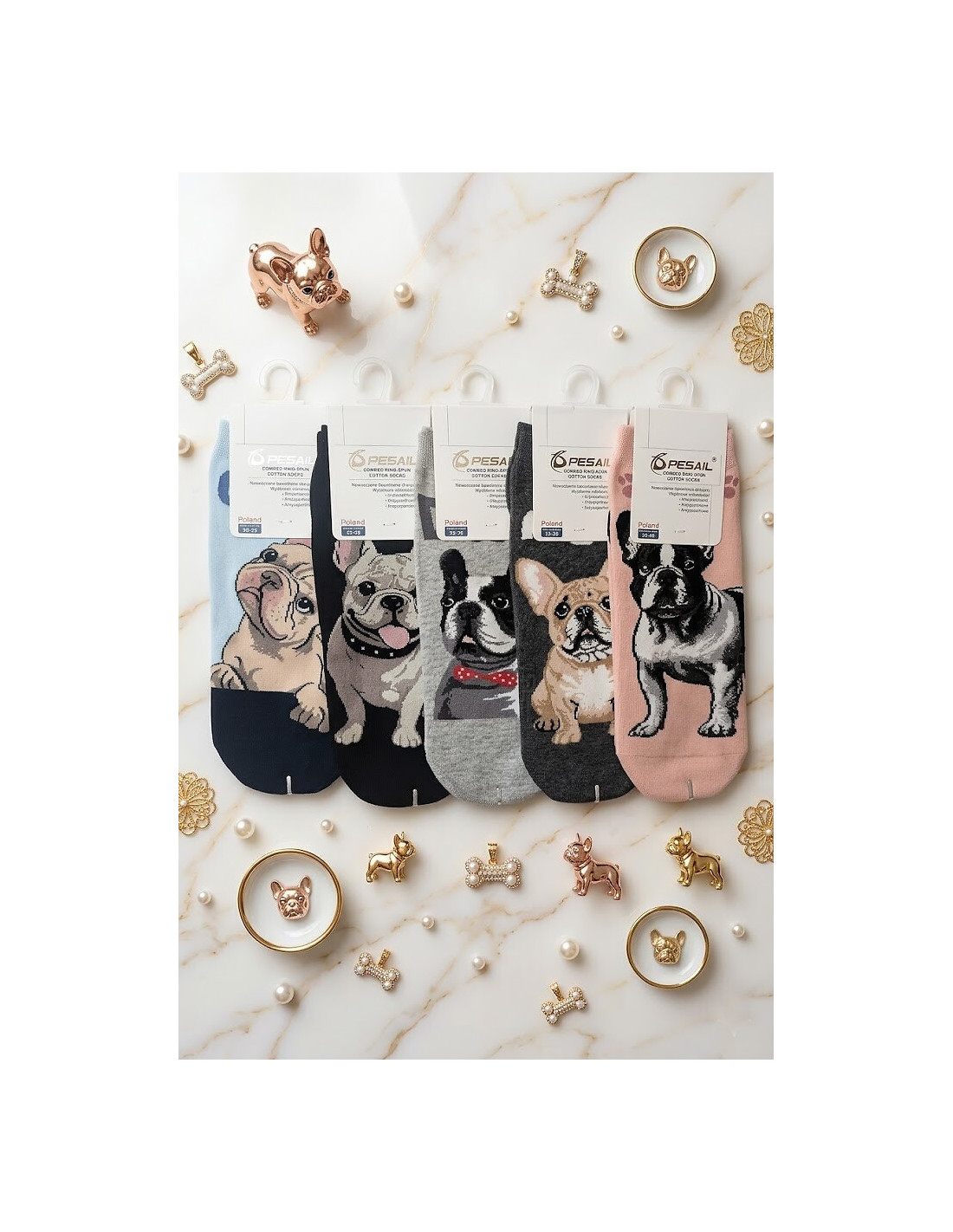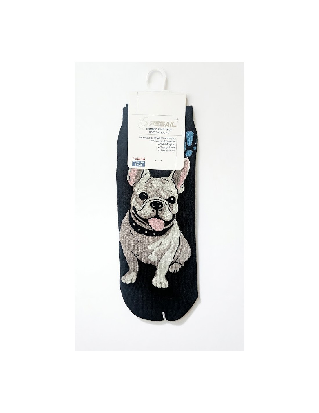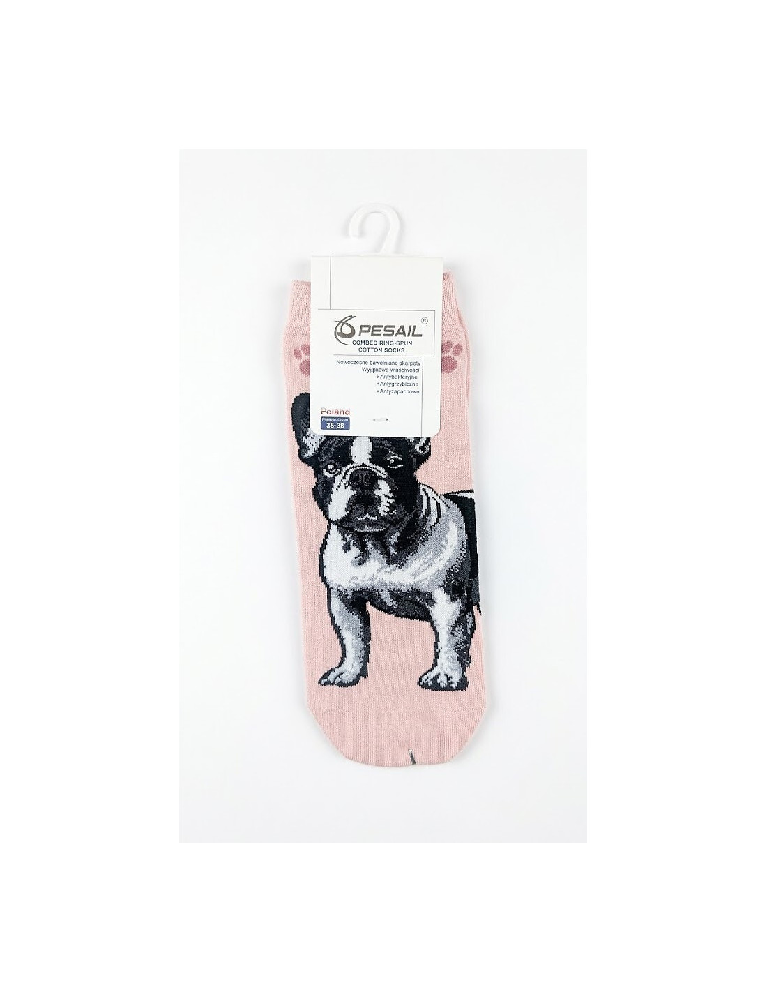 Bawełniane stopki damskie - delikatna w dotyku bawełna - nieuciskający ściągacz - ozdobione różnorodnym wzorem z psem rasy Buldog francuski - doskonale sprawdzą się w codziennych stylizacjach - idealiai dopasowują się do stóp