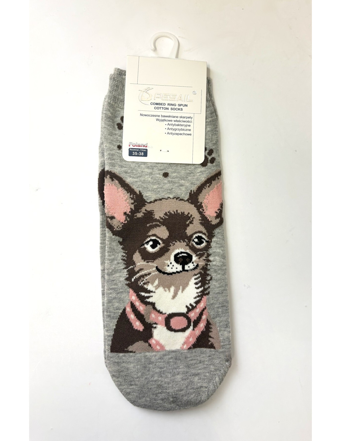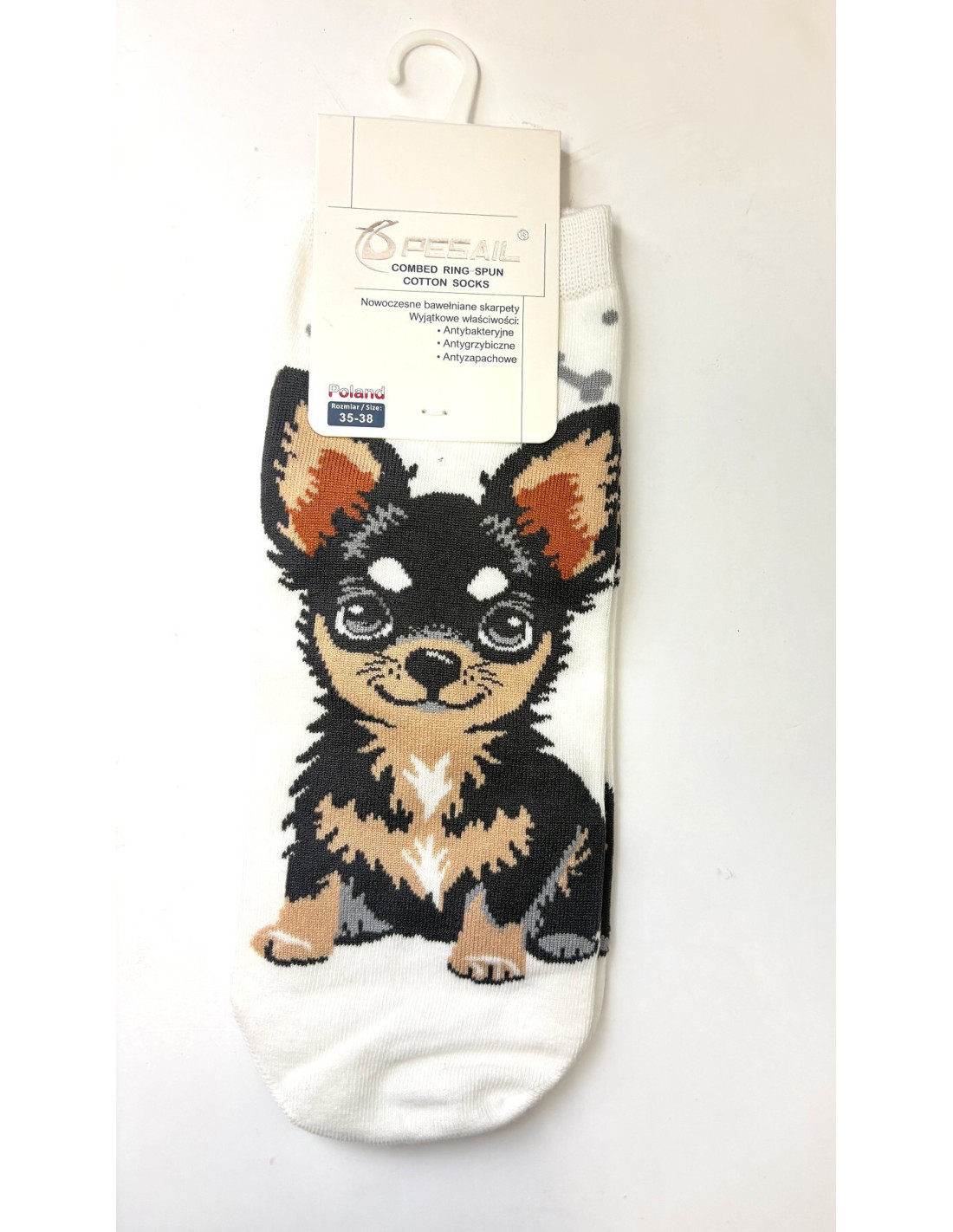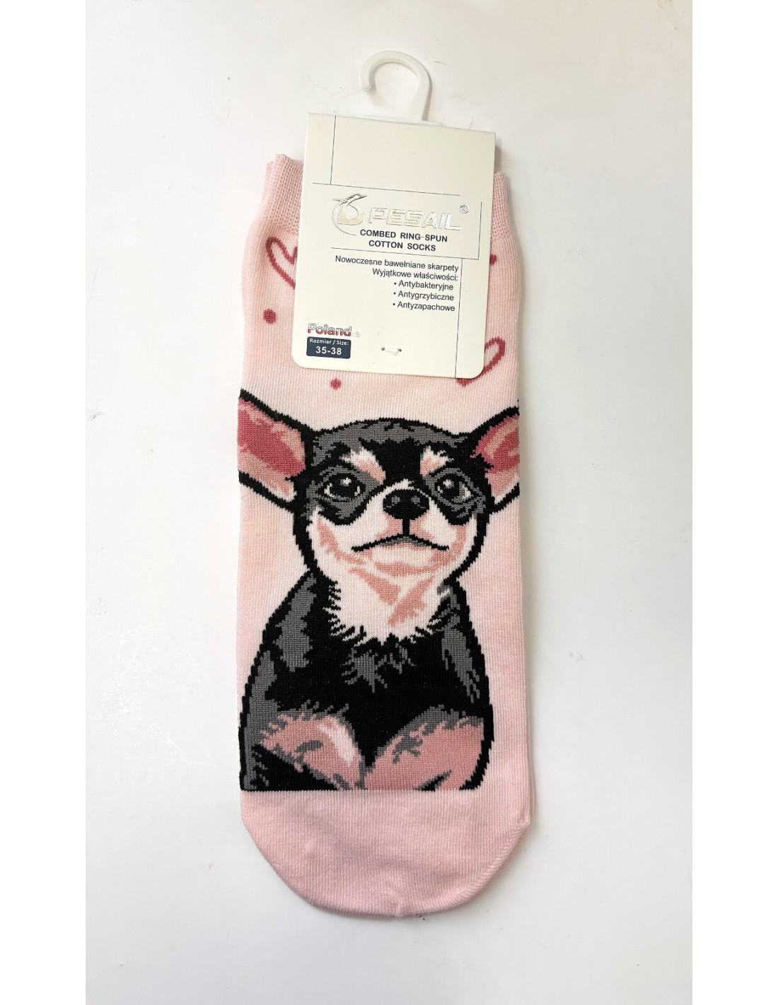 Bawełniane stopki damskie - delikatna w dotyku bawełna - nieuciskający ściągacz - ozdobione różnorodnym wzorem z psem rasy Chihuahua - doskonale sprawdzą się w codziennych stylizacjach - idealiai dopasowują się do stóp