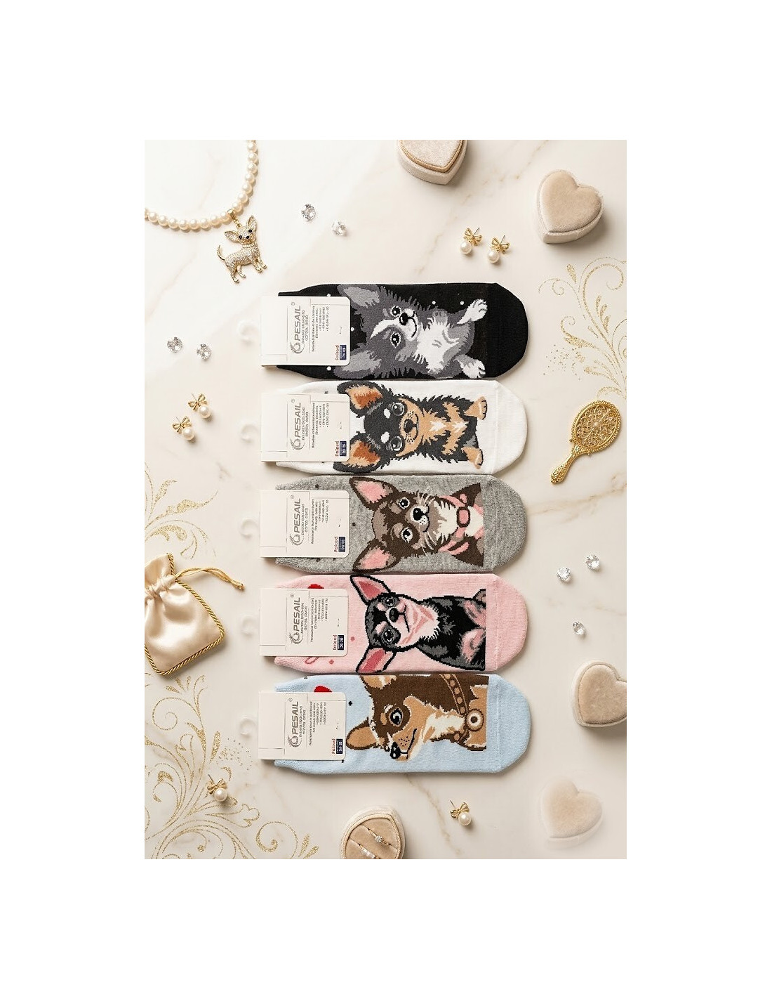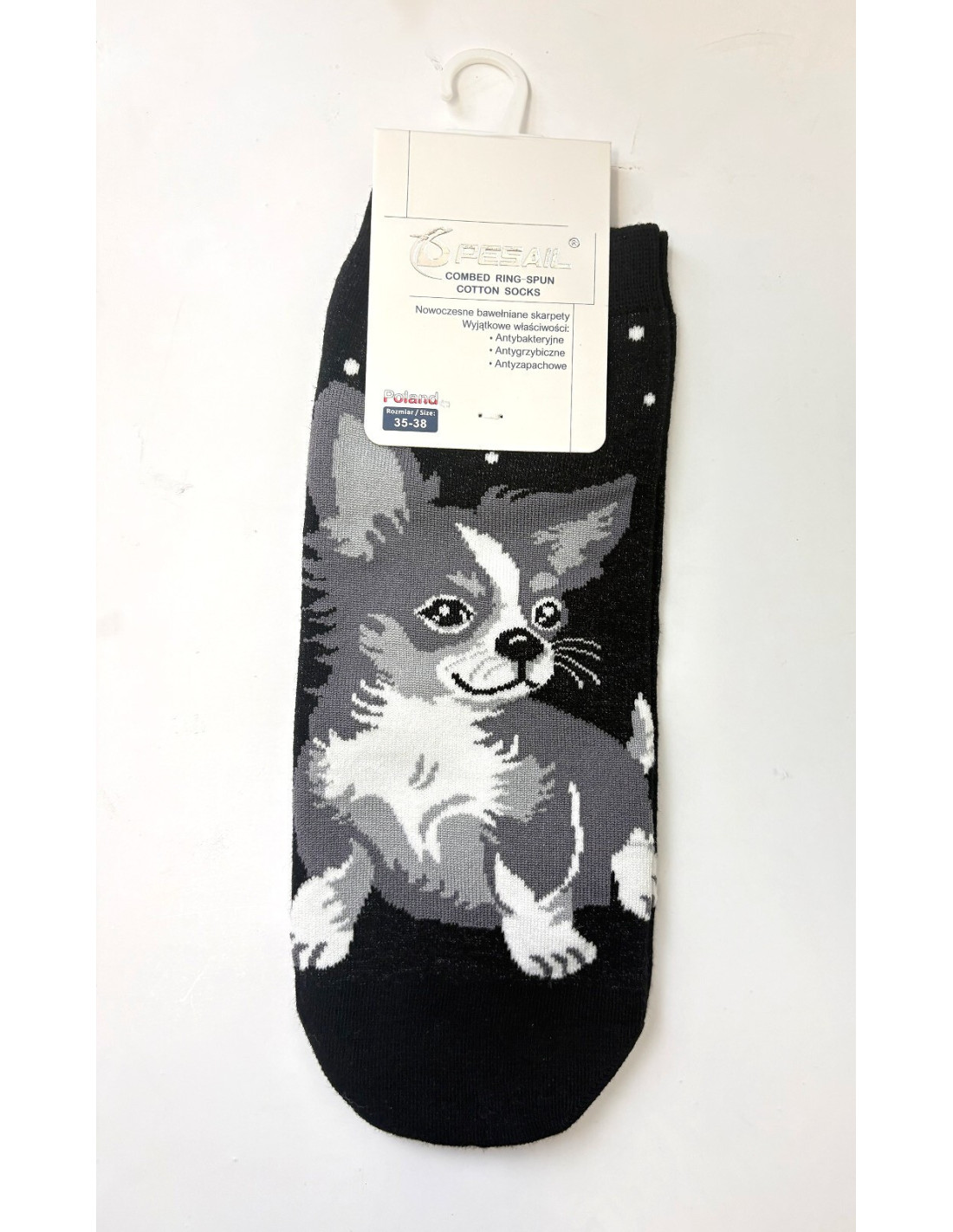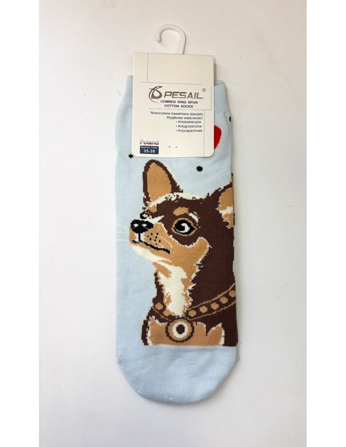 Bawełniane stopki damskie - delikatna w dotyku bawełna - nieuciskający ściągacz - ozdobione różnorodnym wzorem z psem rasy Chihuahua - doskonale sprawdzą się w codziennych stylizacjach - idealiai dopasowują się do stóp