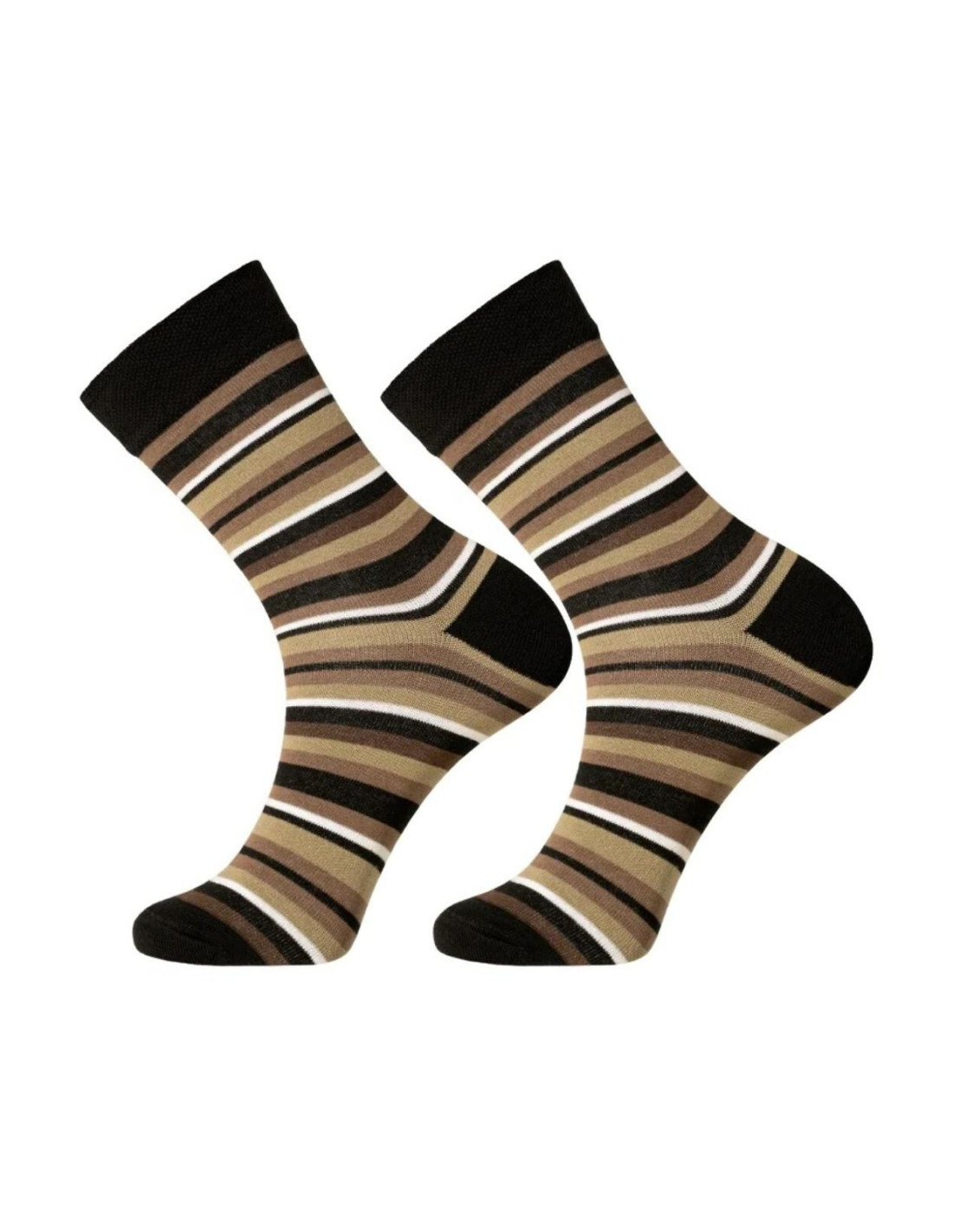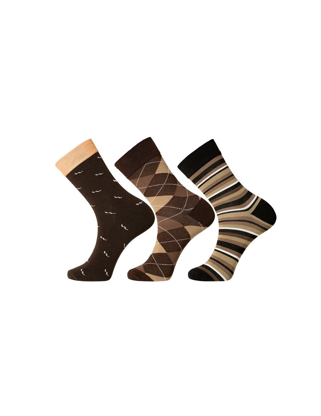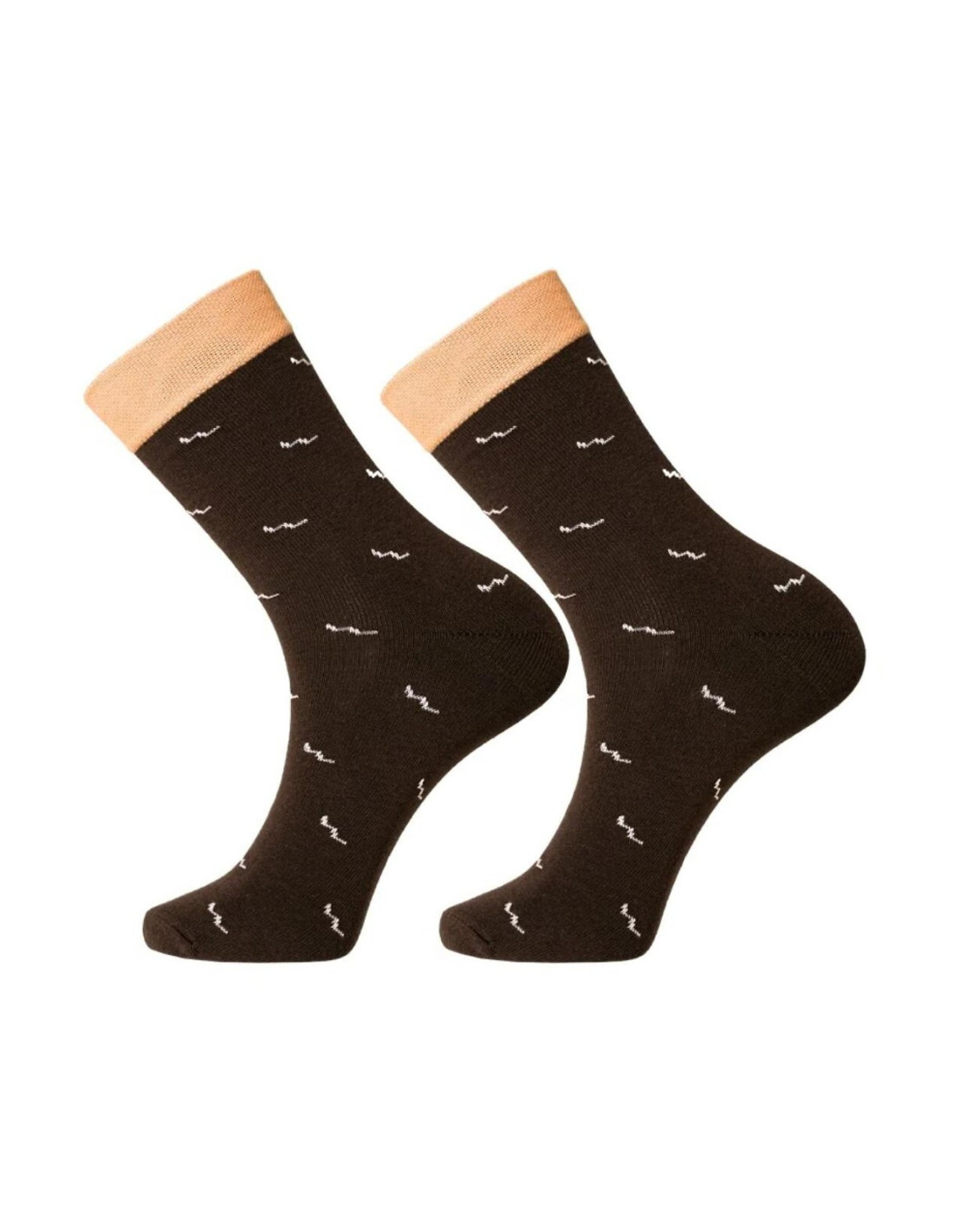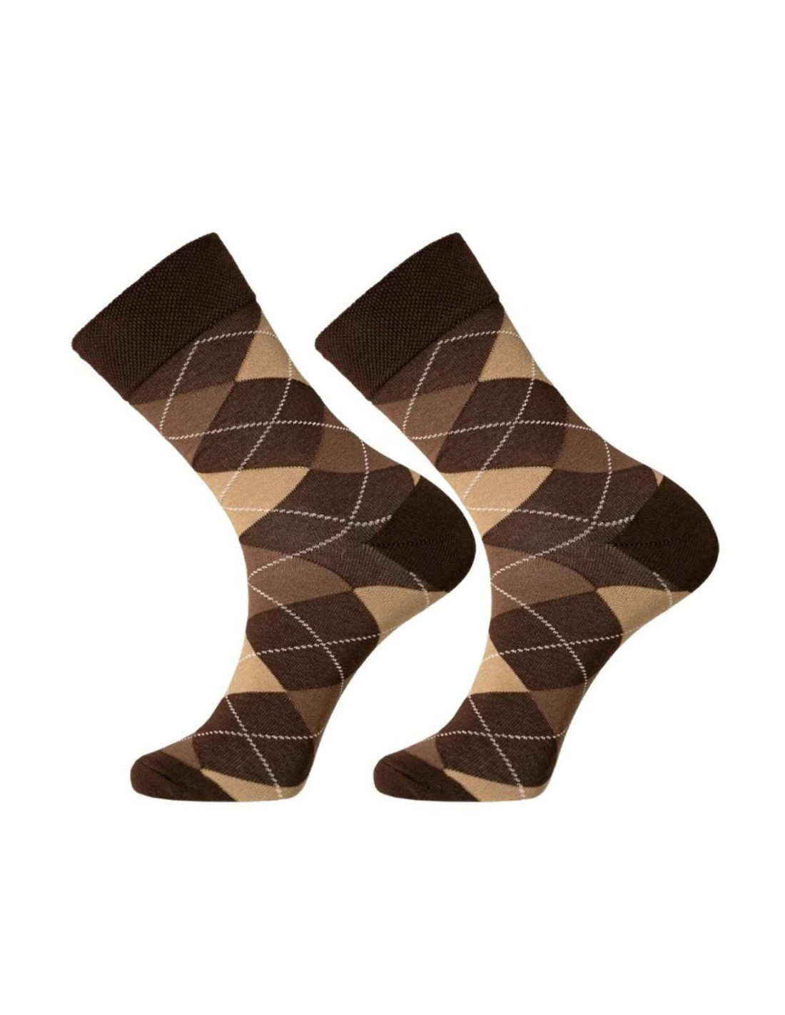 Bawełniane skarpety męskie - płaskie szwy, wygodny ściągacz - dostępny kolor brązowy/wzór w romby, paski, ptaki