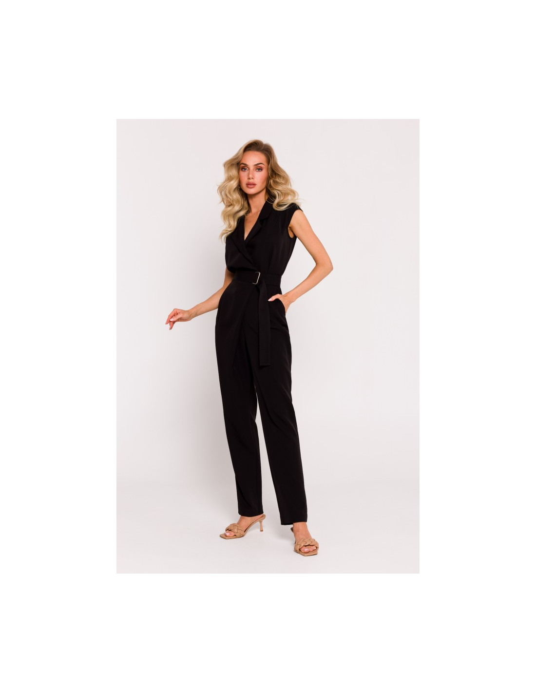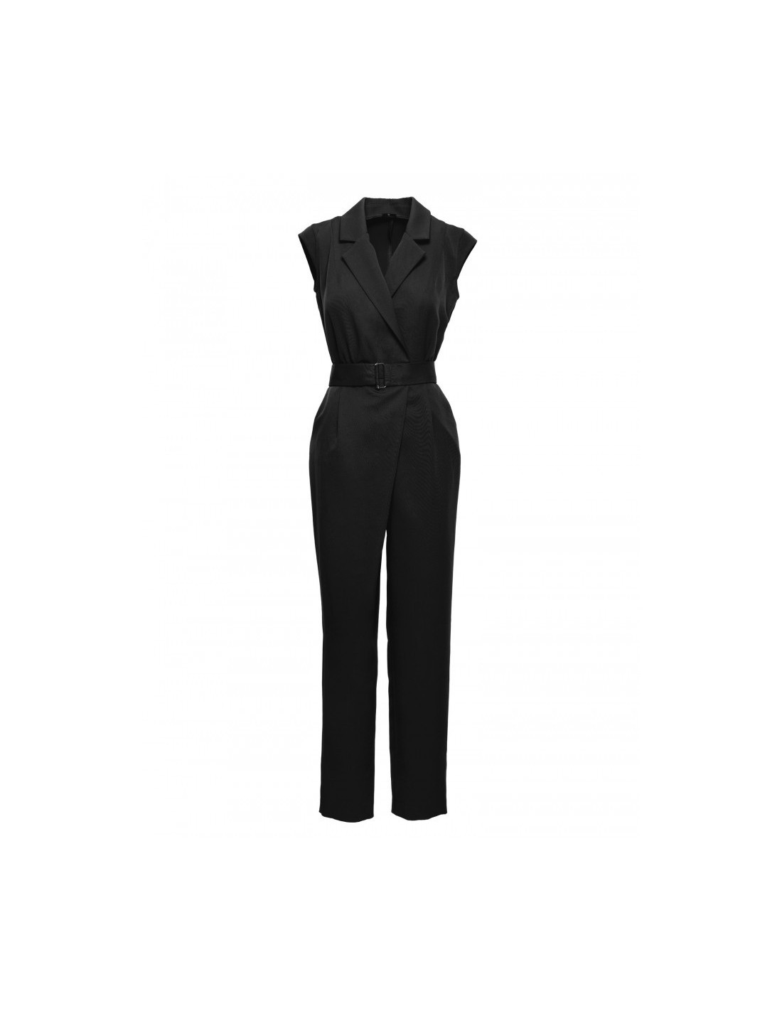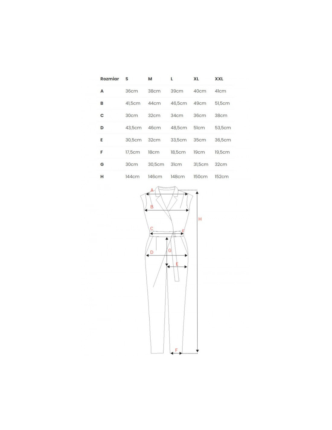 95% polyester 5% elastanase PRODUCT INFORMATION: woven fabric onepiece jumpsuit with asymmetrical design sleeveless wrap top with a collar and deep V neckline tapered leg snap fastening and a hidden zip in the front partailly elasticated waistline side pockets buckle belt attached our model is 171 cm tall and wears size S designed and made in Poland