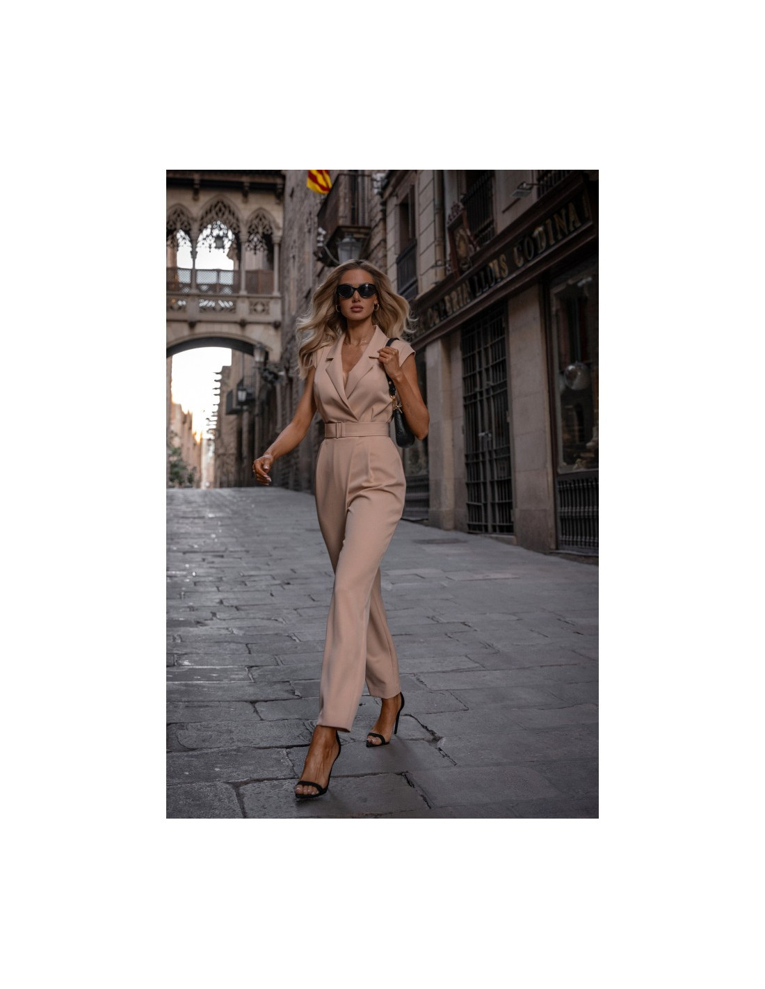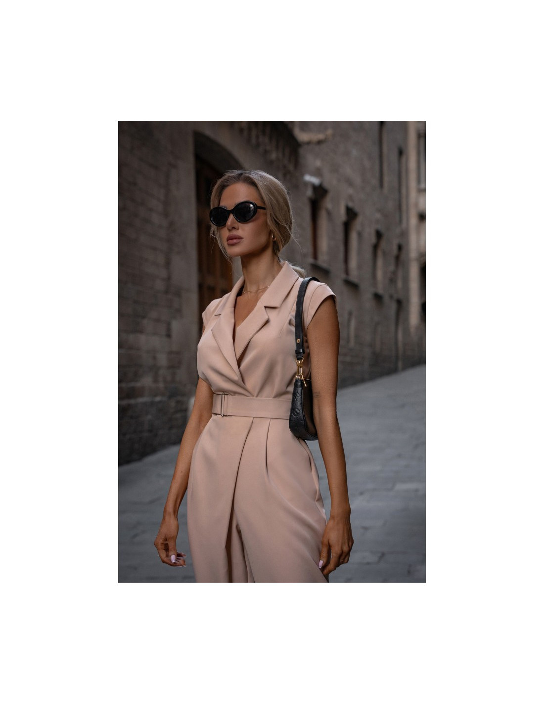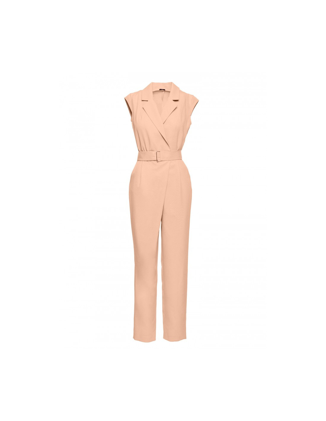 95% polyester 5% elastanase PRODUCT INFORMATION: woven fabric onepiece jumpsuit with asymmetrical design sleeveless wrap top with a collar and deep V neckline tapered leg snap fastening and a hidden zip in the front partailly elasticated waistline side pockets buckle belt attached our model is 171 cm tall and wears size S designed and made in Poland