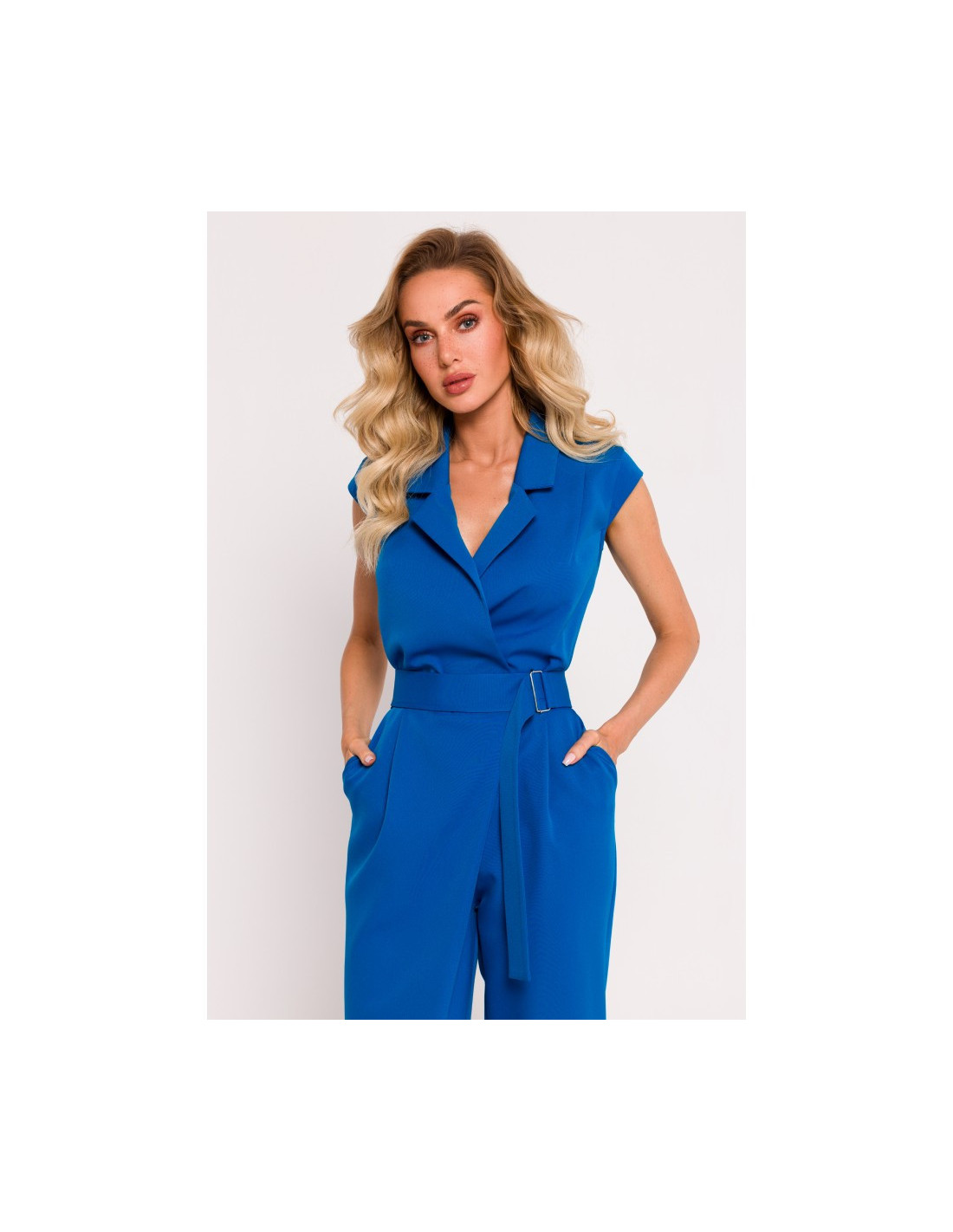 95% polyester 5% elastanase PRODUCT INFORMATION: woven fabric onepiece jumpsuit with asymmetrical design sleeveless wrap top with a collar and deep V neckline tapered leg snap fastening and a hidden zip in the front partailly elasticated waistline side pockets buckle belt attached our model is 171 cm tall and wears size S designed and made in Poland