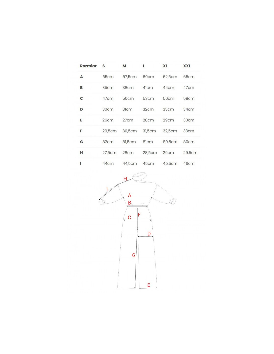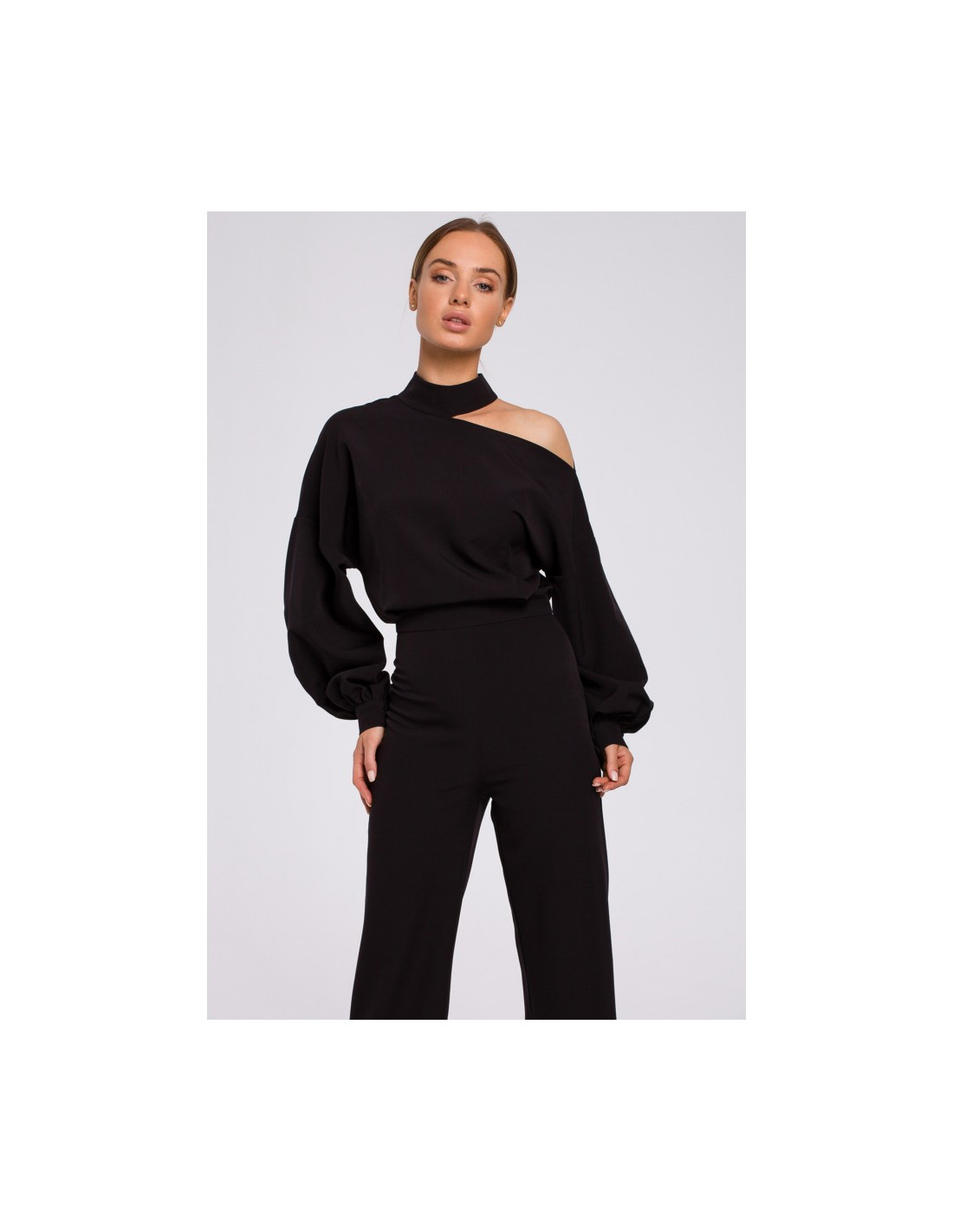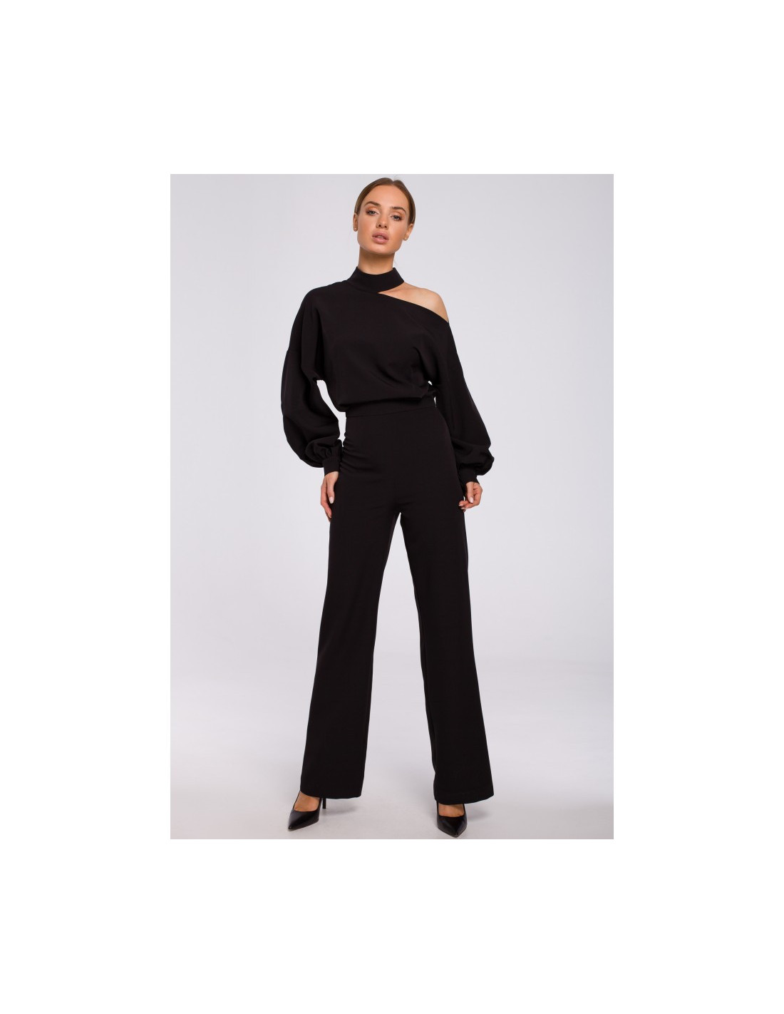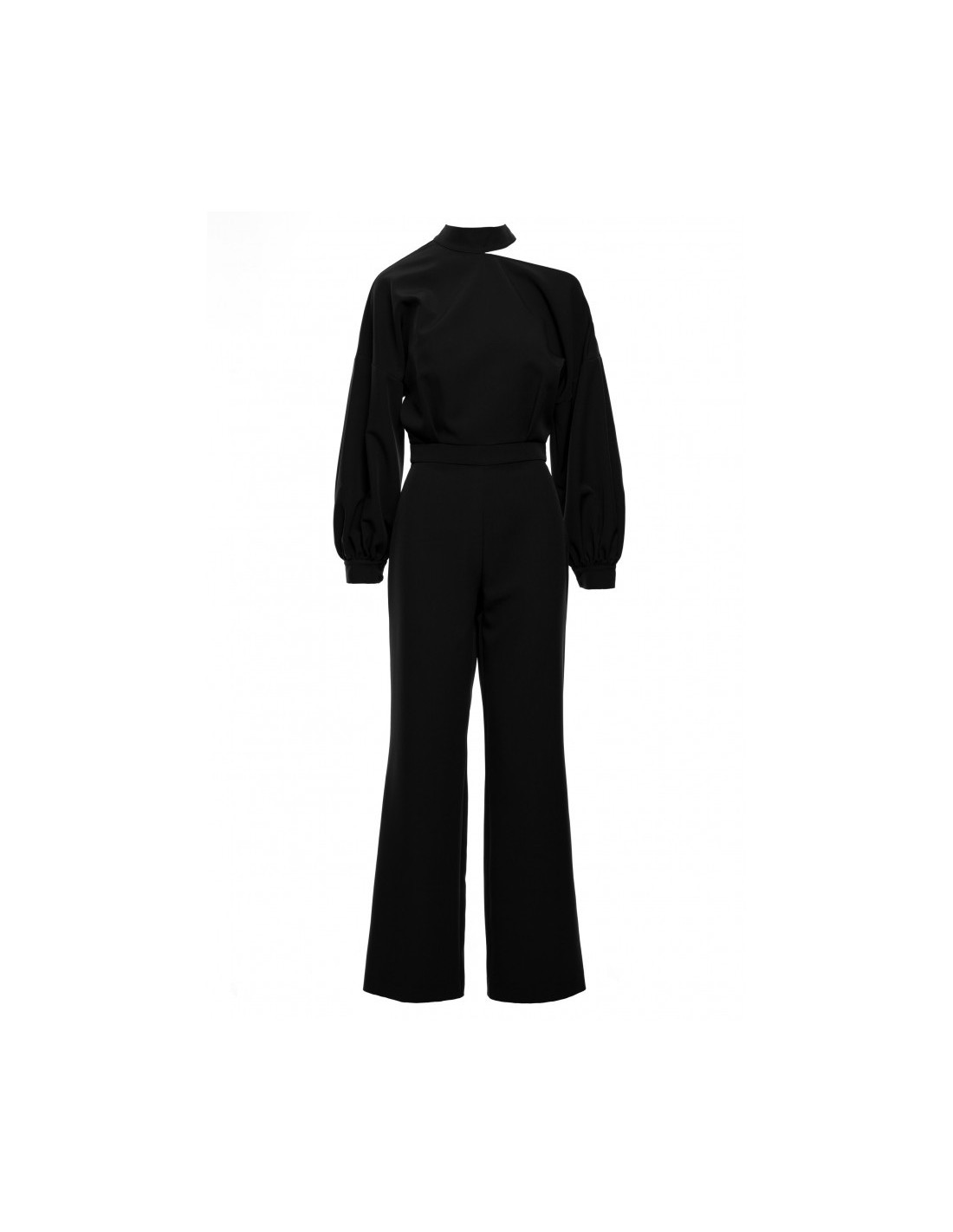 Šis unikalus kombinezonas yra rafinuotas kūrinys didelėms išvykoms. Jis žavi ilgomis bufeto rankovėmis, kurios baigiasi rankogaliais, ir ekstravagantiška iškirpte su viena iškirpte ant peties.