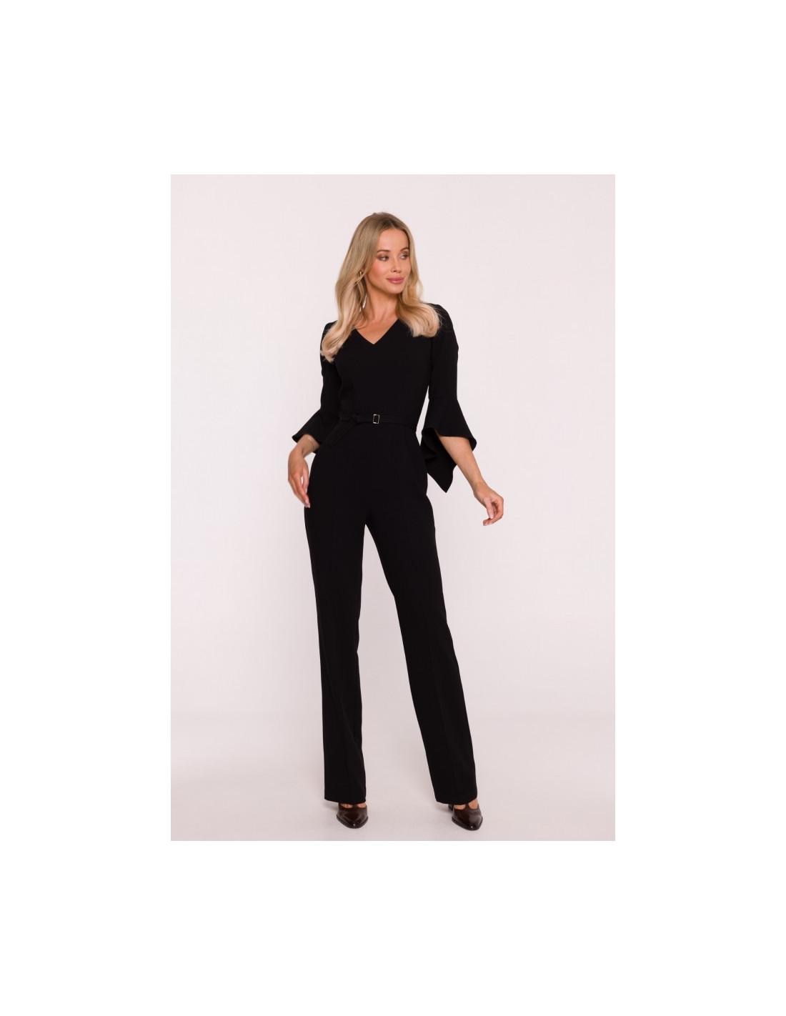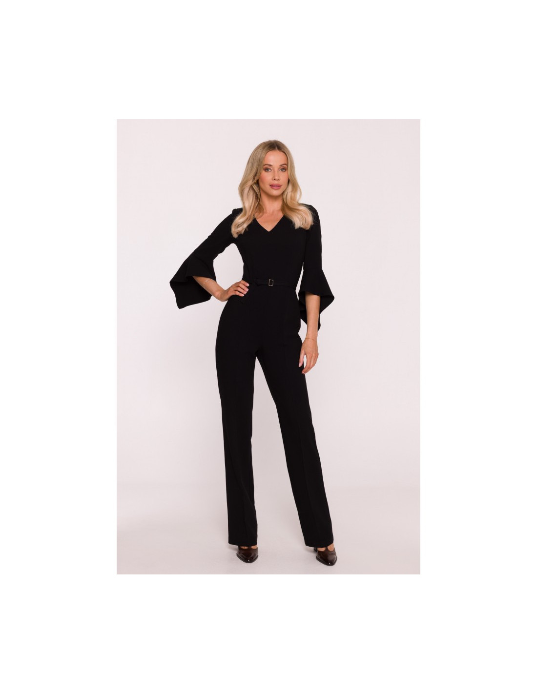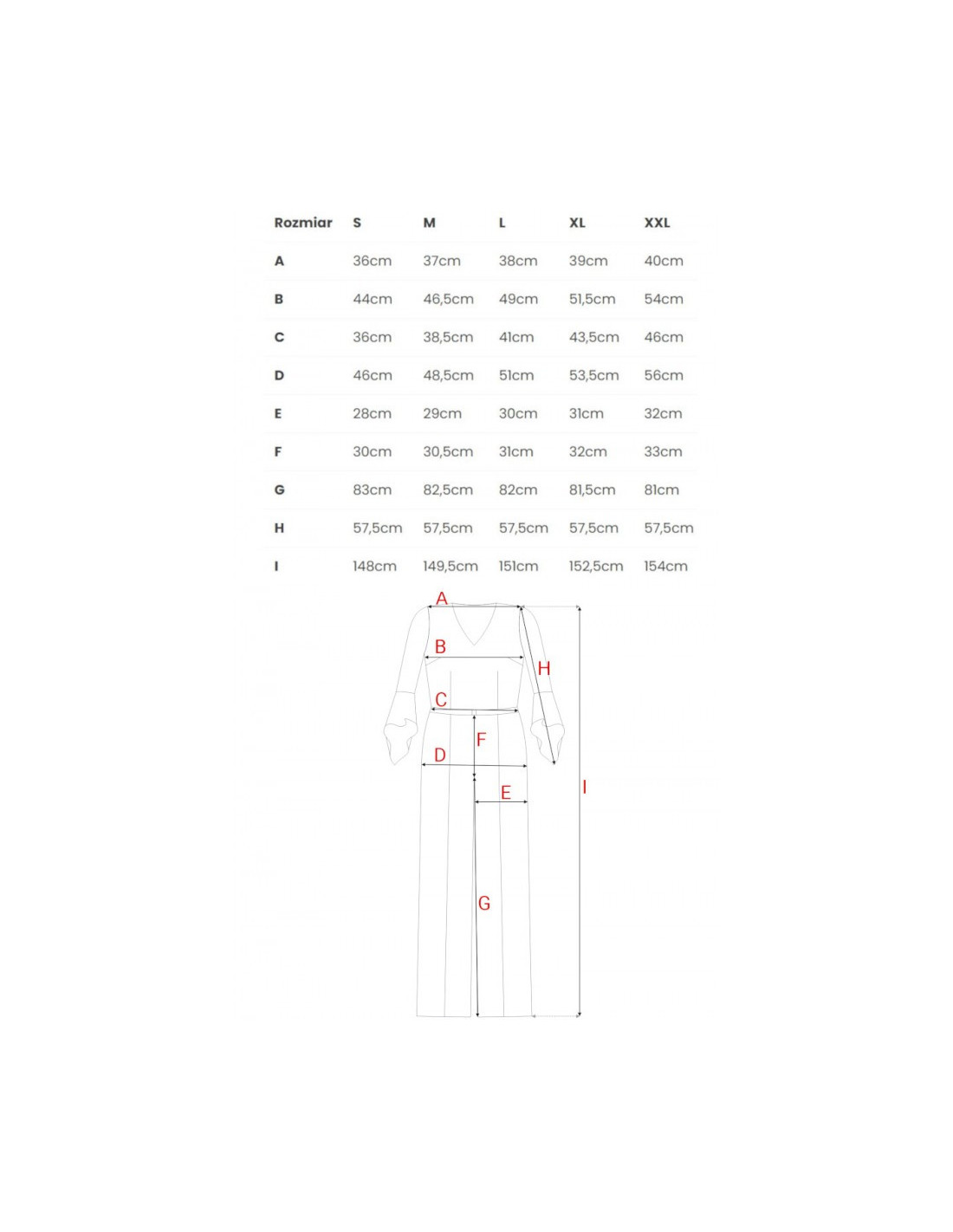 63 % poliesterio 33 % viskozės 4 % elastano MATERIALAS Medžiaga: lygus minkštas audinys INFORMACIJA APIE GAMINĮ Iškirptė: V formos Rankovės: 7/8 ilgio, su raukiniais Kojinės: tiesios, klostuotos Juosmuo: su diržu ir sagtimi Užsegimas: paslėptas užtrauktukas nugaroje Kišenės: be kišenių Pamušalas: nėra Modelis: S416 Sukurta ir pasiūta Lenkijoje Modelis yra 174 cm ūgio, dėvi S dydžio drabužius MADA IR KIRPIMAS Sukirpimas: moteriškas kombinezonas su dekoratyvinėmis rankovėmis Forma: prigludusi viršutinė dalis, tiesios kojos Ilgis: iki žemės