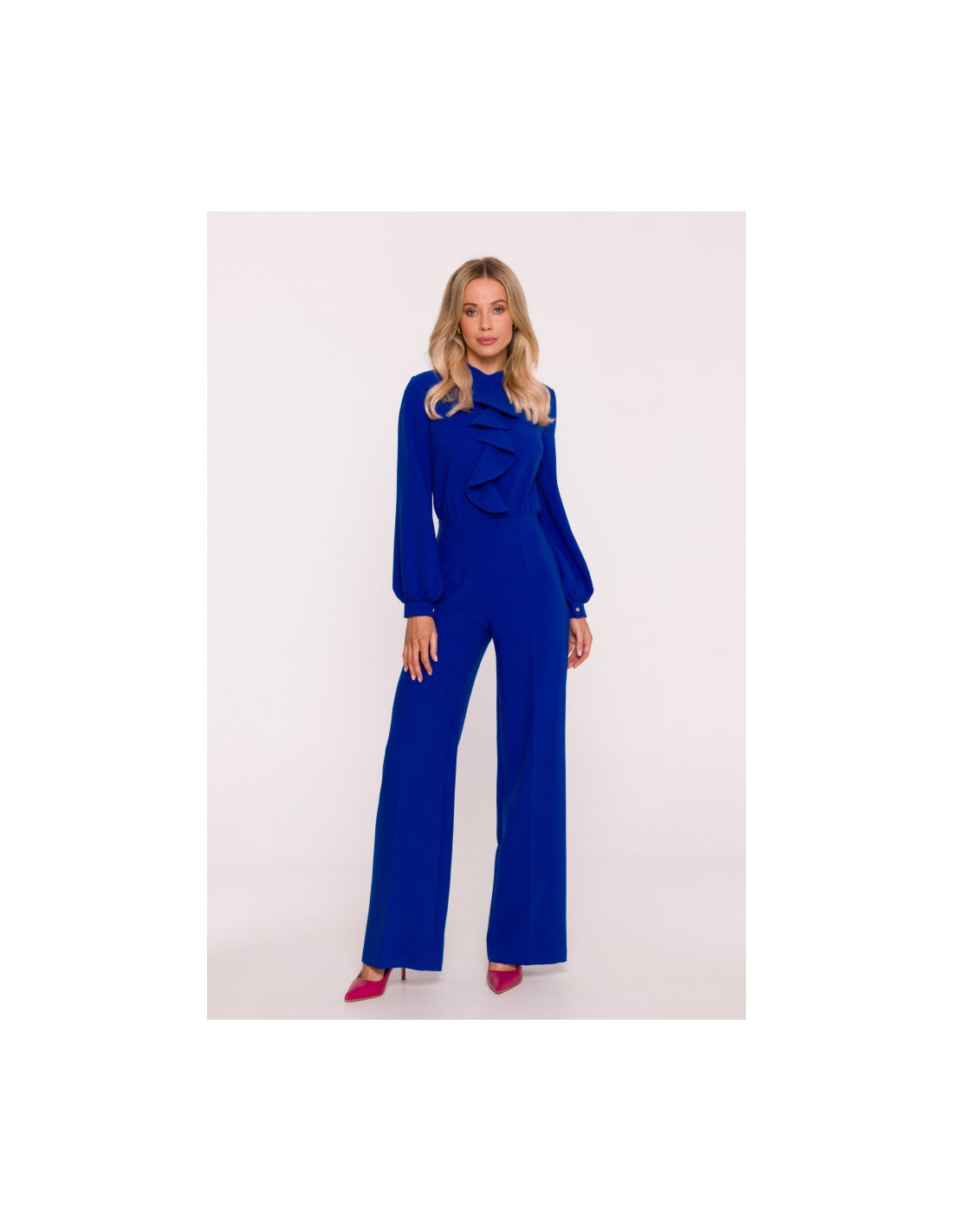 Stylove63 % poliesterio 33 % viskozės 4 % elastano MATERIALAS Medžiaga: lygus minkštas audinys INFORMACIJA APIE GAMINĮ Iškirptė: stovo formos apykaklė, iškirptė Rankovės: ilgos, šiek tiek pūstos, užbaigtos rankogaliais, užsegamais dekoratyvinėmis sagomis Kojinės: tiesios, ilgos, klostuotos Liemuo: paryškintas Užsegimas: paslėptas užtrauktukas nugaroje Modelis: S420 Sukurta ir siūta Lenkijoje Modelis yra 174 cm ūgio, dėvi S dydžio drabužius MADA IR KIRPIMAS Kirpimas: klasikinis vientisas kostiumas Forma: prigludusi viršutinė dalis su švarku, laisvesnės kojos Ilgis: iki žemės