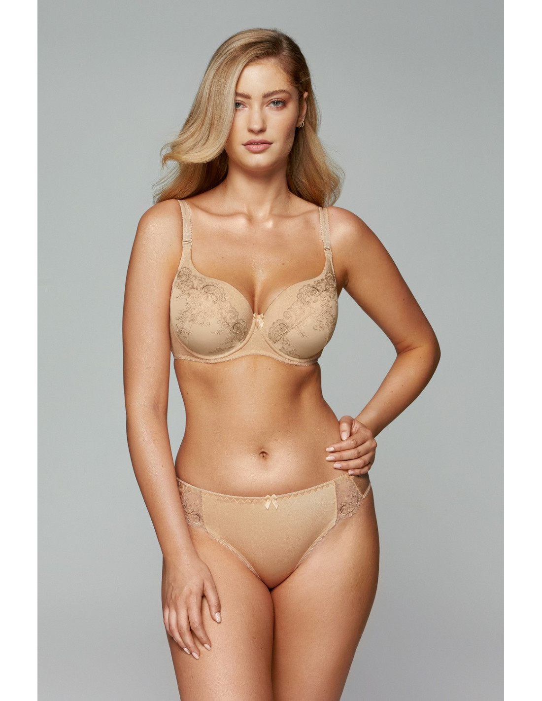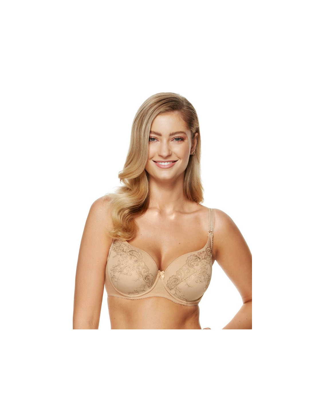 Moteriška liemenėlė - su paminkštintais mikropluošto kaušeliais - taurės dekoruotos gražiu gėlių siuvinėjimu ant tiulio tinklelio - šonai sutvirtinti vertikaliais banginio kauliukais - nuimamos petnešėlės - idealiai tinka didesnę ir pilnesnę krūtinę turinčioms moterims