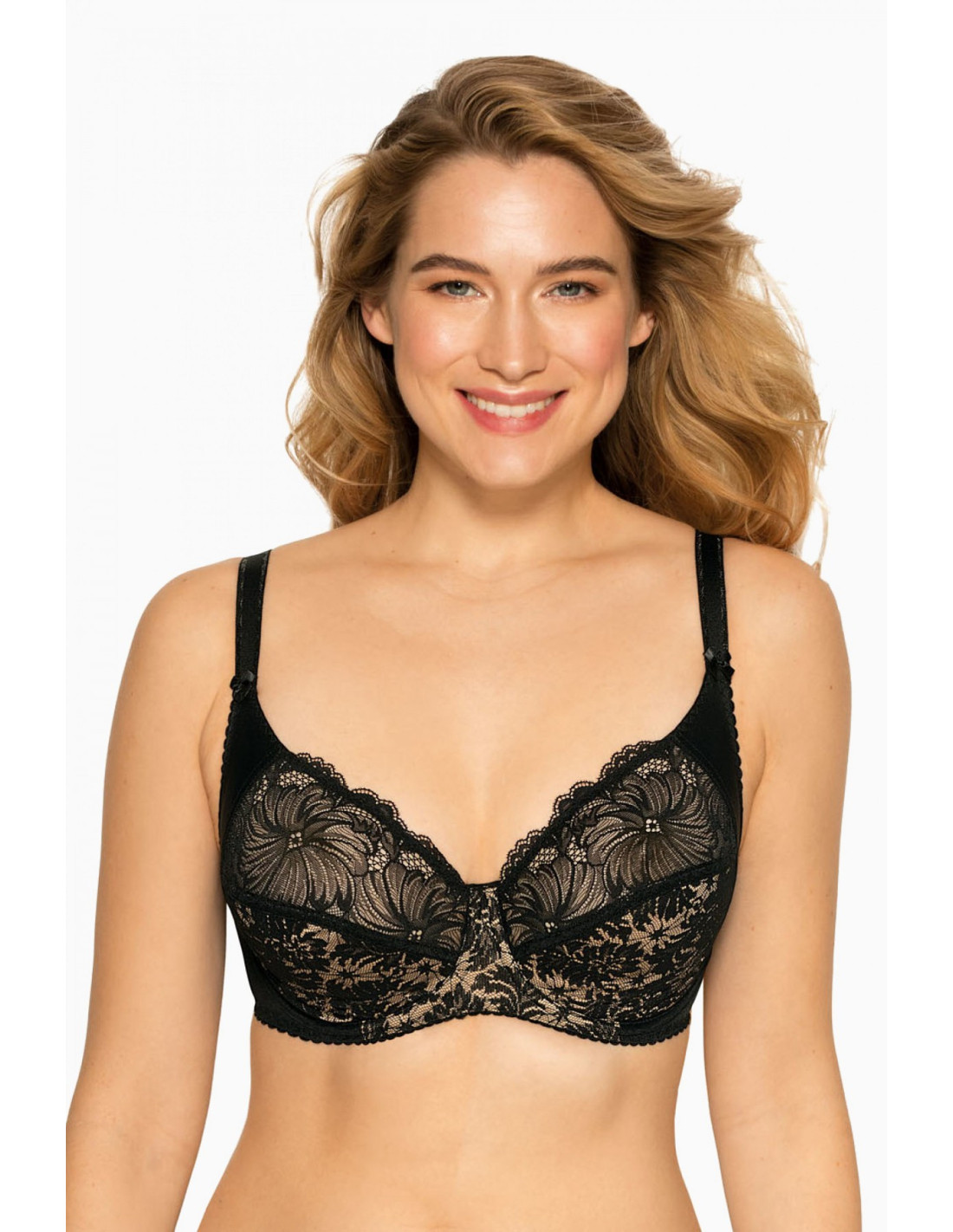 Minkšta liemenėlė su petnešėlėmis - nėrinių su gėlių motyvais kaušeliai - iki pusės pamušalu iš smėlio spalvos trikotažo - petnešėlės nenuimamos, reguliuojamos - lygus apvadas - sMX1 konstrukcija