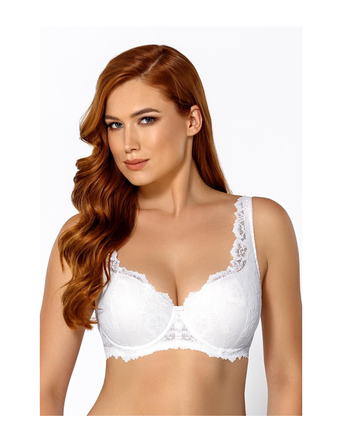 Paminkštinta liemenėlė su petnešėlėmis - pagaminta iš gėlėtų nėrinių - vidinė kaušelio pusė išklota medvilne - šonai iš nėrinių - dekoratyvinės, reguliuojamos petnešėlės, nenuimamos - modelis puikiai pakelia ir palaiko krūtinę