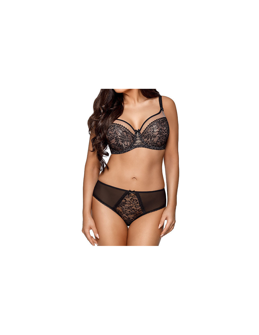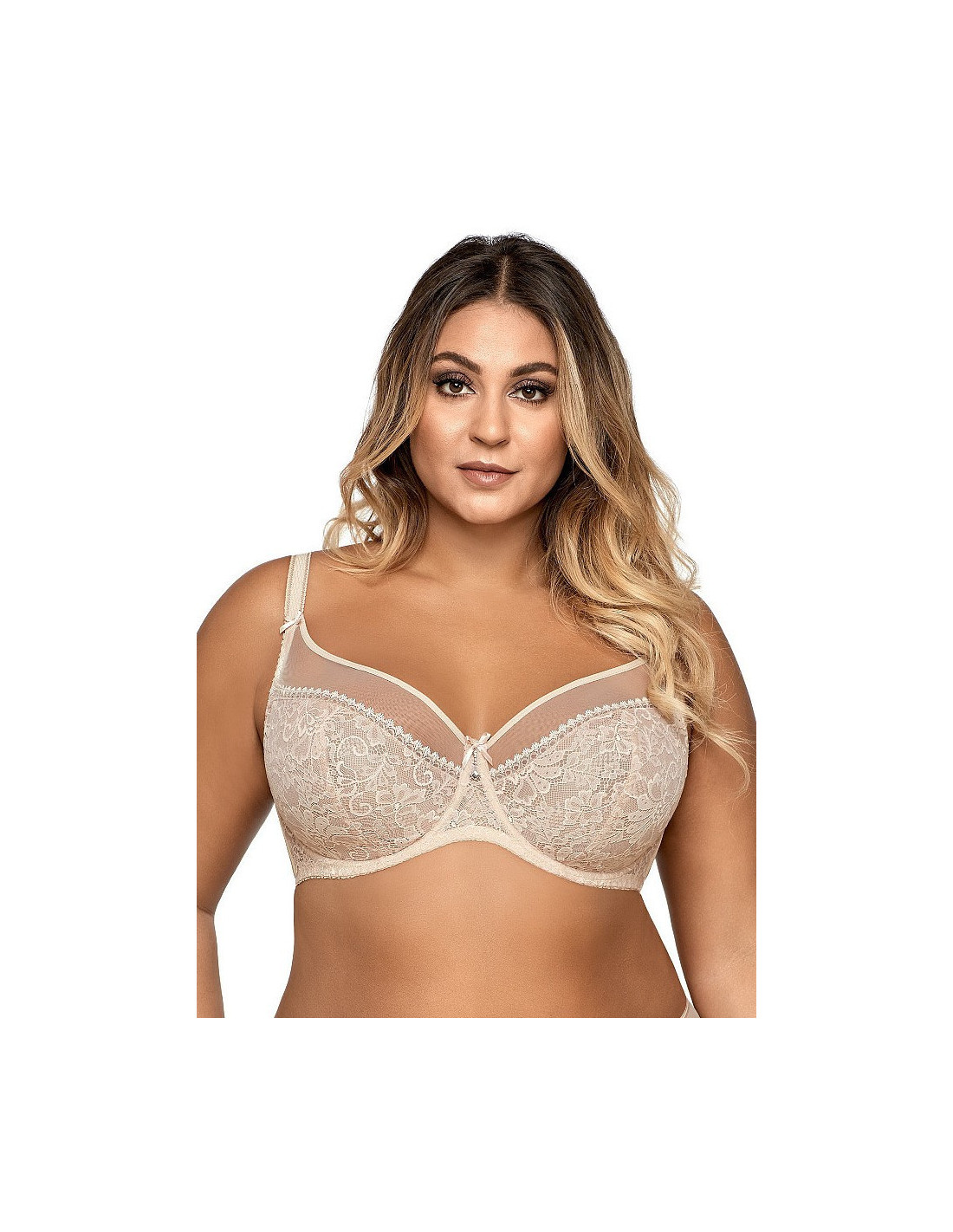 Minkšta liemenėlė su petnešėlėmis - siuvinėjimu dekoruoti tinklelio kaušeliai - iš vidaus pamušalu iš audinio - atlasiniai lankai ant kaušelių ir petnešėlių jungties - petnešėlės nenuimamos, reguliuojamos - tinklinė apyrankė su šoniniais banginiais