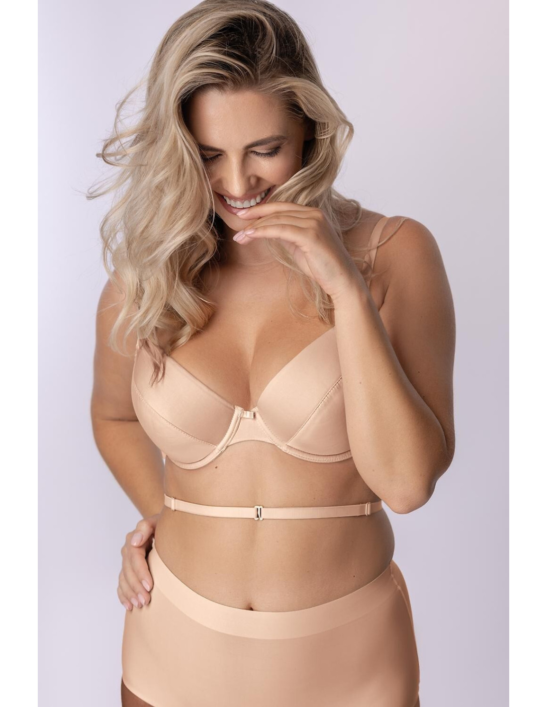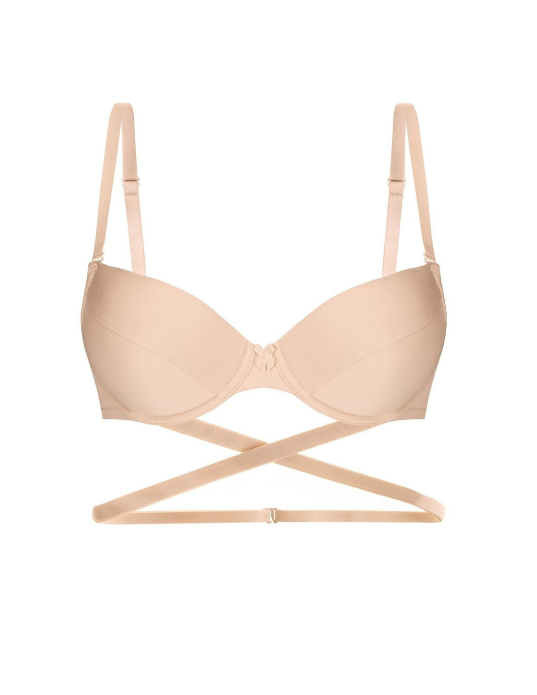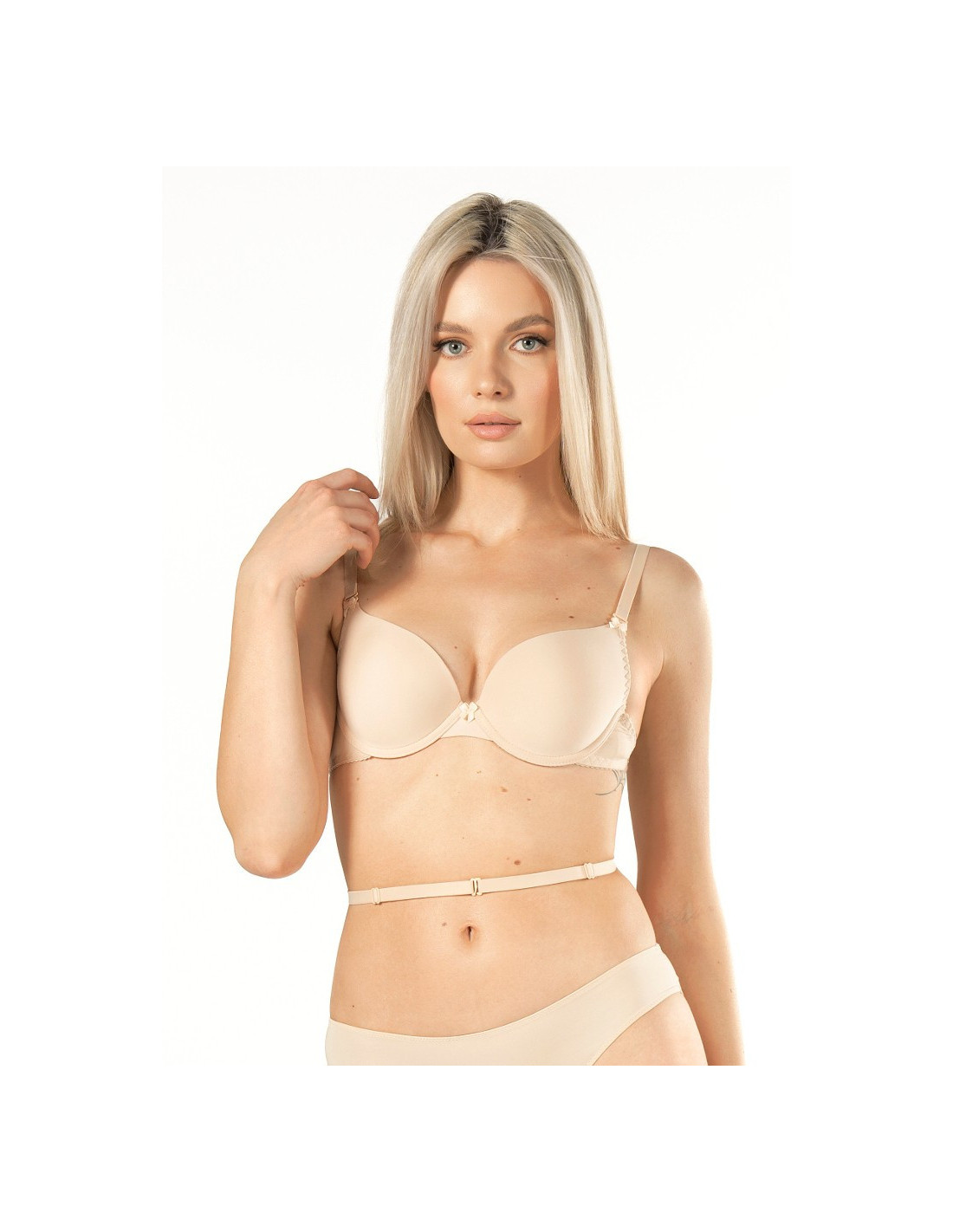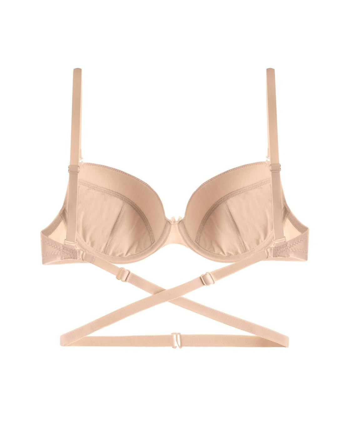 Push-up liemenėlė - lygūs mikropluošto kaušeliai su įstrižais pjūviais - petnešėlės, nuimamos, reguliuojamos - sukryžiuotos nugaroje, užsegamos ties pilvu - idealiai tinka suknelėms su atvira nugara
