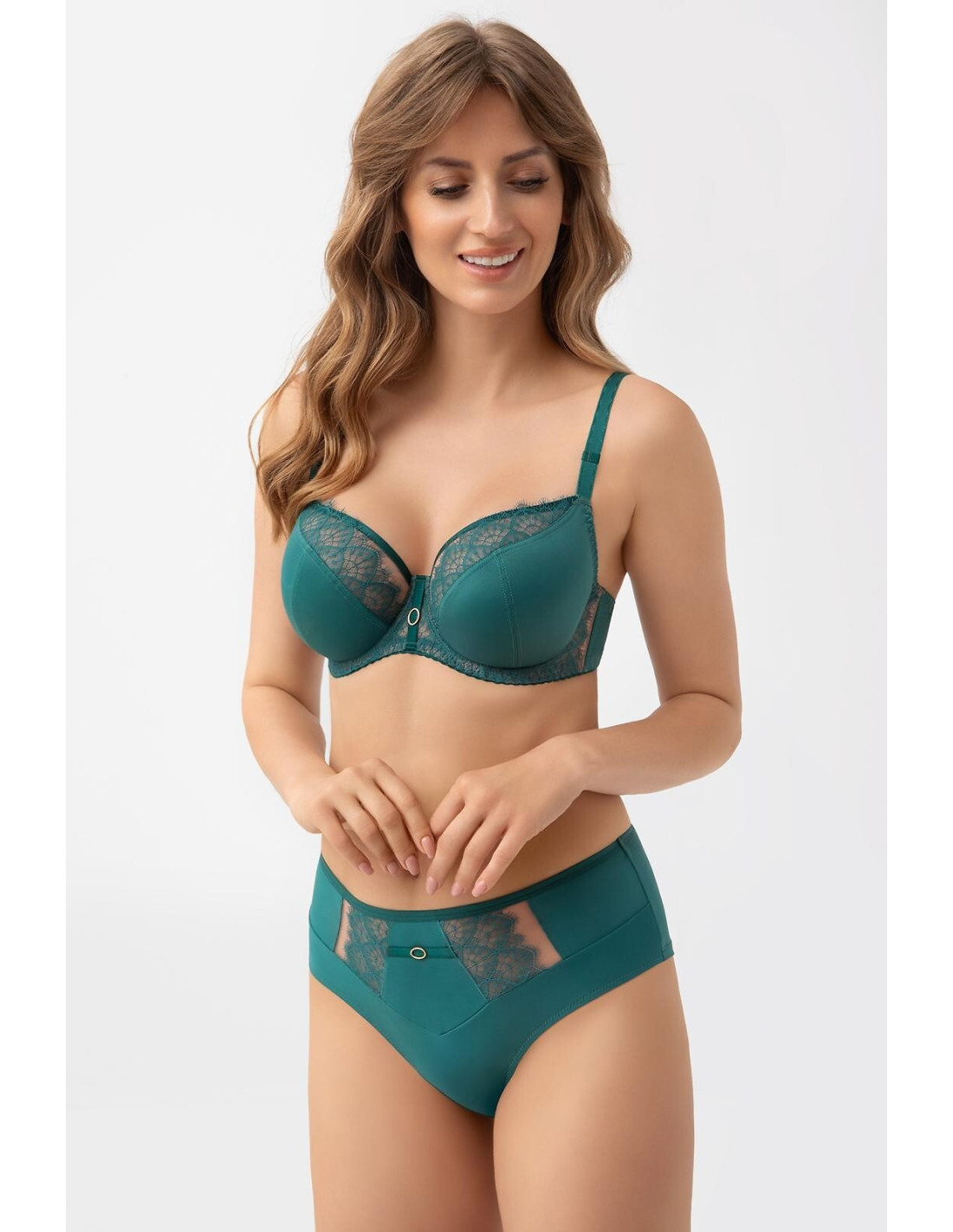 Biustonosz miękki przeznaczony dla kobiet ze średnim, dużym oraz bardzo dużym biustem - užtikrina efektą bardzo mocnego uniesienia i zebrania biustu do środka - 3-częściowe miski w całości wykonane z kryjącej dzianiny tipo simplex bei koronki na stabilnym tiulu - górna krawędź miski wykończona połyskującą taśmą, płynnie przechodzi do ramiączka powodując lepsze podtrzymanie biustu - tył z kryjącej lycry zapewniającej bardzo dobre dopasowanie i podtrzymanie - fiszbiny boczne zapobiegające zwijaniu się materiału - w zależności od rozmiaru dwu lub trzyrzędowa haftka z trójstopniową regulacją obwodu - odpinane ozdobne paski z możliwością regula - nieodpinane, regulowane ramiączka w trzech szerokościach - metalowe elementai w kolorze złota - konstrukcija: K 101